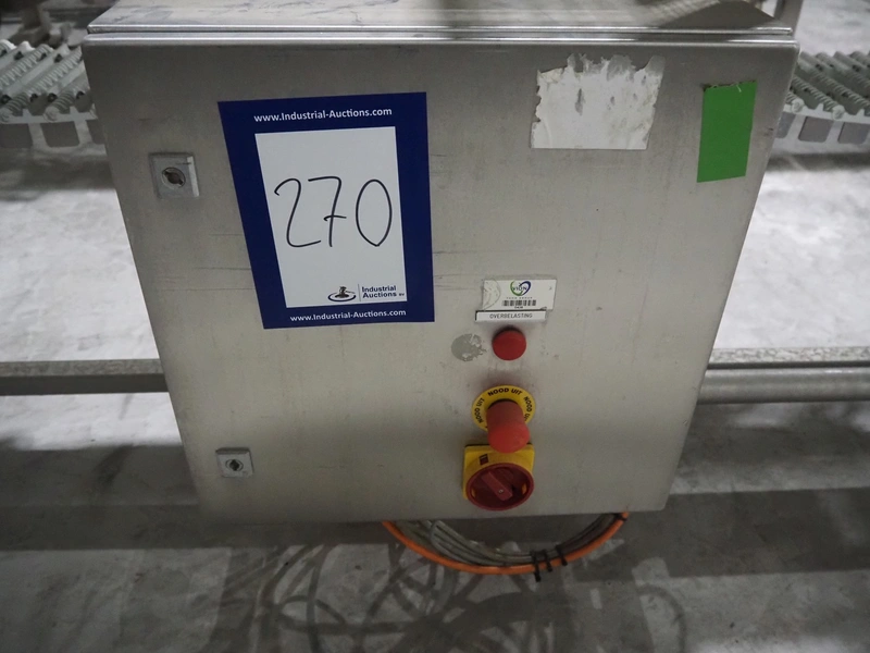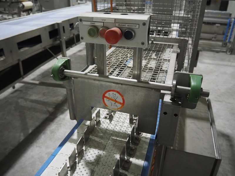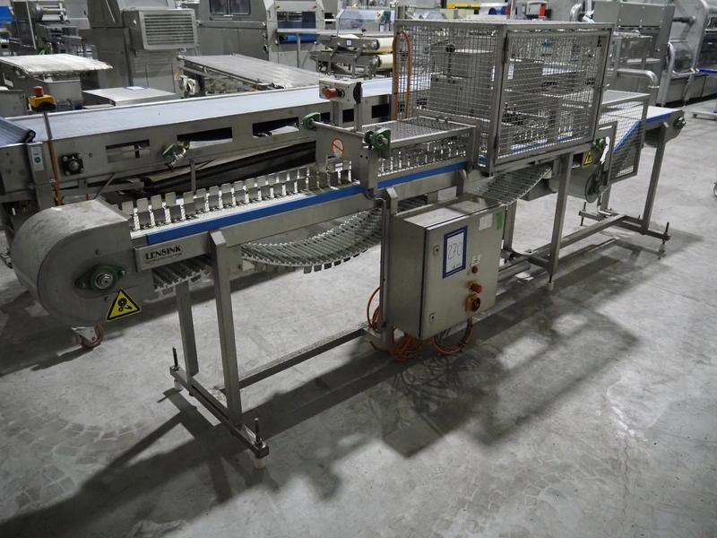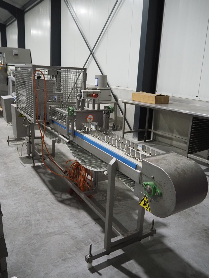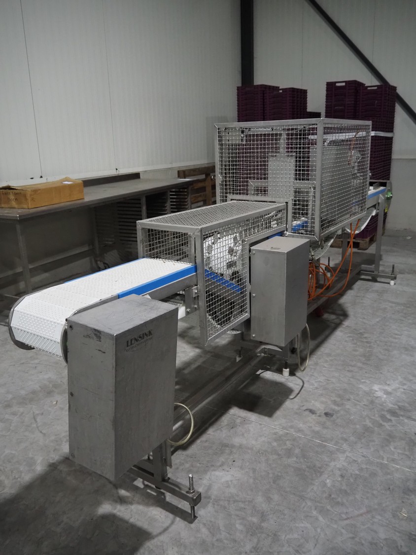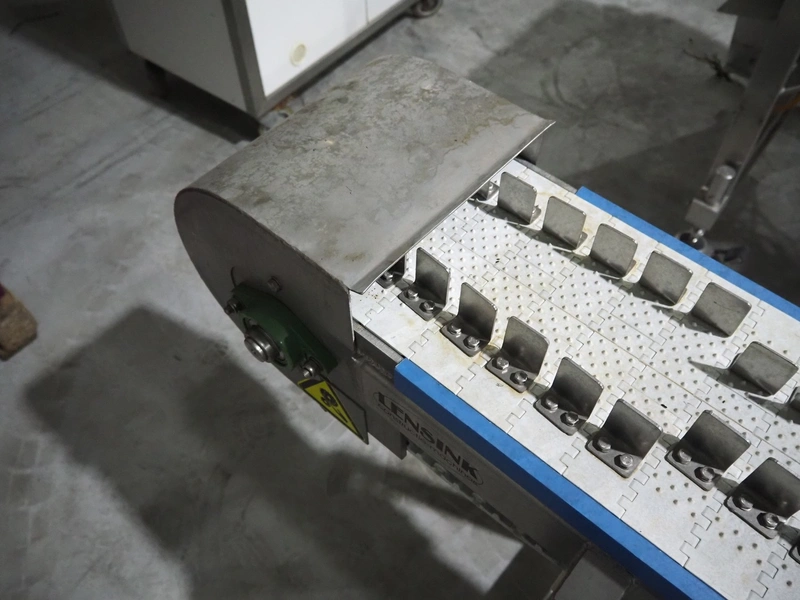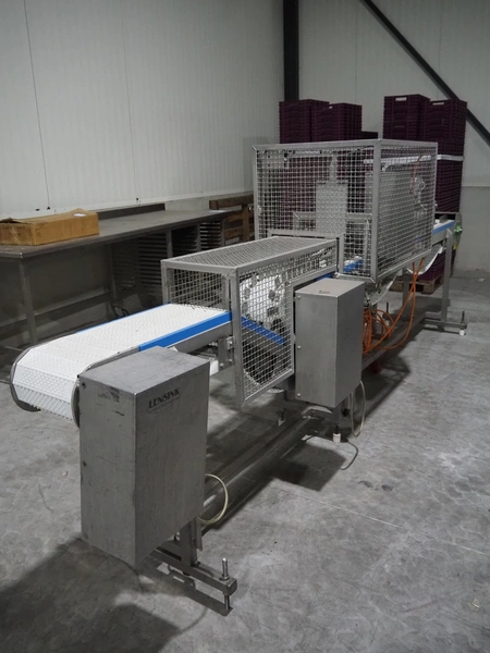 Lensink fish slicing line, plastic belt, belt width: 250 mm, dimensions: 4300 mm x 1000 mm x 1600 mm.