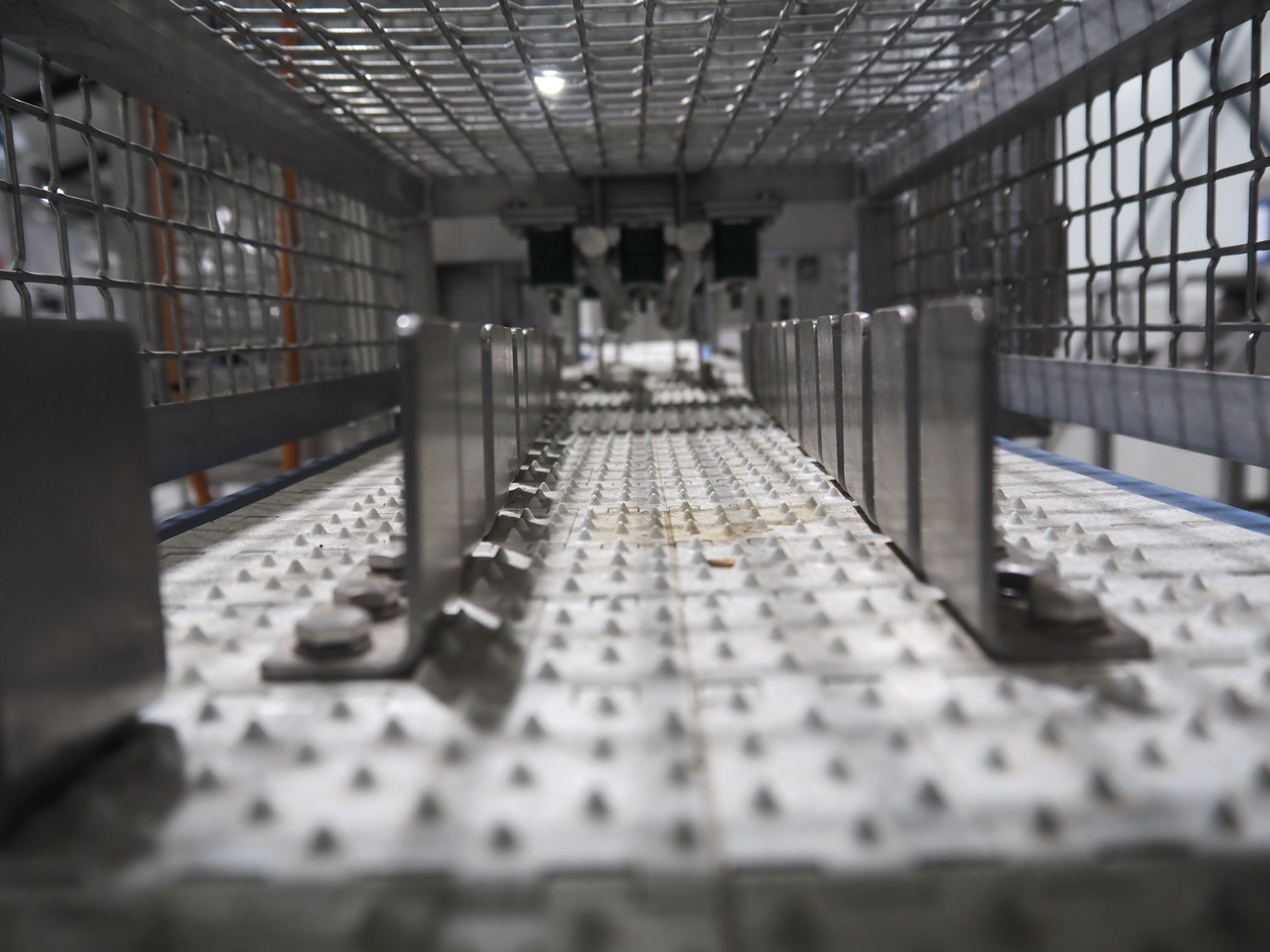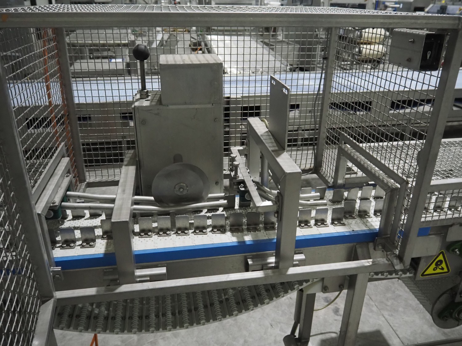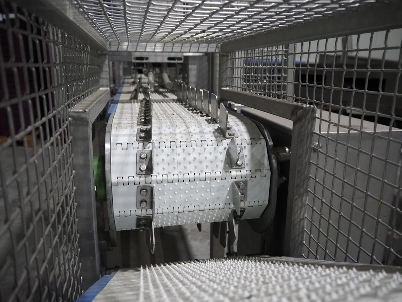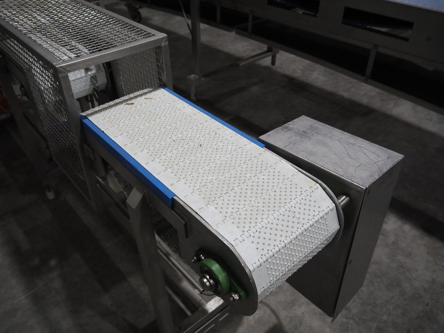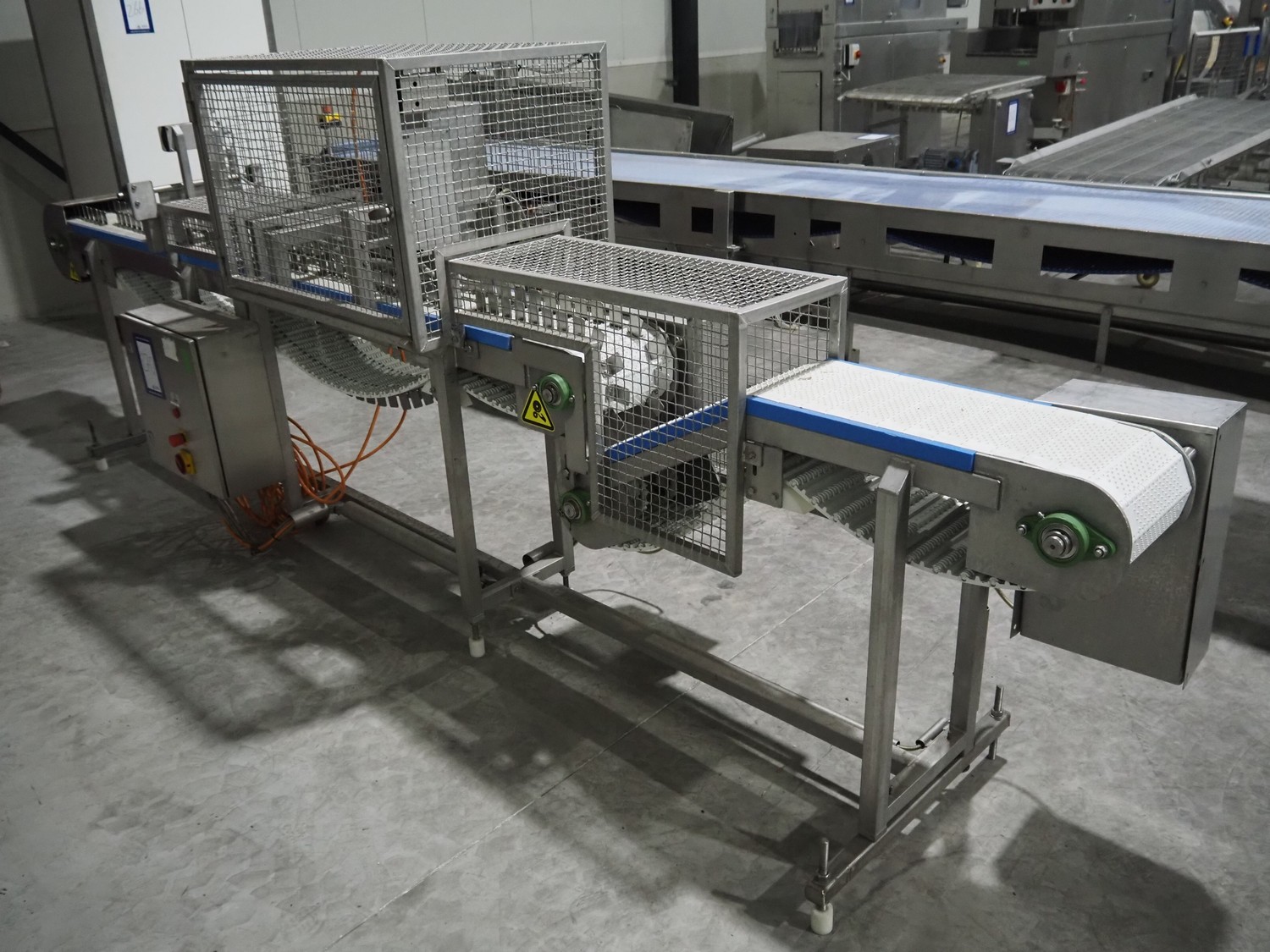 Lensink fish slicing line, plastic belt, belt width: 250 mm, dimensions: 4300 mm x 1000 mm x 1600 mm.