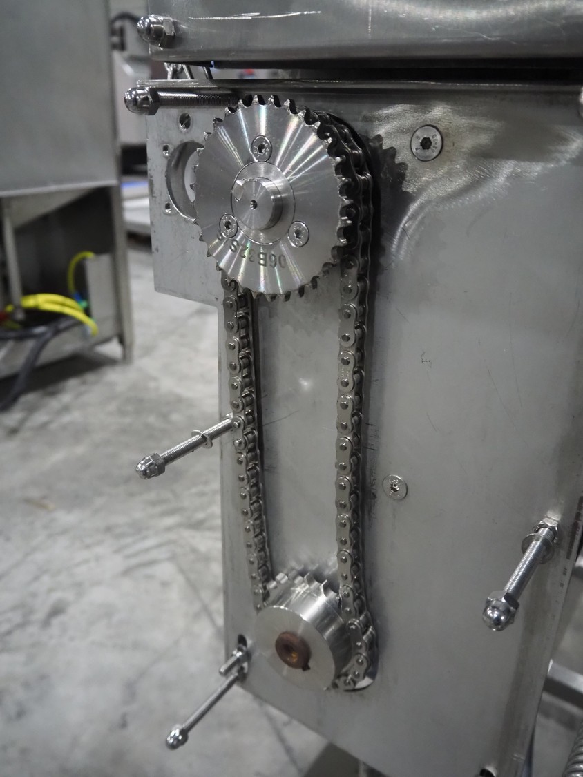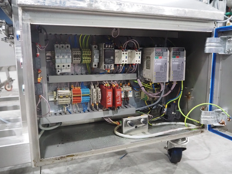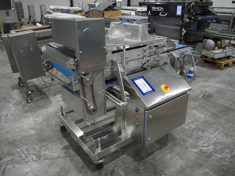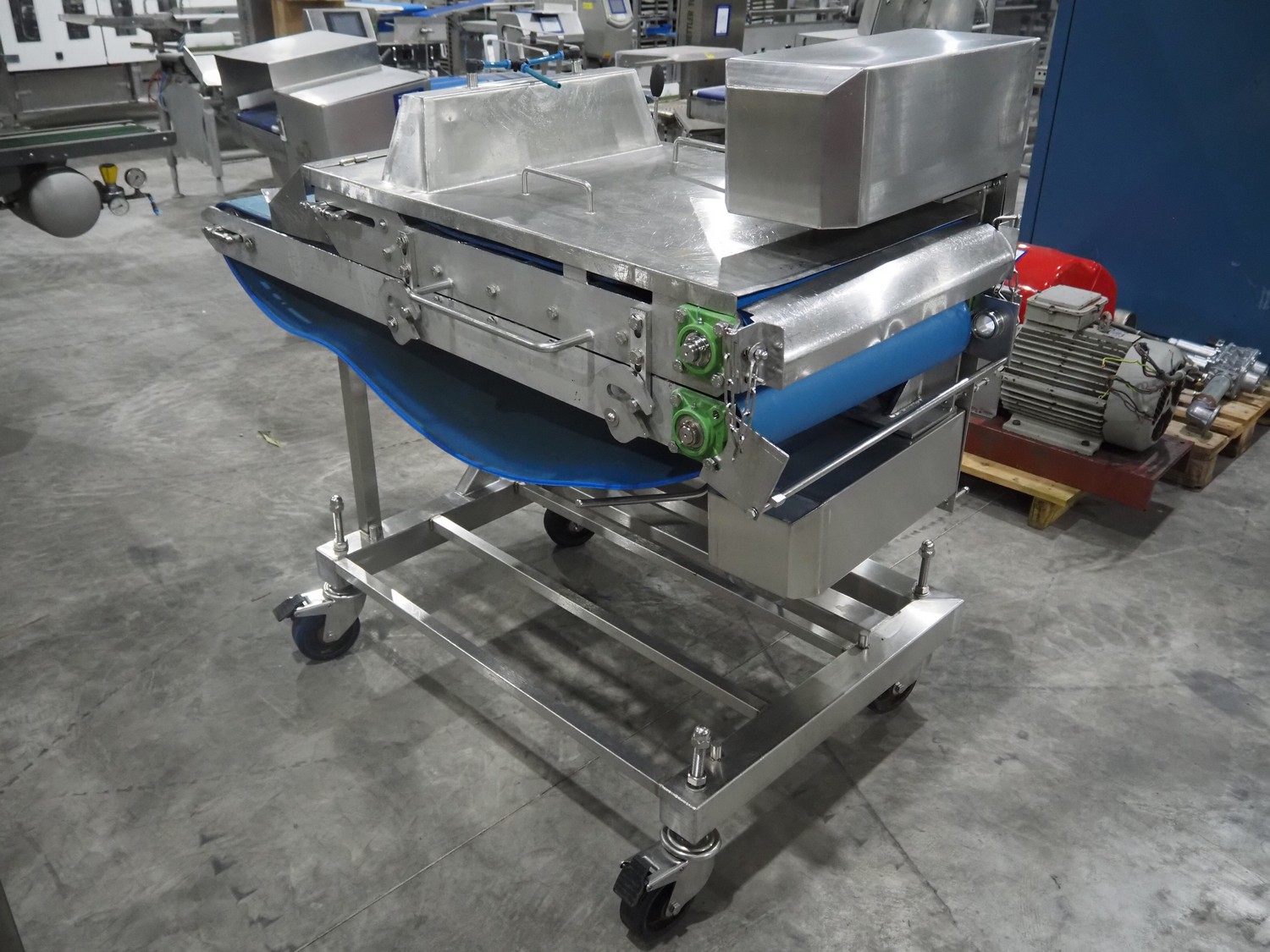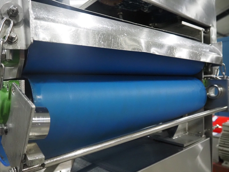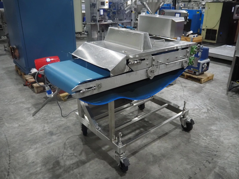 Mobile flattener, plastic belt, belt width: (2x) 600 mm, clearance: 600 mm x 40 mm, total dimensions: 1850 mm x 1200 mm x 1400 mm.