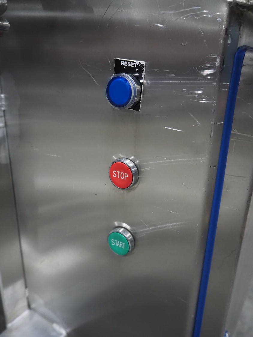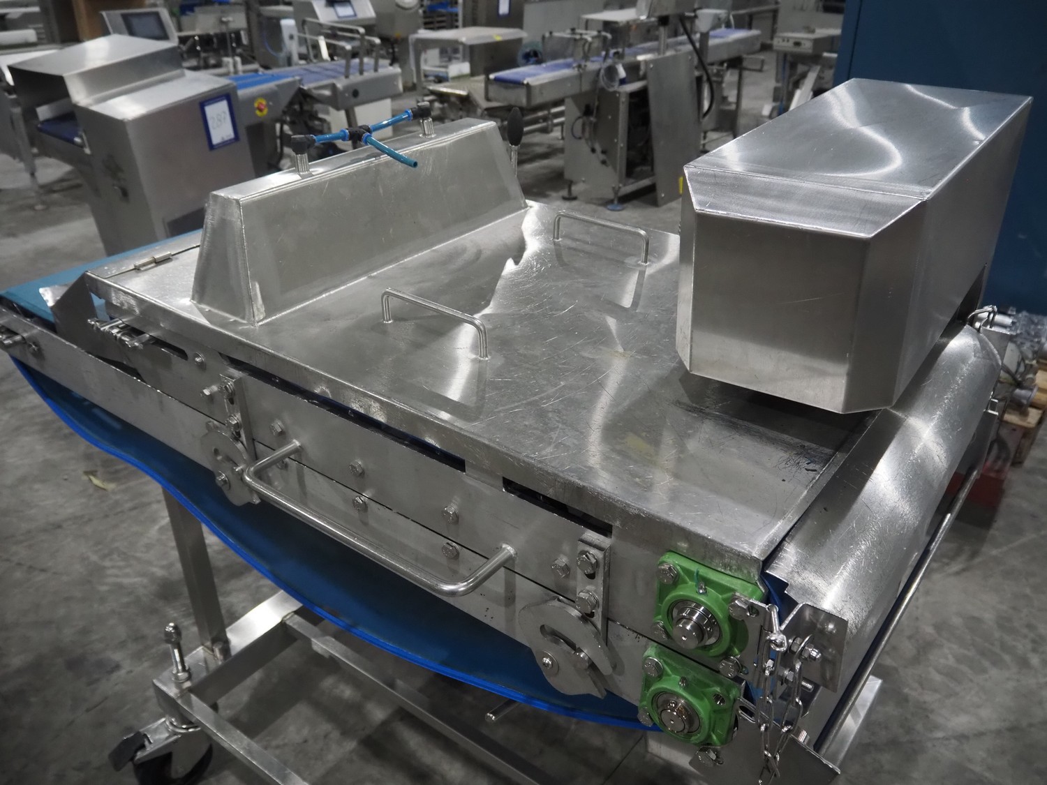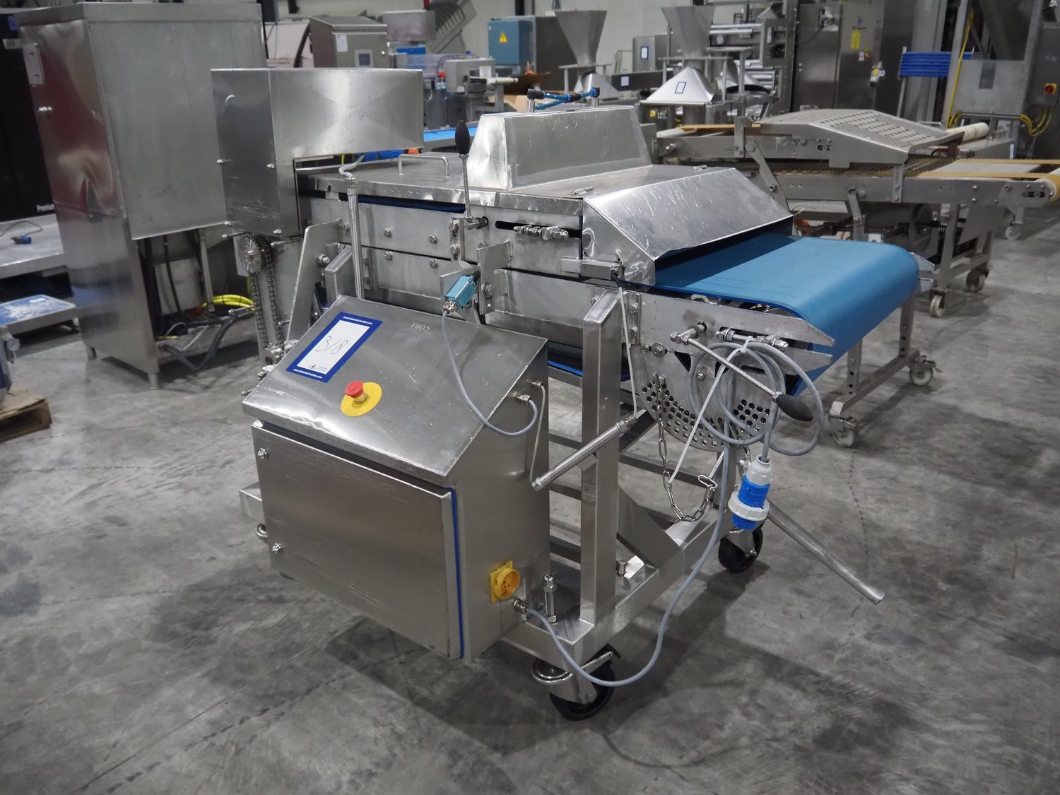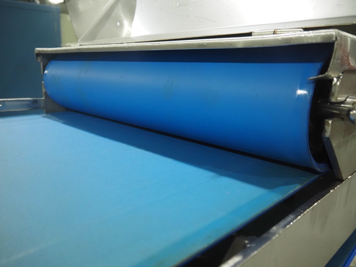 Mobile flattener, plastic belt, belt width: (2x) 600 mm, clearance: 600 mm x 40 mm, total dimensions: 1850 mm x 1200 mm x 1400 mm.