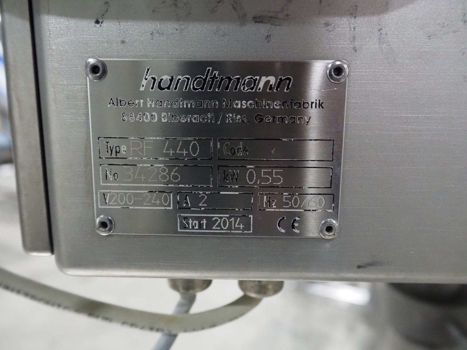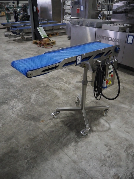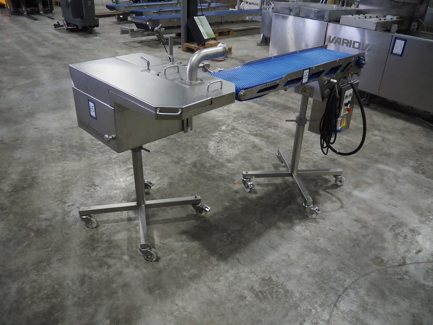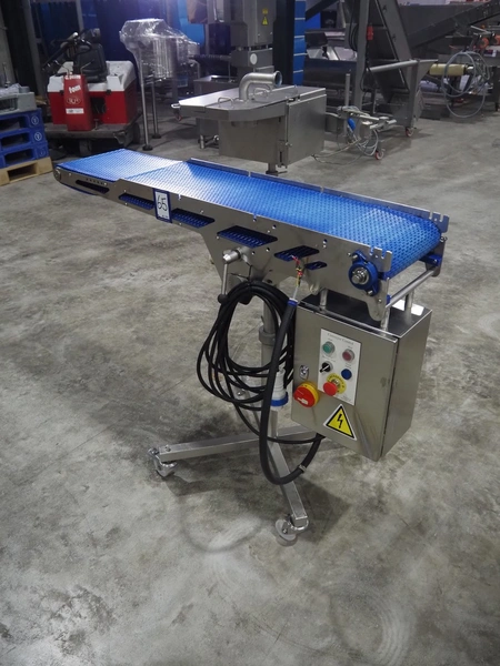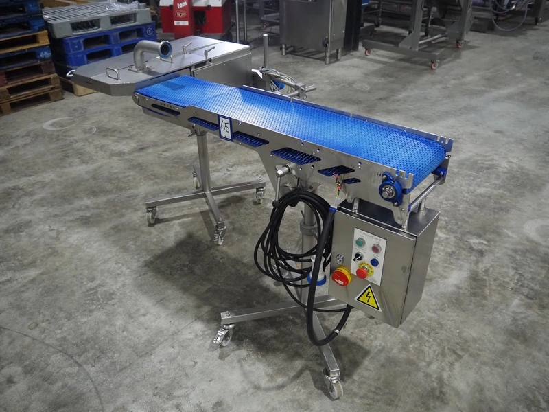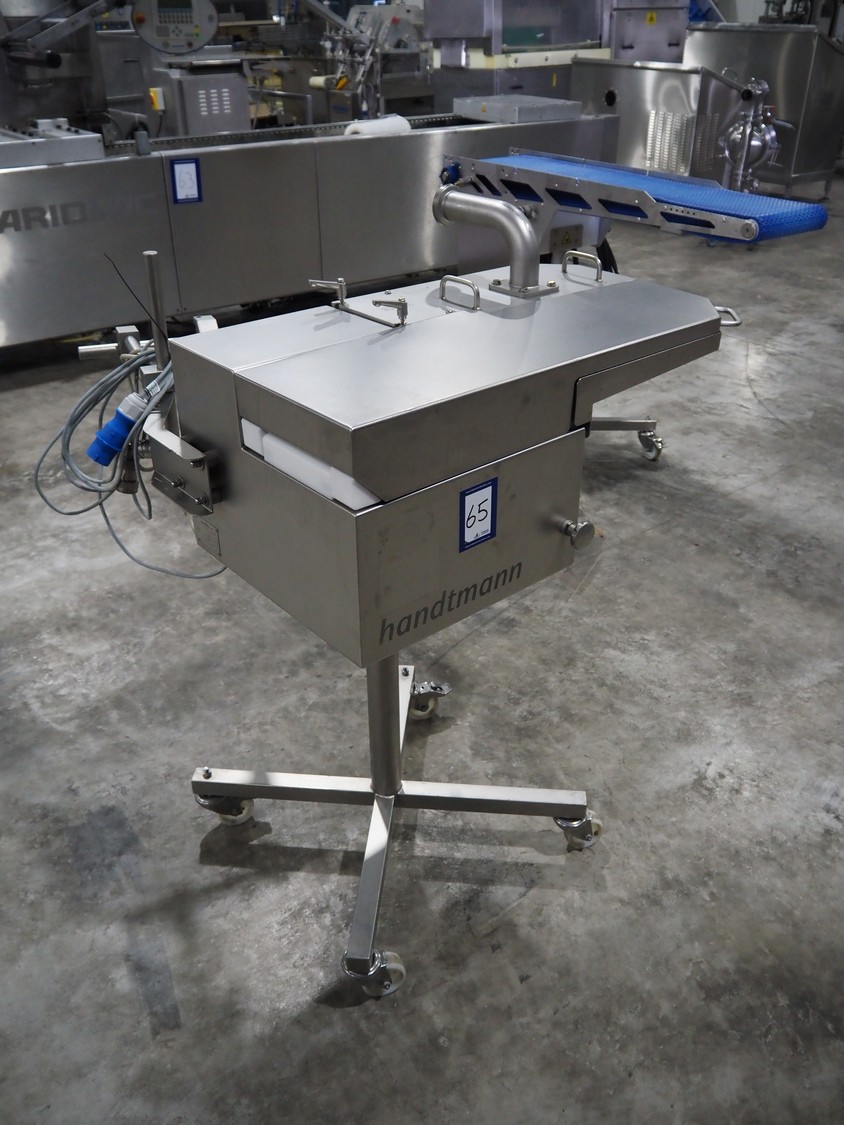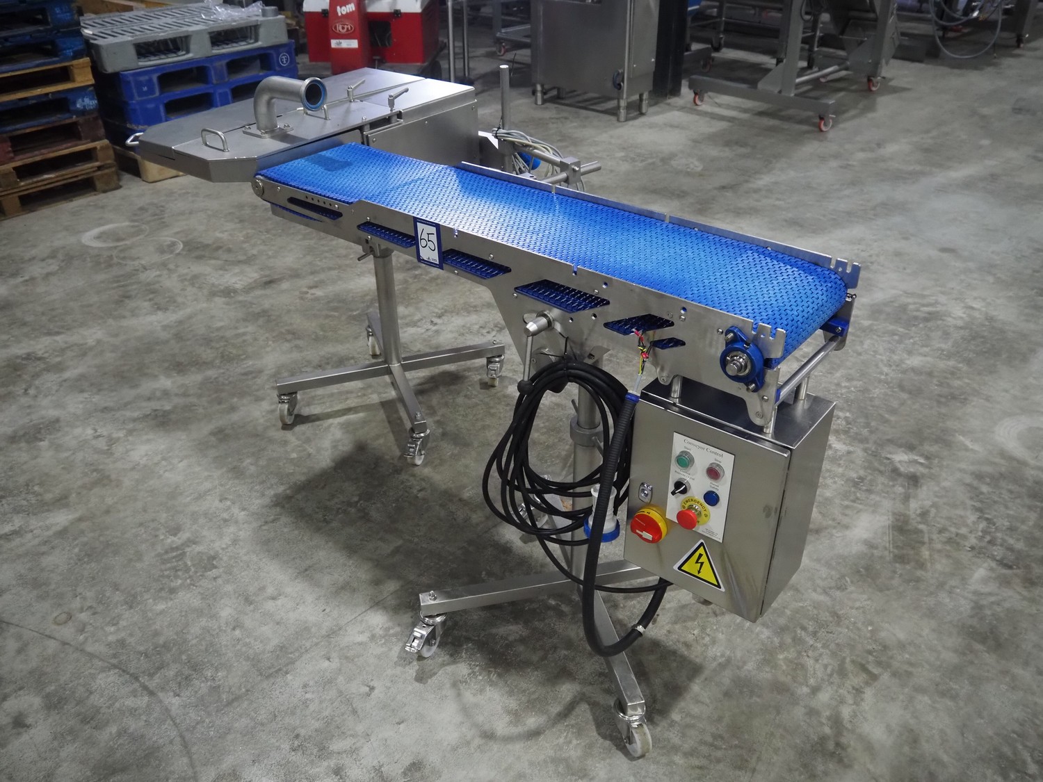 Handtmann mobile forming machine, type forming machine: RF 440, serial number: 34286, year of construction: 2014, 200/240 V, 50/60 Hz, 0.55 kW, Ø form: 45 mm, total dimensions: 950 mm x 850 mm x 1200 mm. Mobile transport belt, plastic mesh belt, belt width: 300 mm, total dimensions: 1400 mm x 700 mm x 1000 mm.