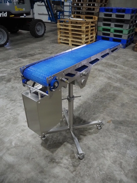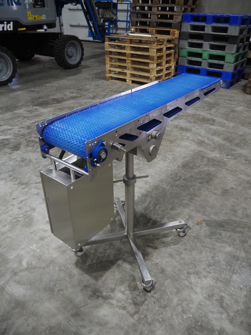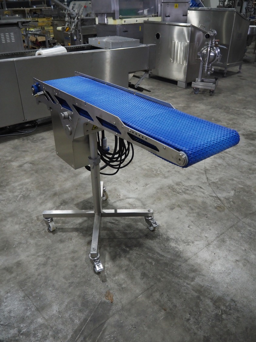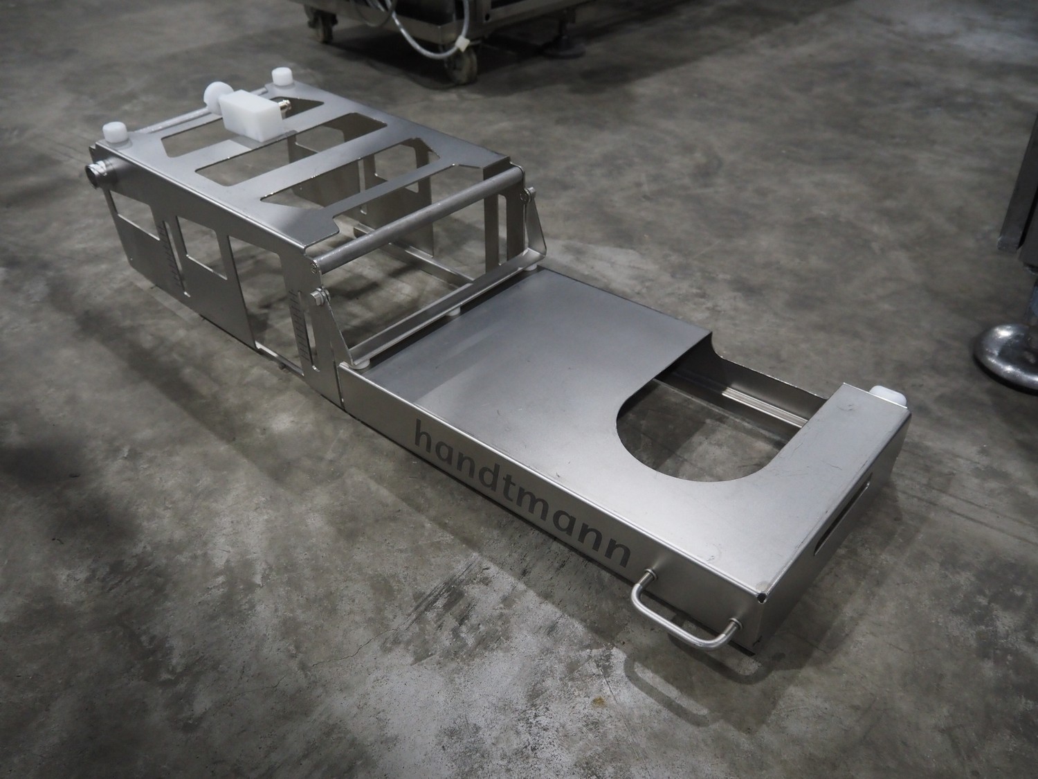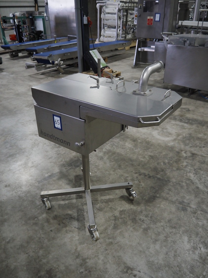 Handtmann mobile forming machine, type forming machine: RF 440, serial number: 34286, year of construction: 2014, 200/240 V, 50/60 Hz, 0.55 kW, Ø form: 45 mm, total dimensions: 950 mm x 850 mm x 1200 mm. Mobile transport belt, plastic mesh belt, belt width: 300 mm, total dimensions: 1400 mm x 700 mm x 1000 mm.