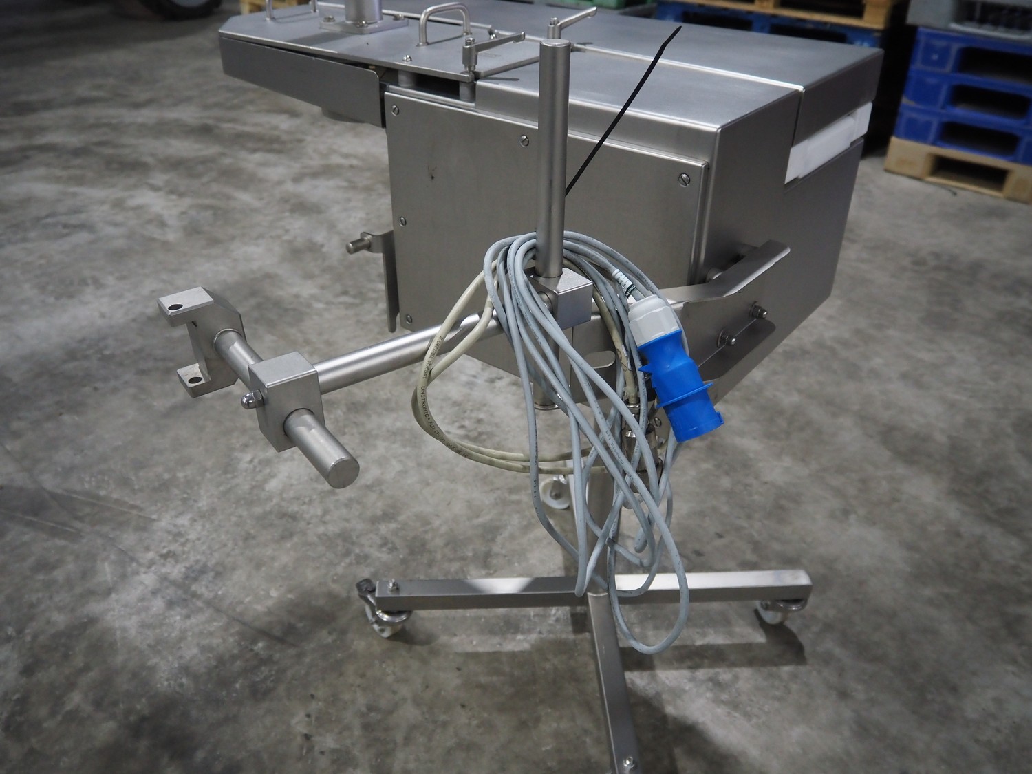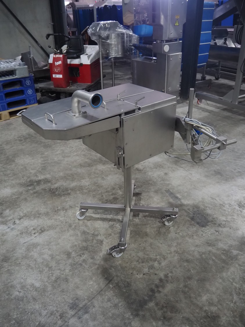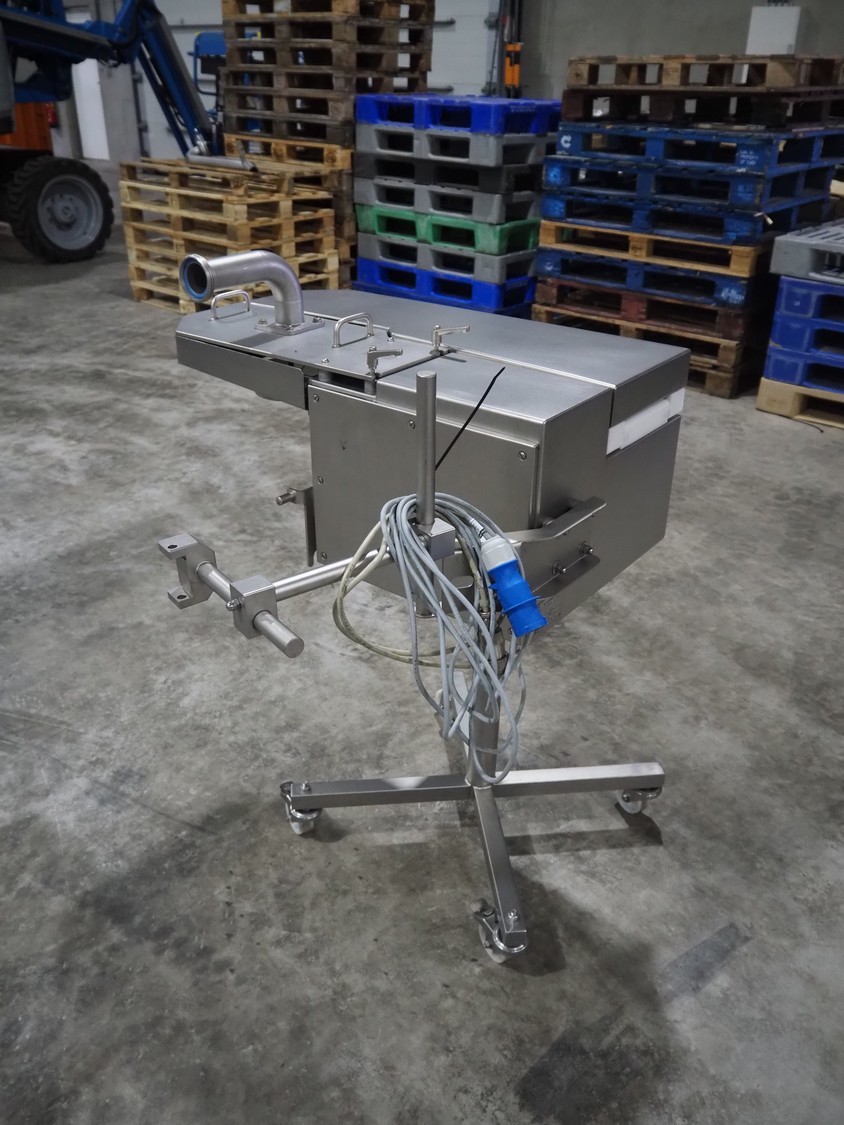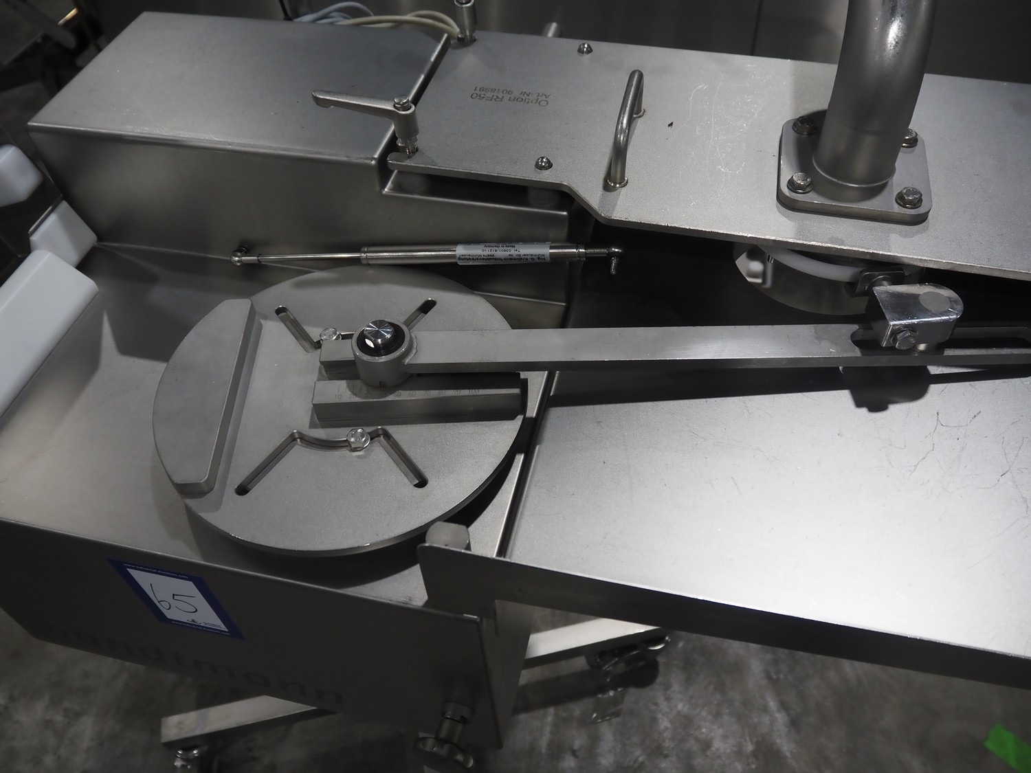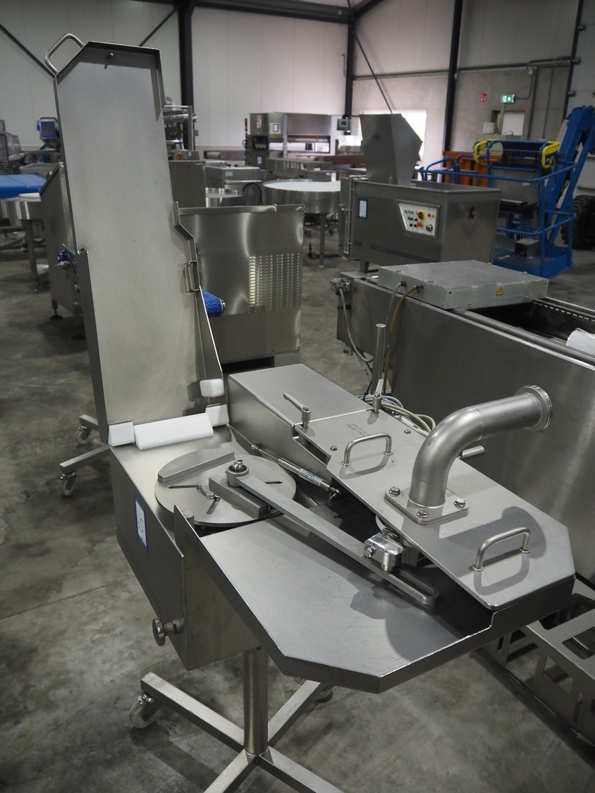 Handtmann mobile forming machine, type forming machine: RF 440, serial number: 34286, year of construction: 2014, 200/240 V, 50/60 Hz, 0.55 kW, Ø form: 45 mm, total dimensions: 950 mm x 850 mm x 1200 mm. Mobile transport belt, plastic mesh belt, belt width: 300 mm, total dimensions: 1400 mm x 700 mm x 1000 mm.