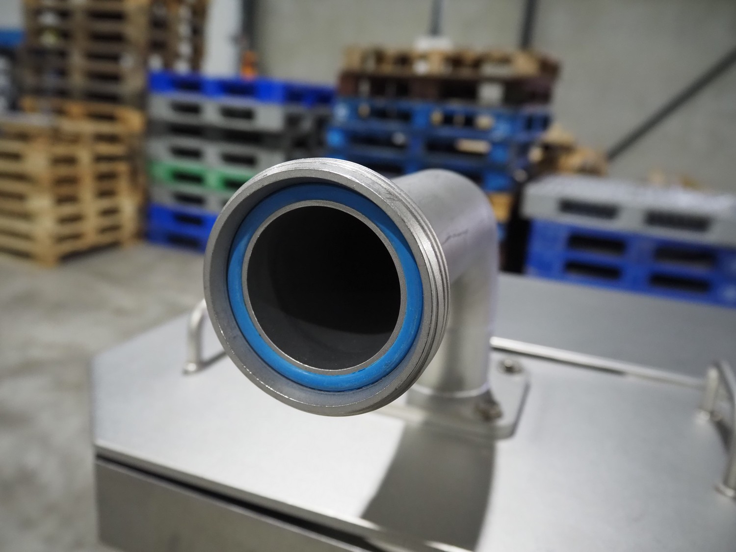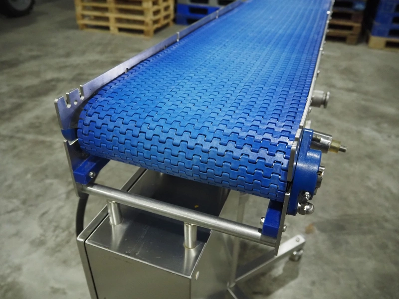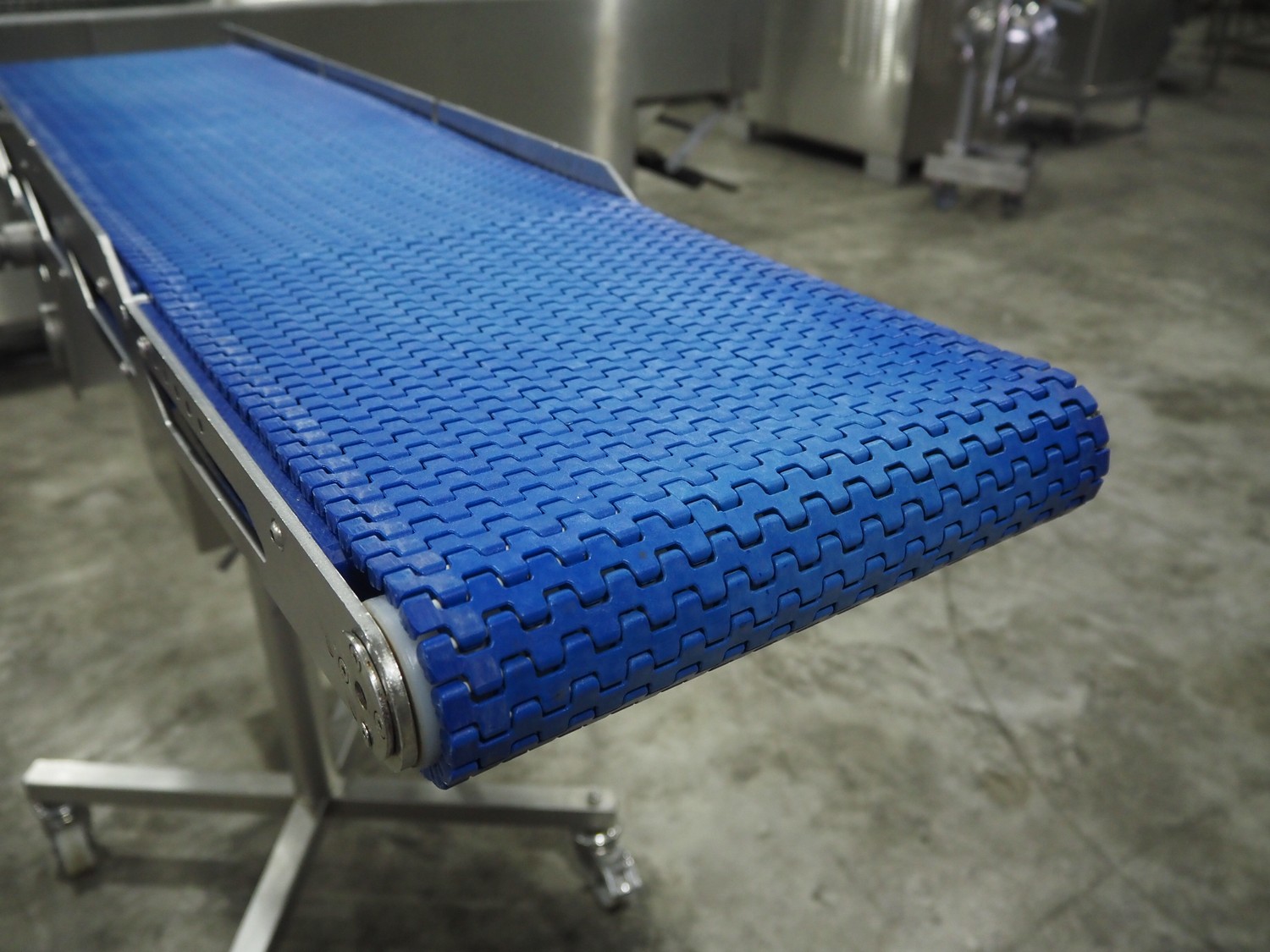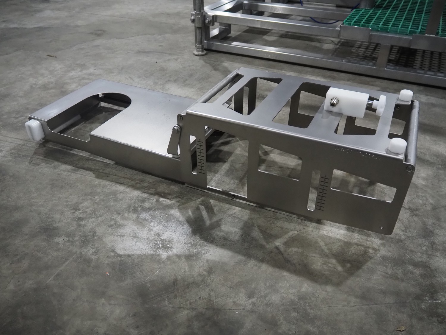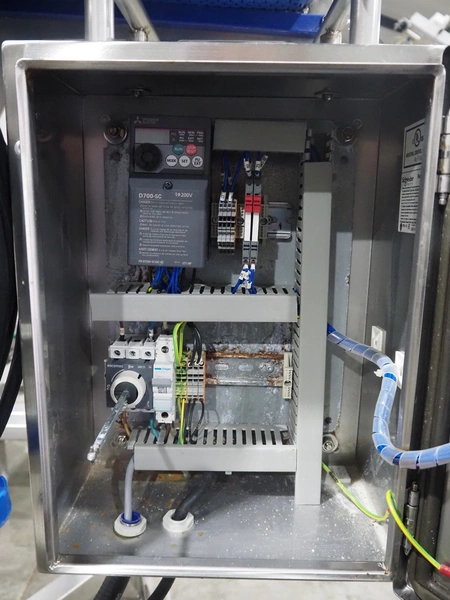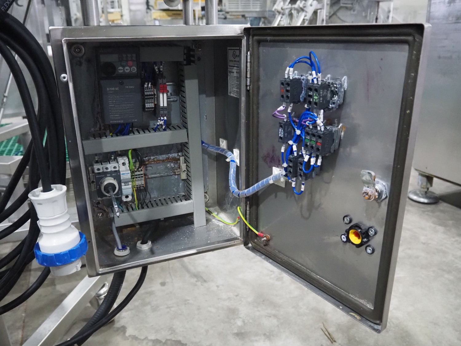 Handtmann mobile forming machine, type forming machine: RF 440, serial number: 34286, year of construction: 2014, 200/240 V, 50/60 Hz, 0.55 kW, Ø form: 45 mm, total dimensions: 950 mm x 850 mm x 1200 mm. Mobile transport belt, plastic mesh belt, belt width: 300 mm, total dimensions: 1400 mm x 700 mm x 1000 mm.