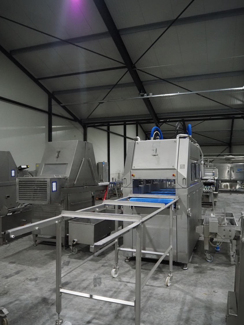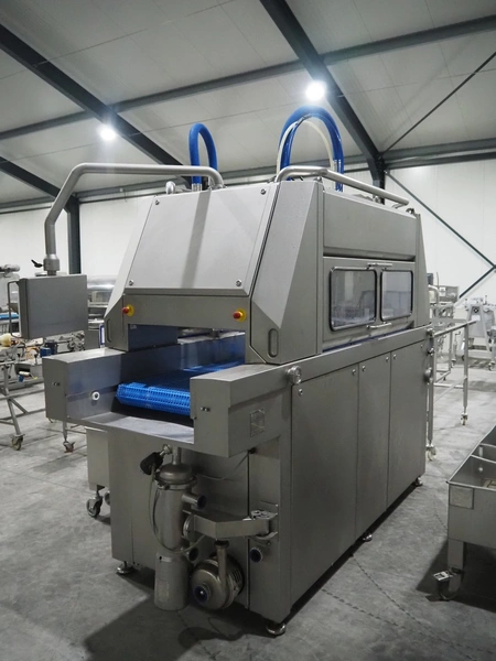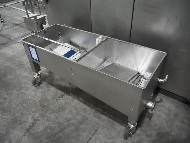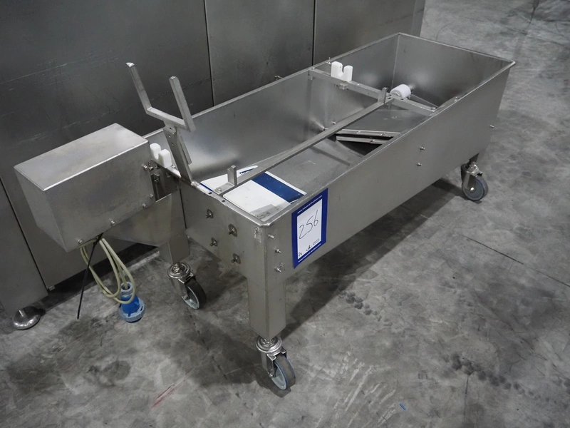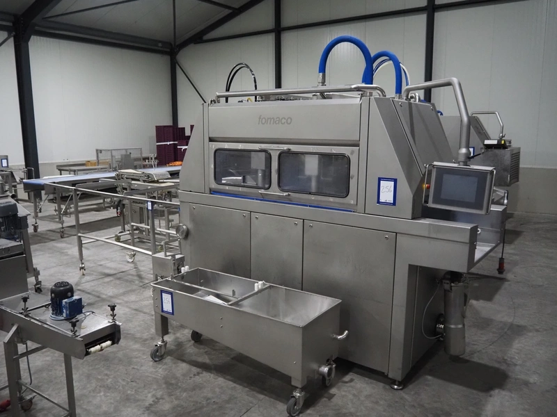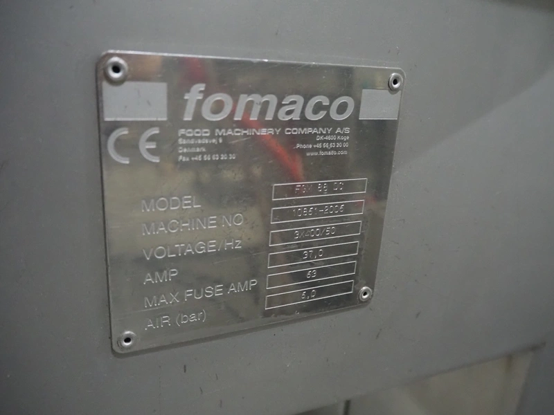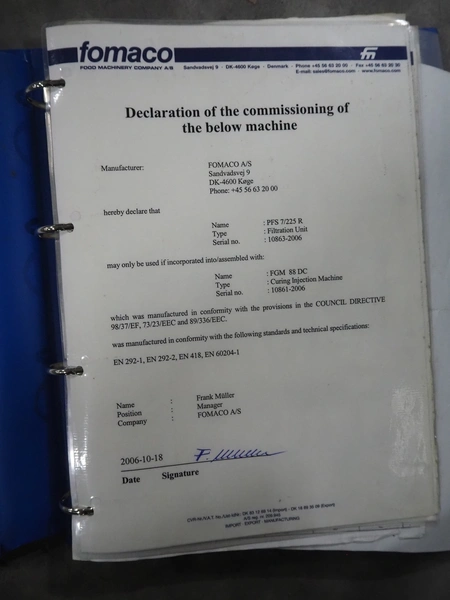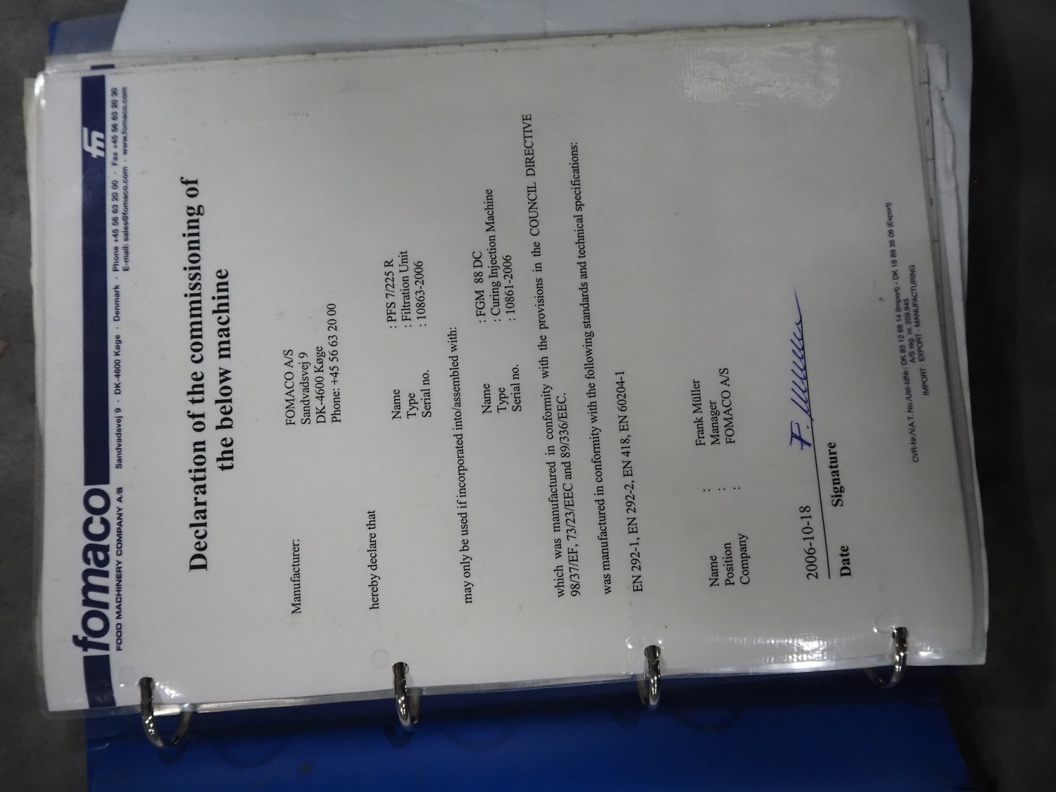 Fomaco injector, model: FGM 88 DC, machine number: 10861-2006, year of construction: 2006, 400 V, 3 Ph, 50 Hz, 63 A, 37.0 kW, air: 6.0 bar, plastic mesh belt, belt width: 720 mm, total dimensions: 2900 mm x 1300 mm x 2300 mm. Including Fomaco mobile filter tub, model: PFS 7 / 225 R, dimensions: 1900 mm x 700 mm x 950 mm, mobile frame for belt, dimensions frame: 2900 mm x 900 mm x 1250 mm. Incomplete.