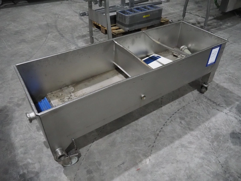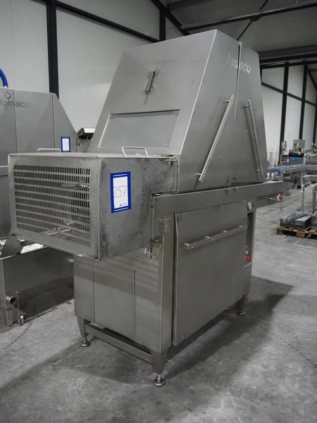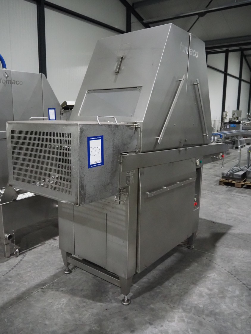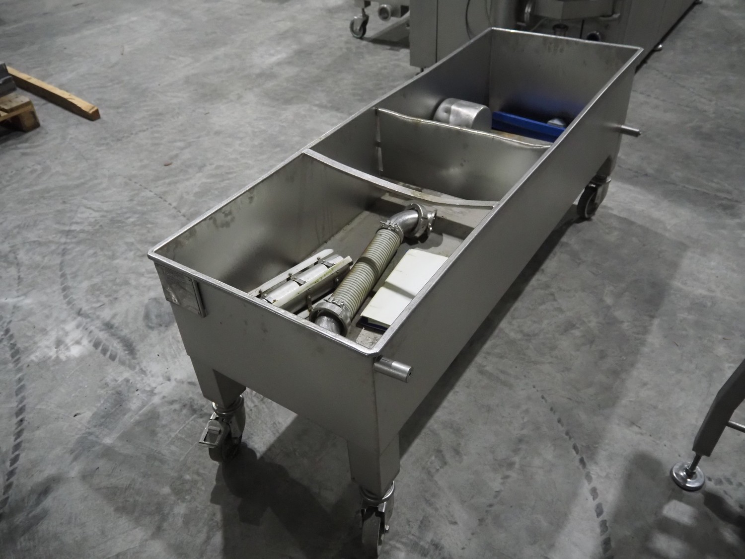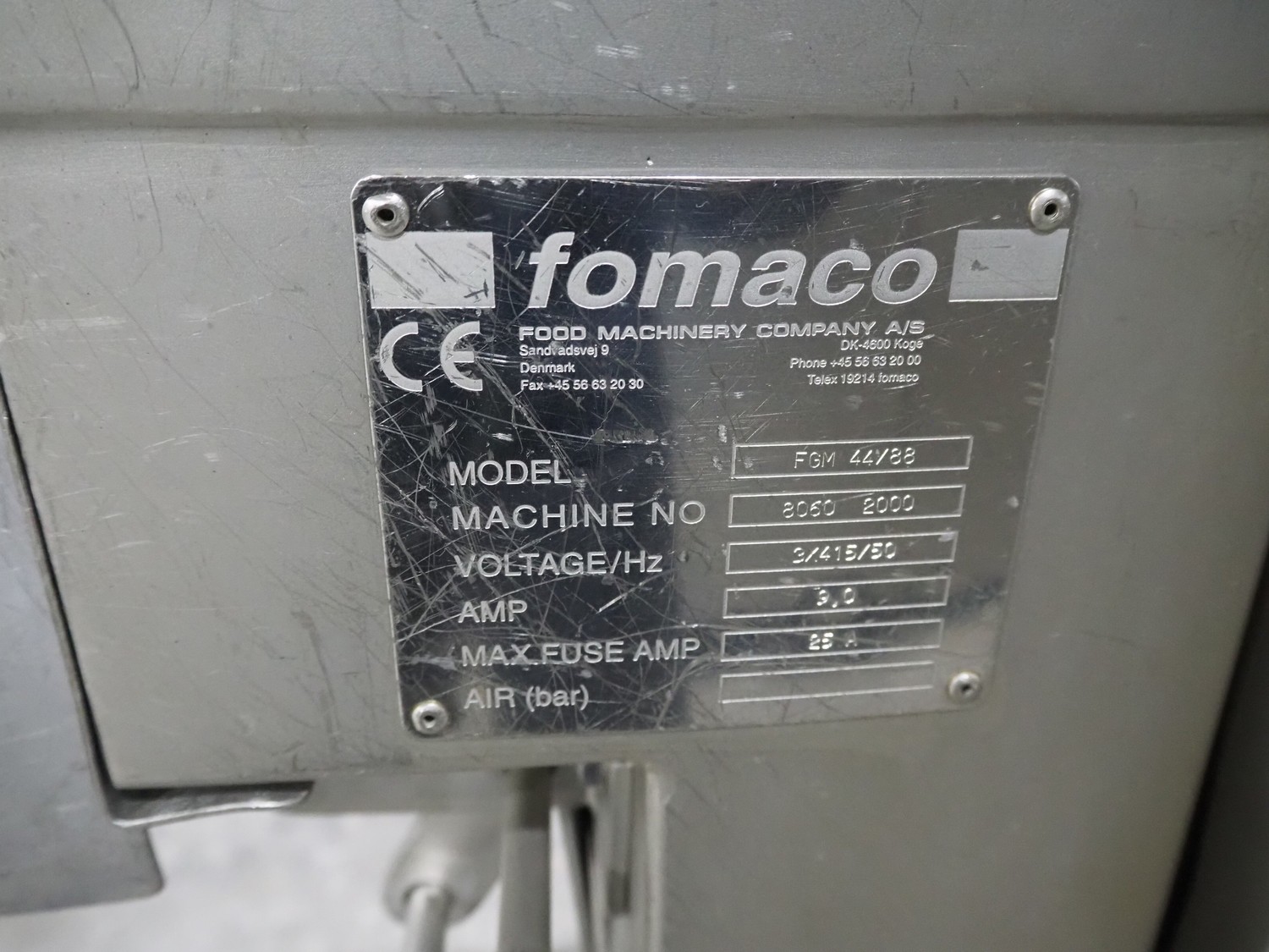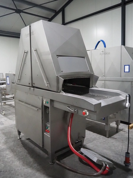 Fomaco injector, model: FGM 44/88, machine number: 8060 2000, year of construction: 2000, 3x415 V, 50 Hz, 9.0/25.0 A, s/s mesh belt, belt width: 550 mm, clearance: 560 mm x 200 mm, total dimensions injector: 2700 mm x 980 mm x 2280 mm, including Fomaco A/S mobile filter tub, dimensions: 1700 mm x 600 mm x 630 mm. Filter tub is incomplete.