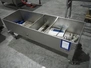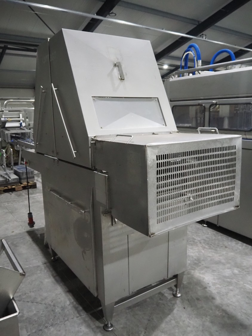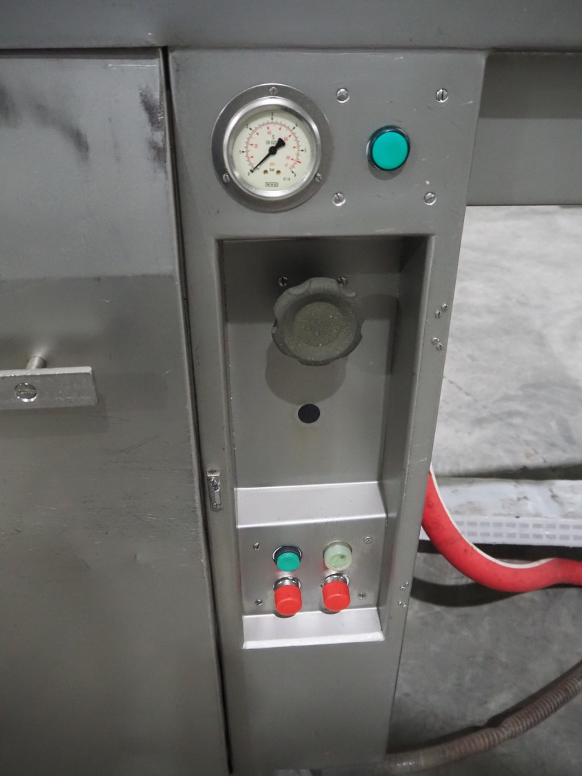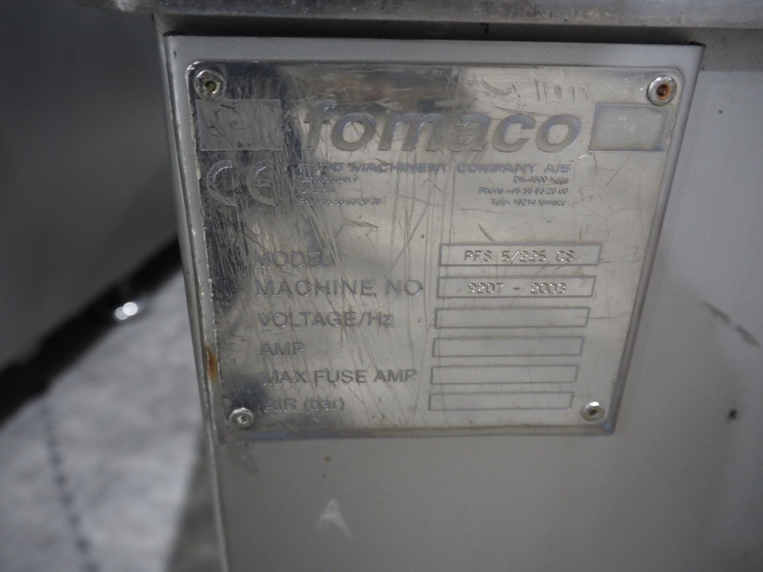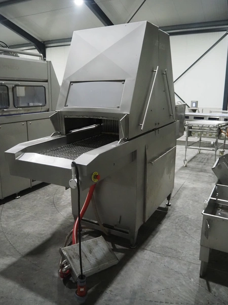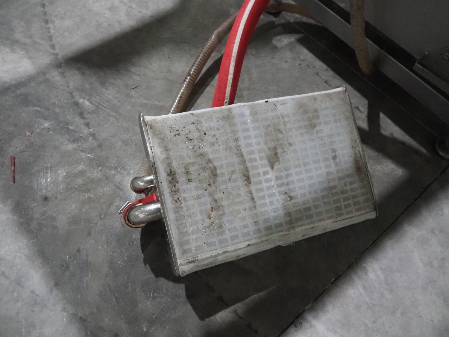Fomaco injector, model: FGM 44/88, machine number: 8060 2000, year of construction: 2000, 3x415 V, 50 Hz, 9.0/25.0 A, s/s mesh belt, belt width: 550 mm, clearance: 560 mm x 200 mm, total dimensions injector: 2700 mm x 980 mm x 2280 mm, including Fomaco A/S mobile filter tub, dimensions: 1700 mm x 600 mm x 630 mm. Filter tub is incomplete.