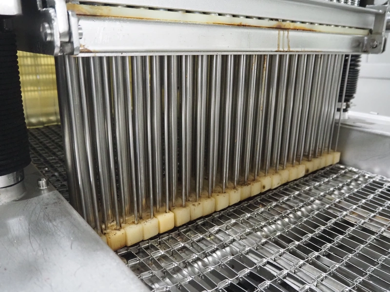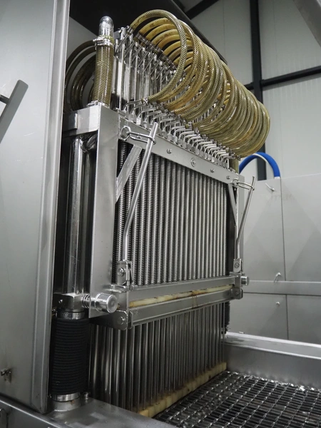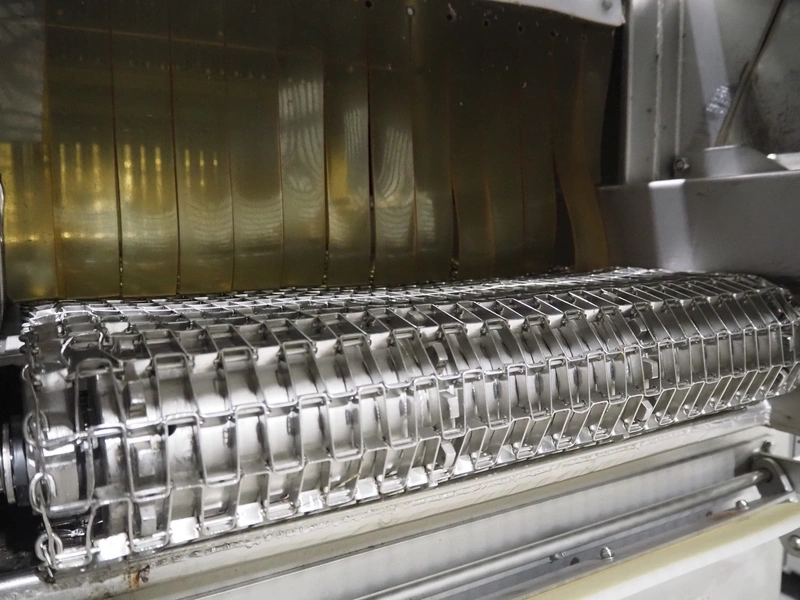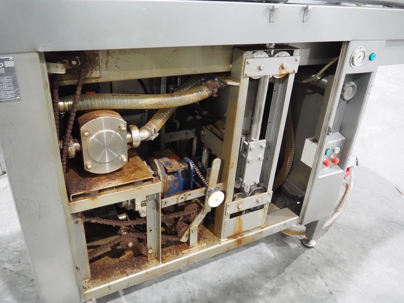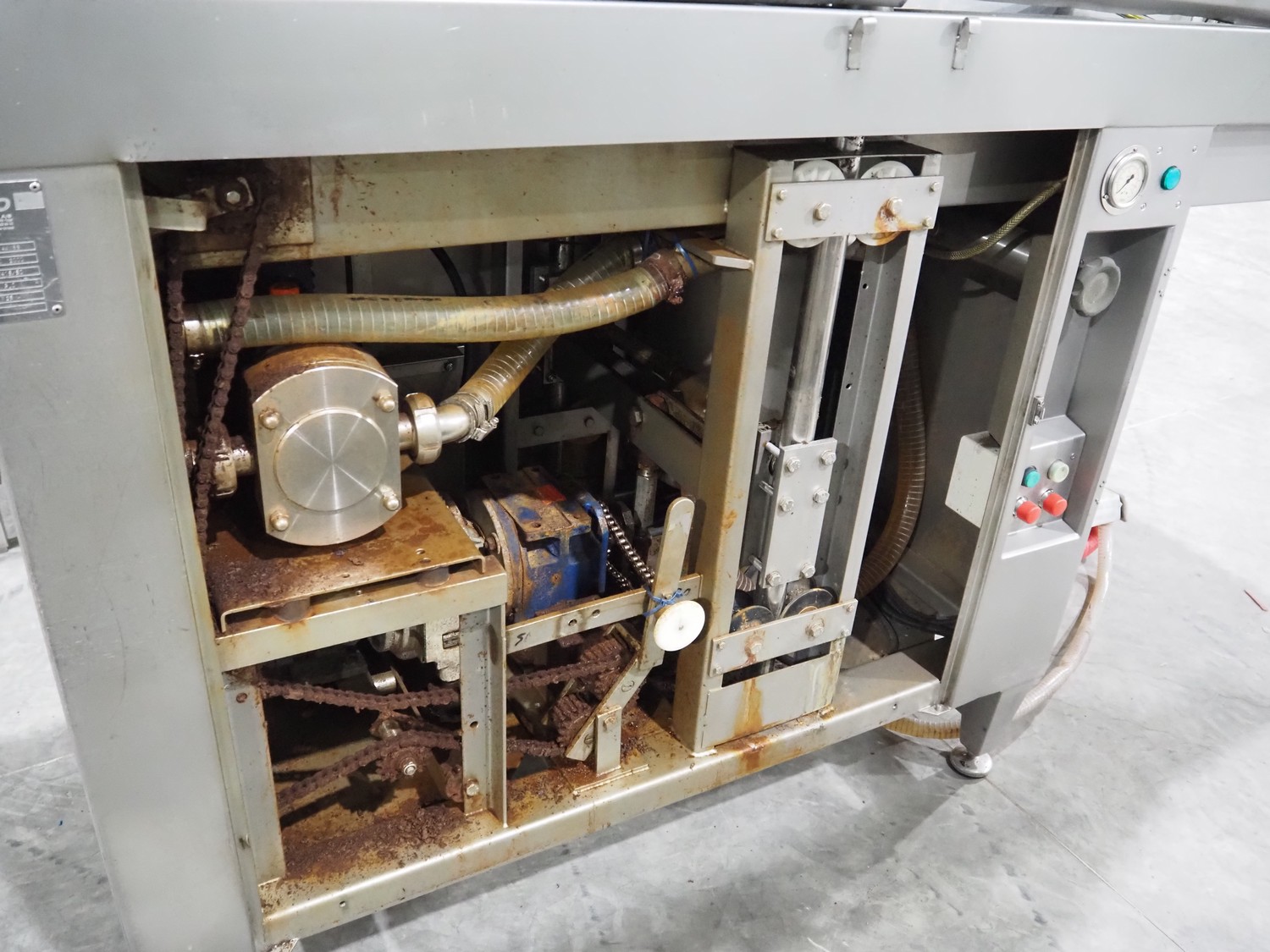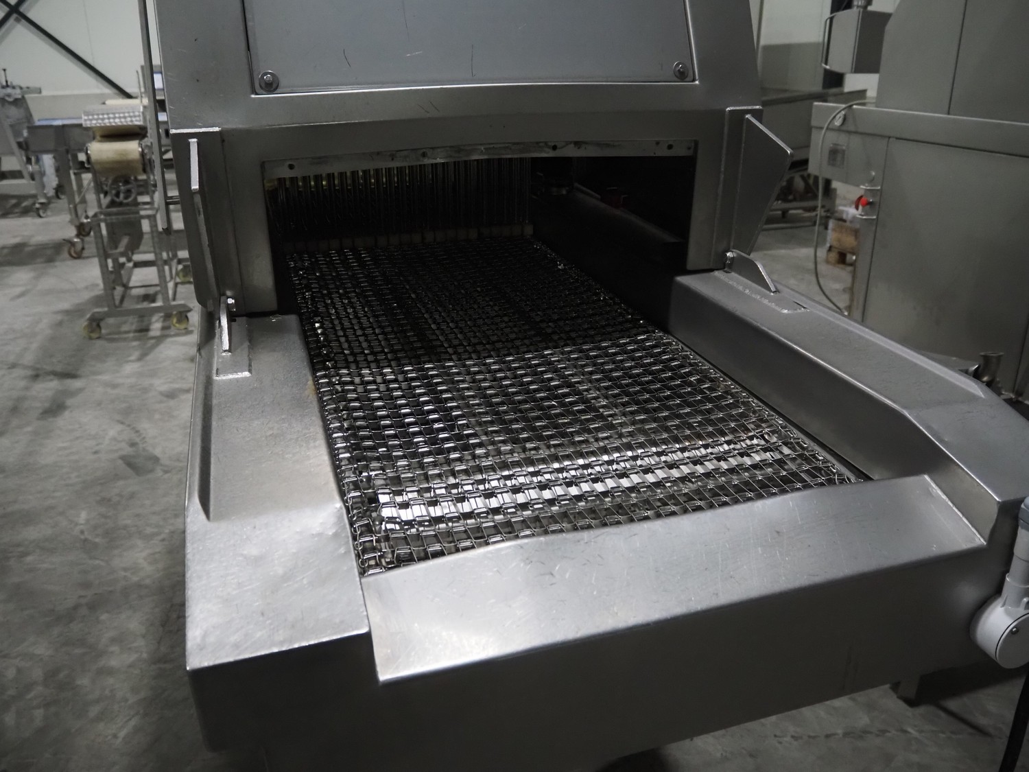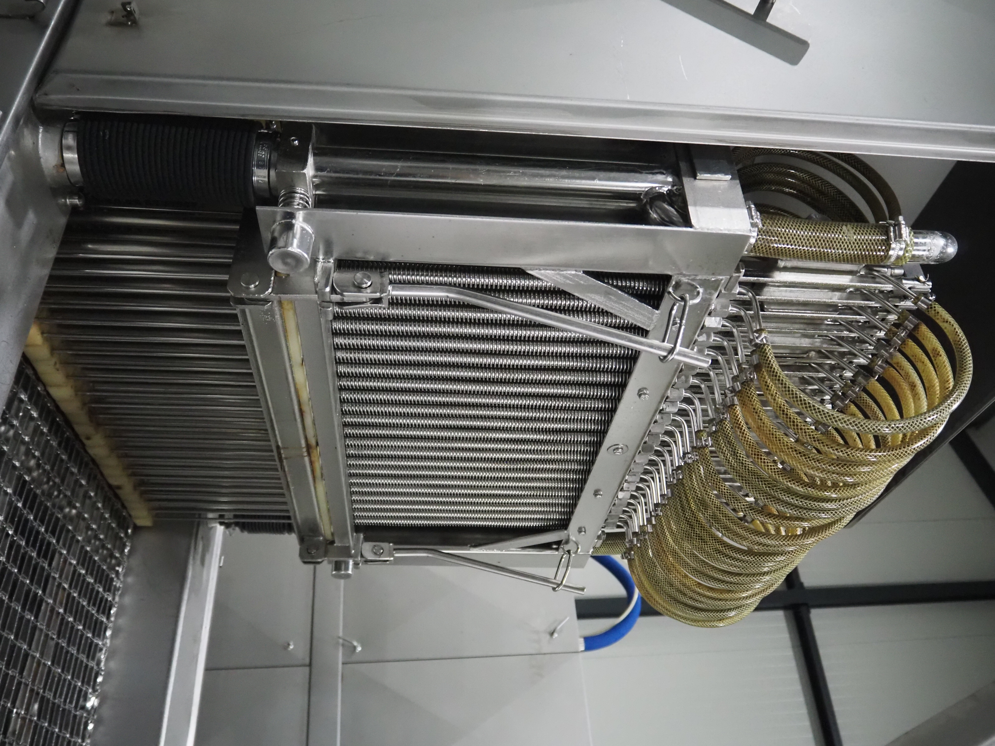 Fomaco injector, model: FGM 44/88, machine number: 8060 2000, year of construction: 2000, 3x415 V, 50 Hz, 9.0/25.0 A, s/s mesh belt, belt width: 550 mm, clearance: 560 mm x 200 mm, total dimensions injector: 2700 mm x 980 mm x 2280 mm, including Fomaco A/S mobile filter tub, dimensions: 1700 mm x 600 mm x 630 mm. Filter tub is incomplete.