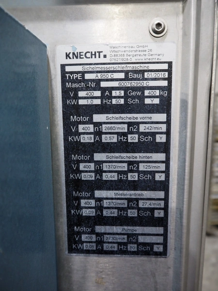 Knecht Maschinenbau knife sharpener, type: A 950 C, number: 600762950 C, year of construction: 10/2006, 400 V, 50 Hz, 1.5 A, 1.0 kW, weight: 400 kg, dimensions: 1700 mm x 1000 mm x 1750 mm.