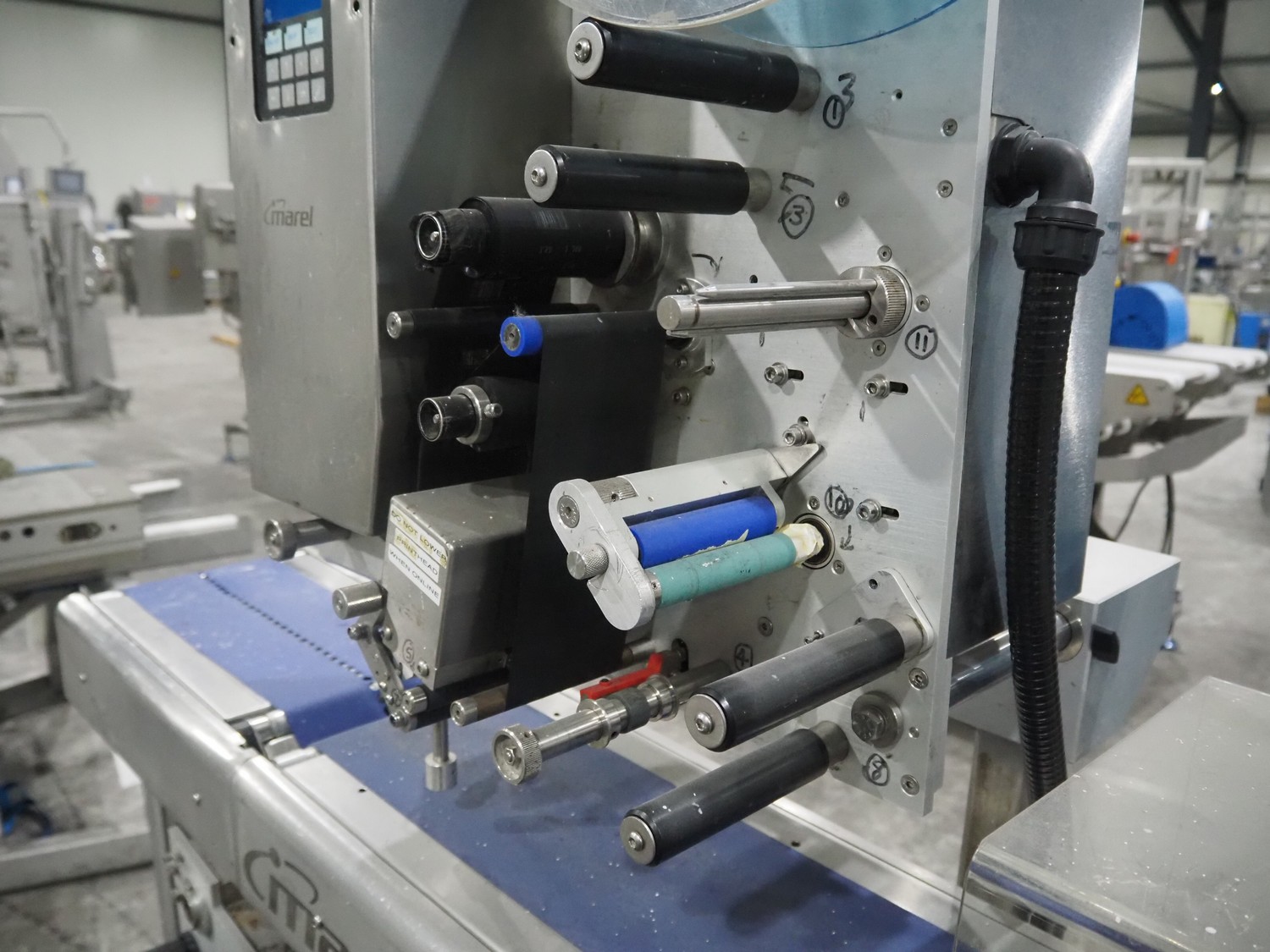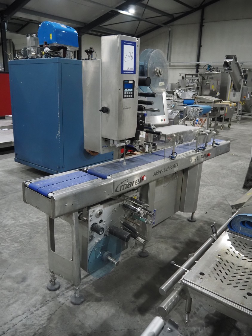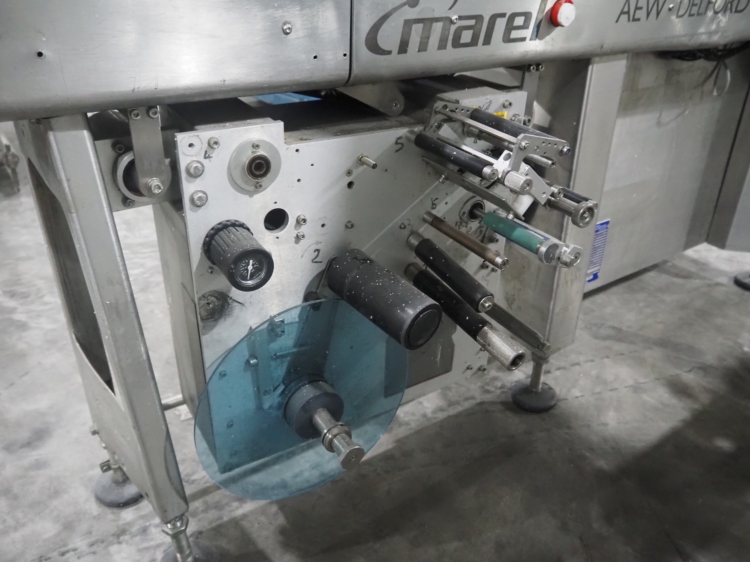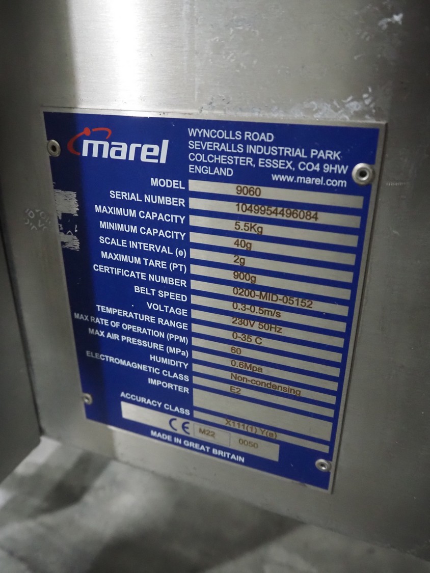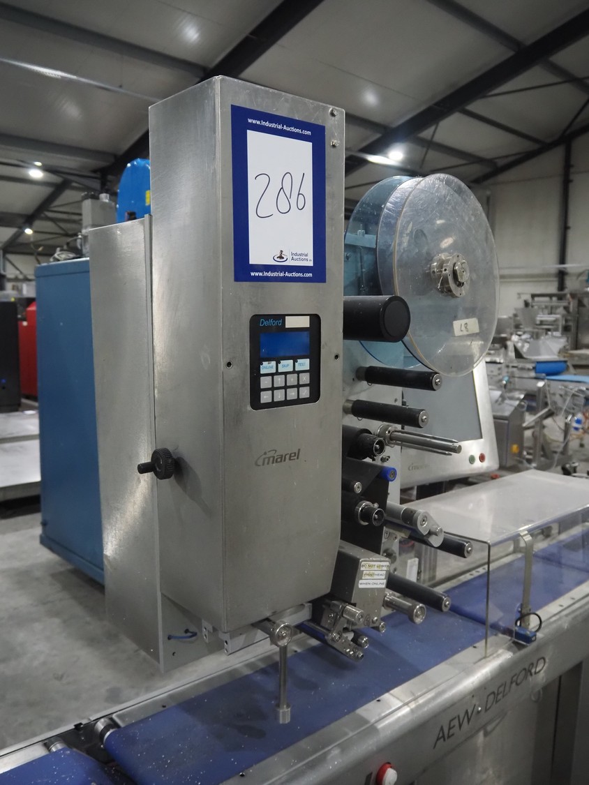 Marel / AEW Delford weighing and labelling machine, model: 9060, serial number: 1049954496084, Max capacity: 5.5 kg, 230 V, 50 Hz, belt speed: 0.3-0.5 m/s, plastic belt, belt width: 195 mm, total dimensions: 2600 mm x 650 mm x 1780 mm.