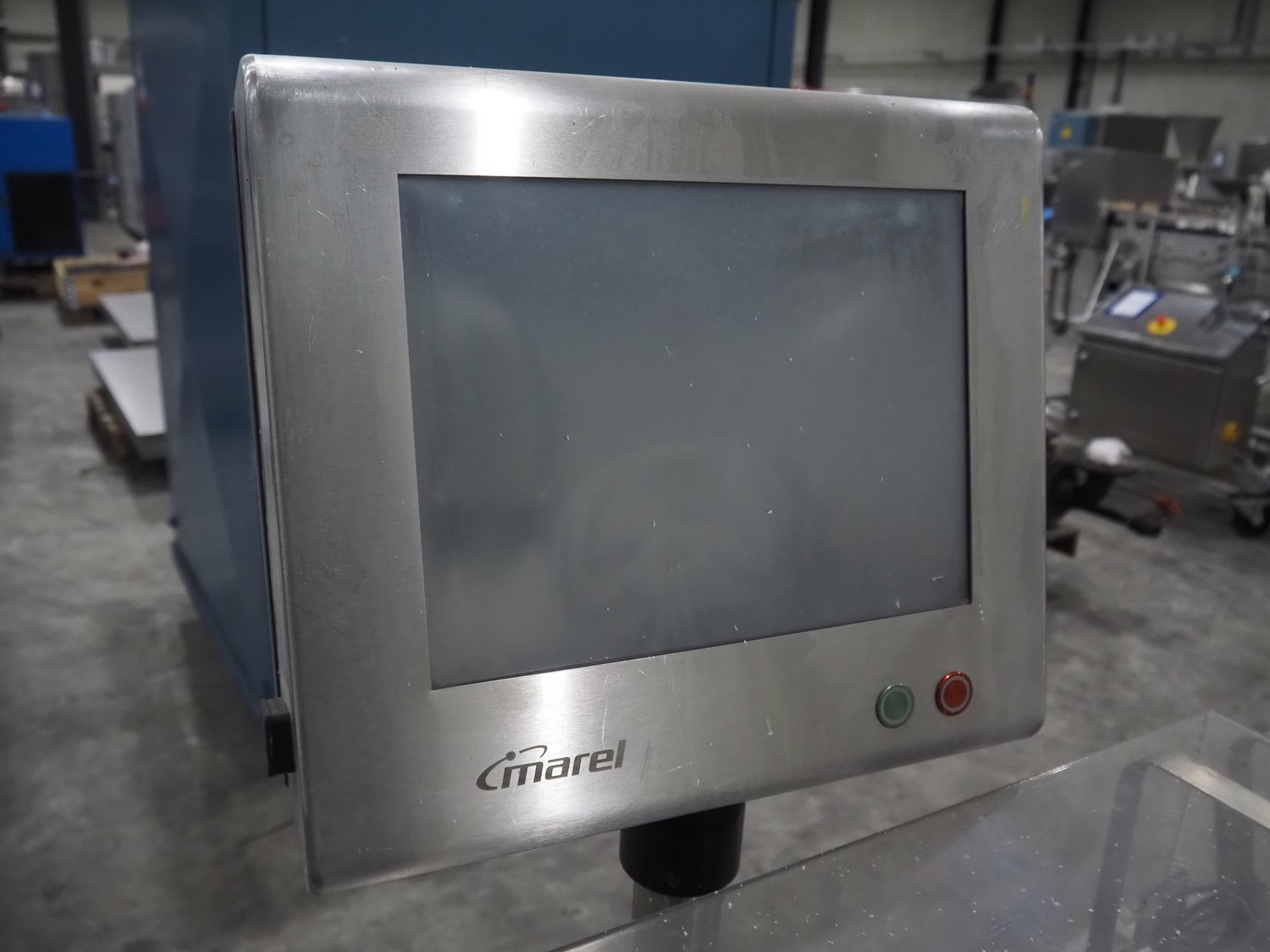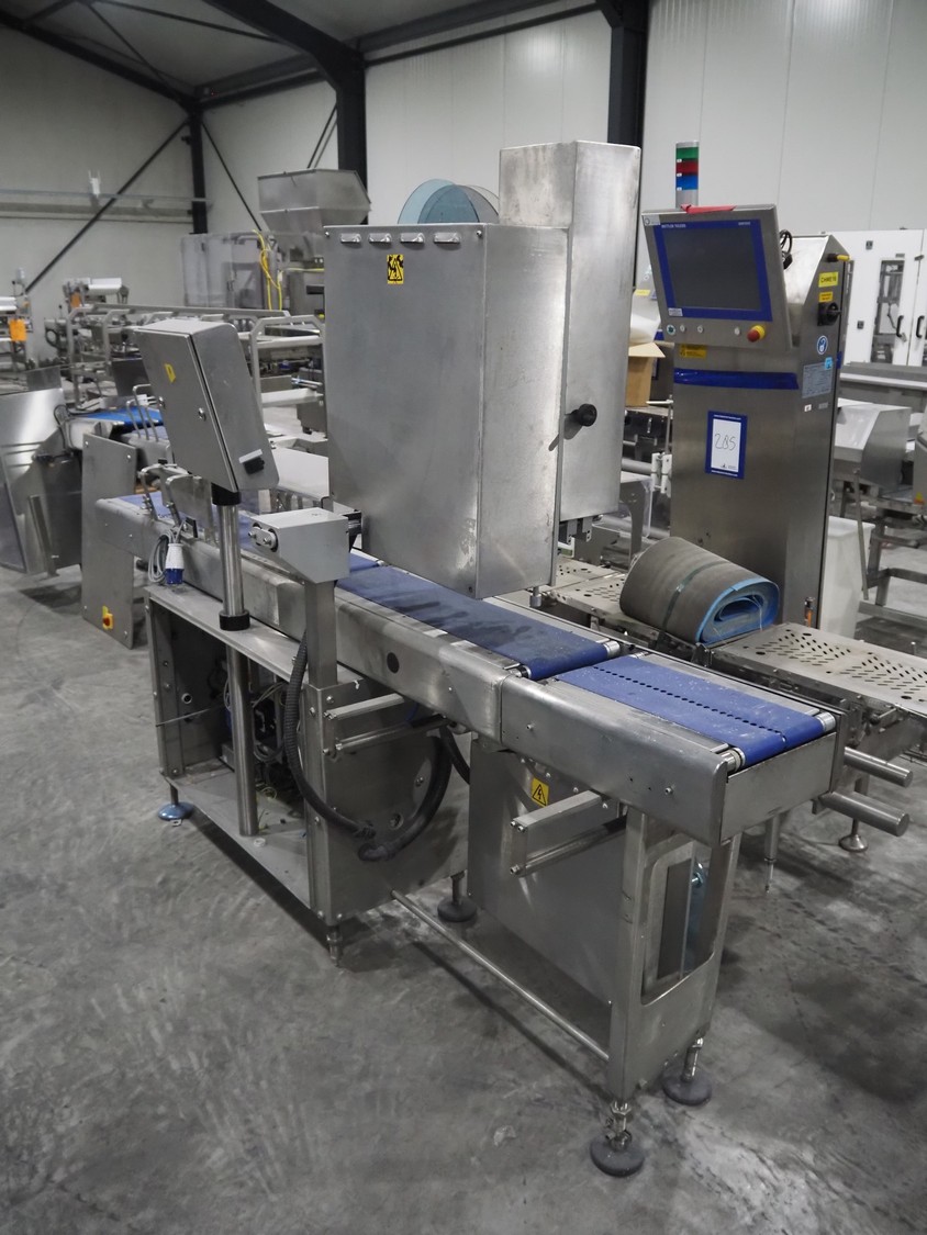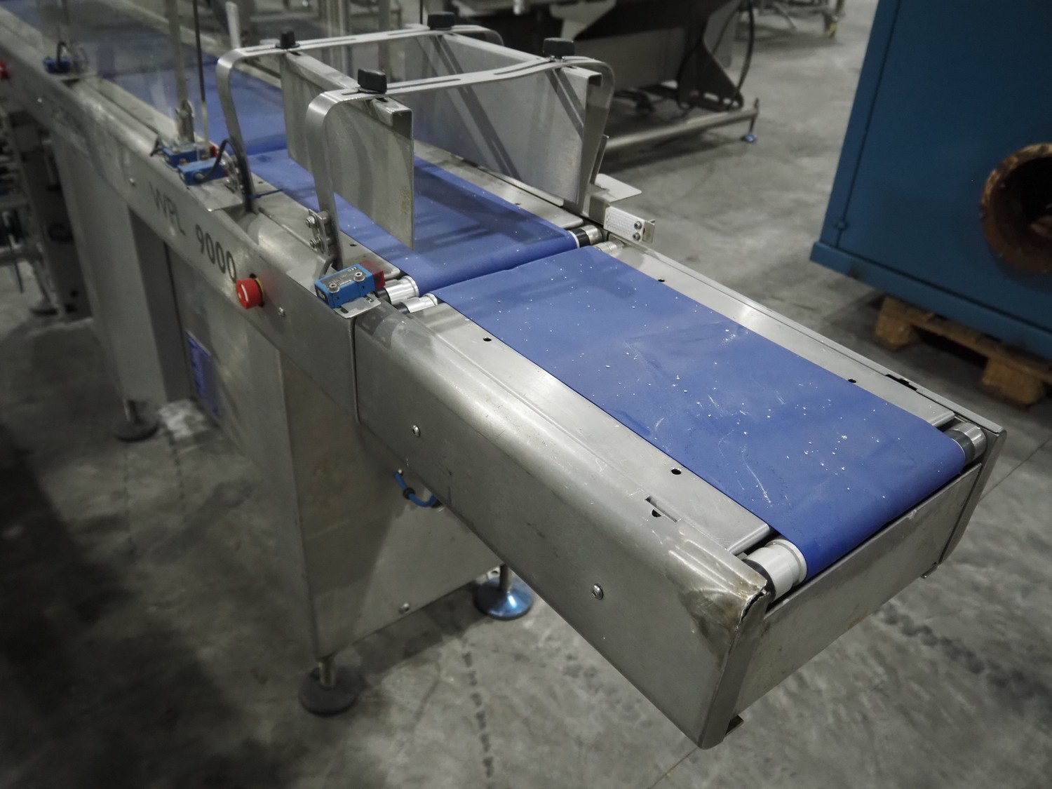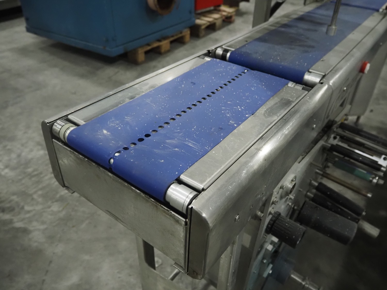 Marel / AEW Delford weighing and labelling machine, model: 9060, serial number: 1049954496084, Max capacity: 5.5 kg, 230 V, 50 Hz, belt speed: 0.3-0.5 m/s, plastic belt, belt width: 195 mm, total dimensions: 2600 mm x 650 mm x 1780 mm.