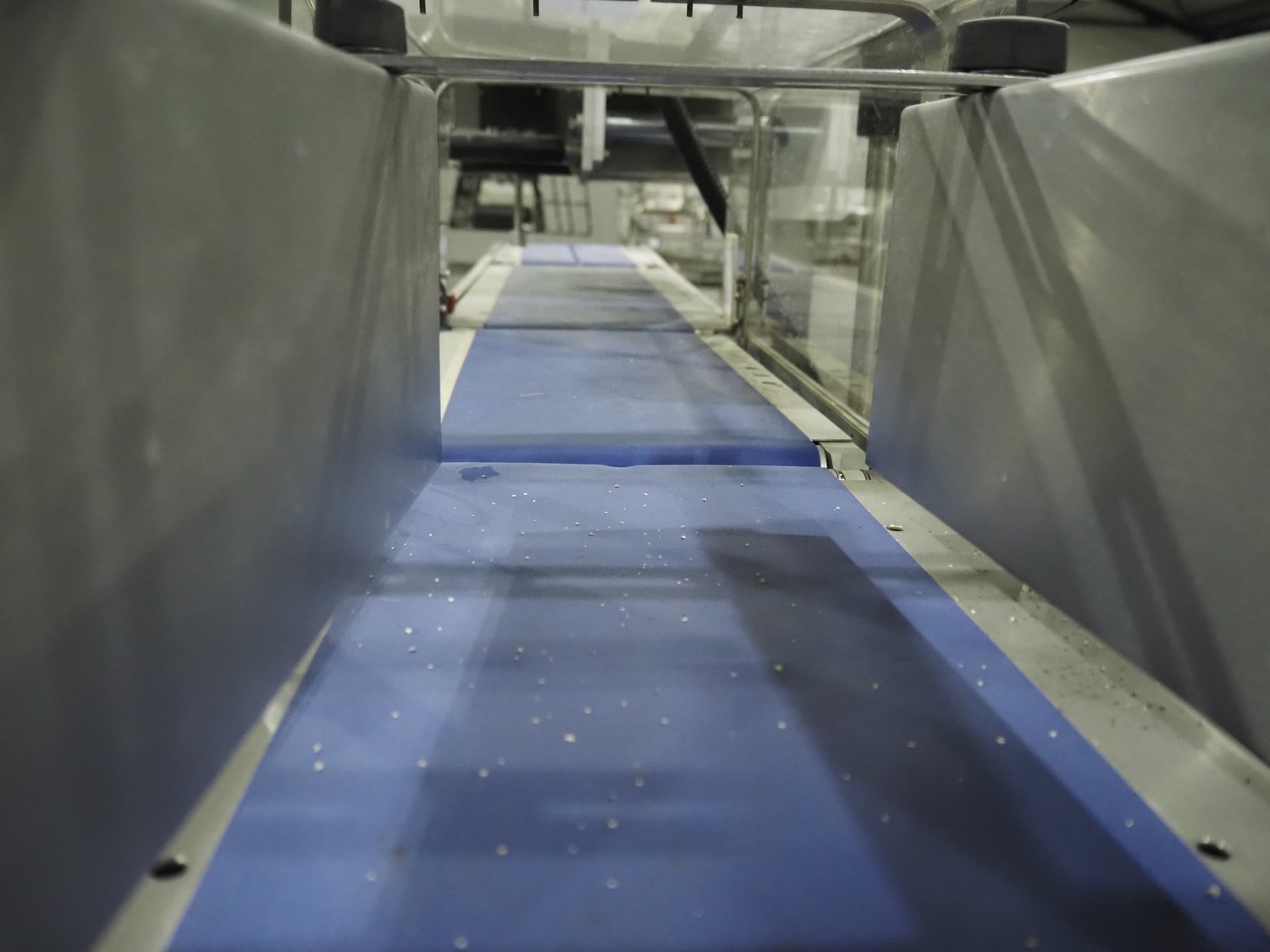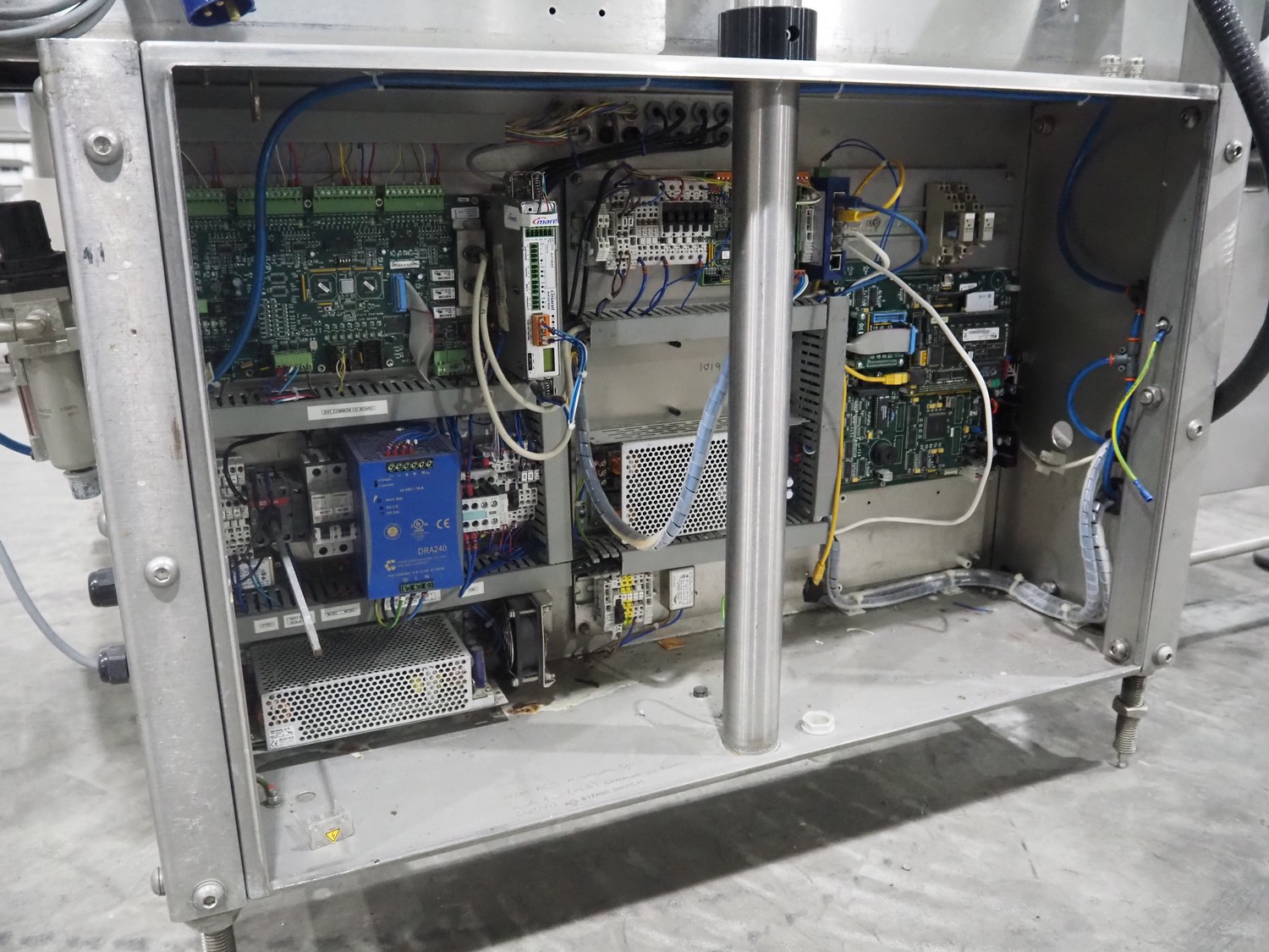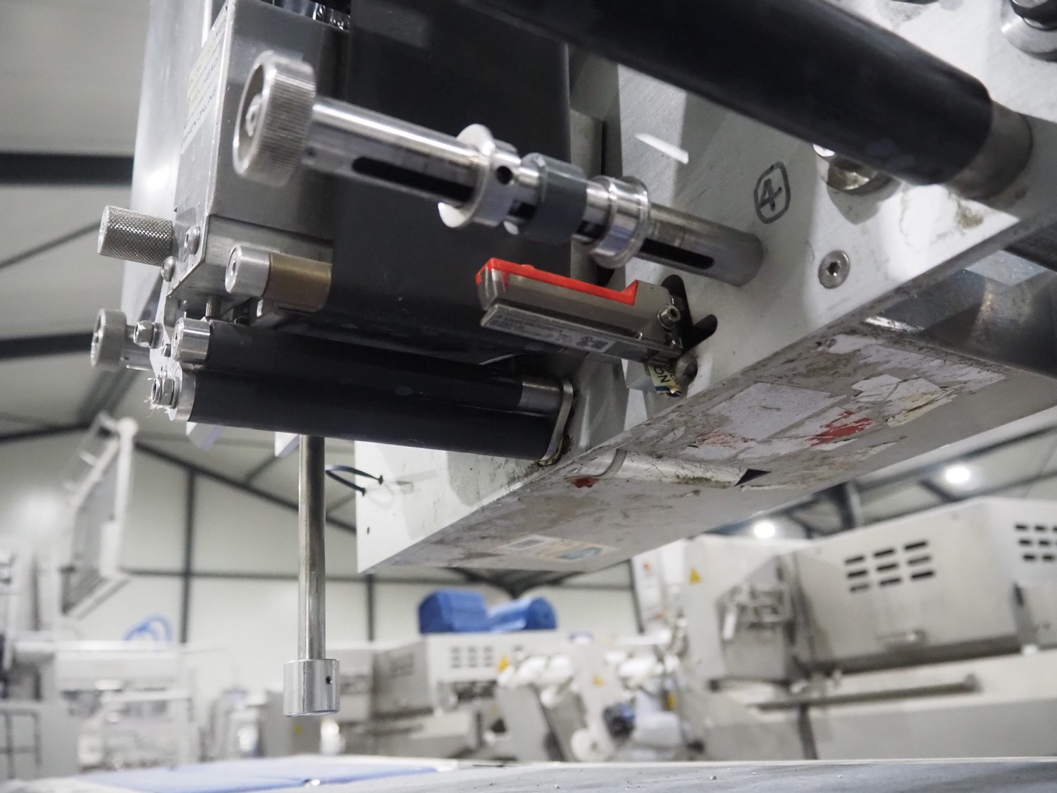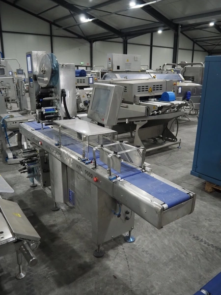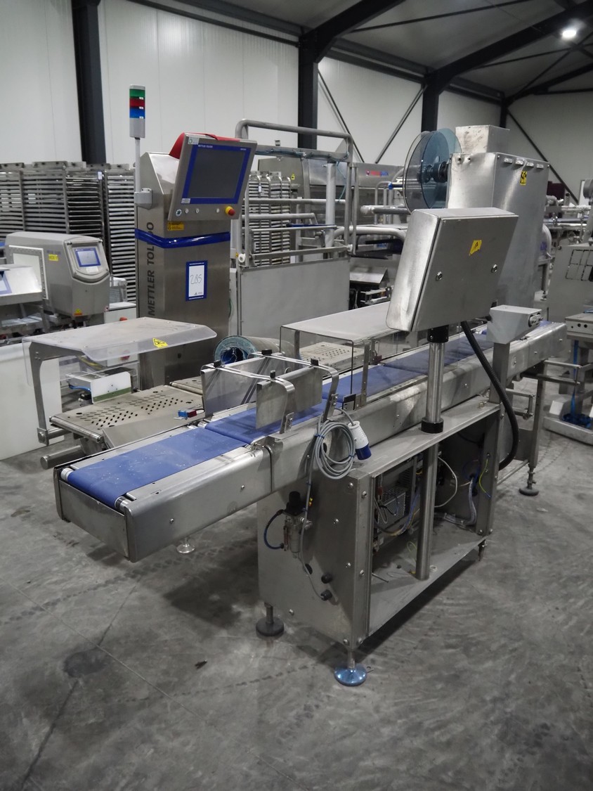 Marel / AEW Delford weighing and labelling machine, model: 9060, serial number: 1049954496084, Max capacity: 5.5 kg, 230 V, 50 Hz, belt speed: 0.3-0.5 m/s, plastic belt, belt width: 195 mm, total dimensions: 2600 mm x 650 mm x 1780 mm.