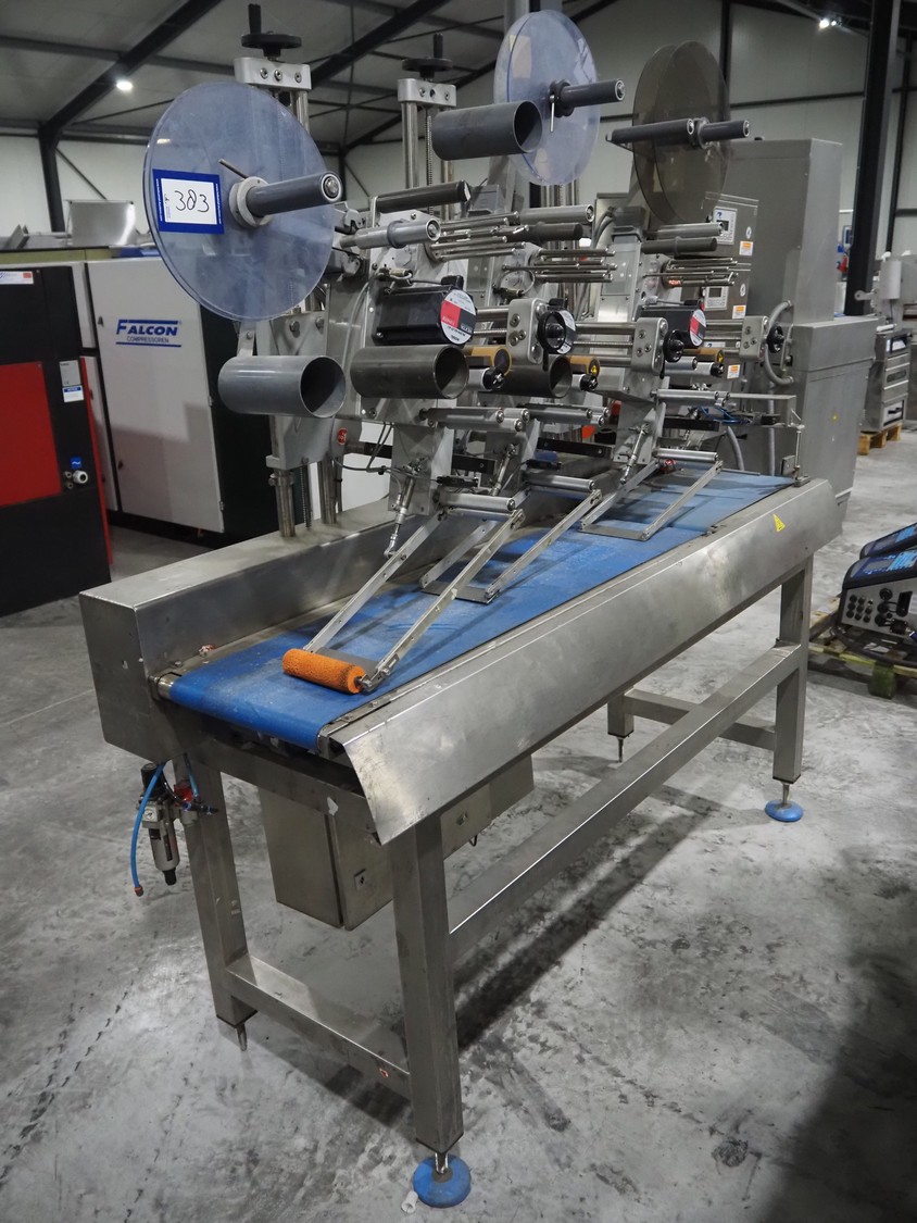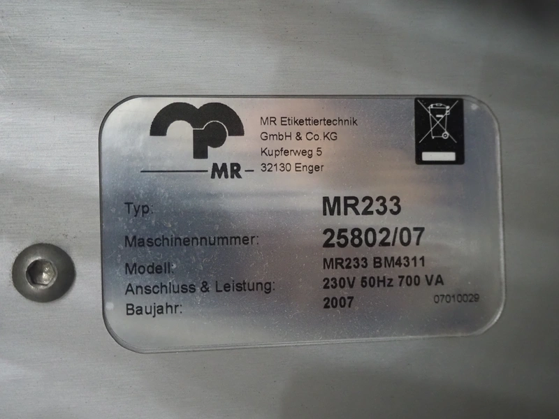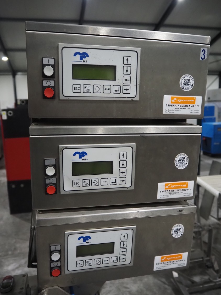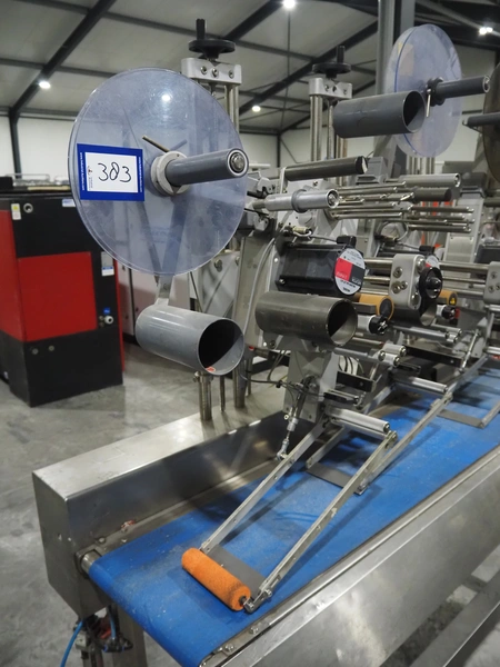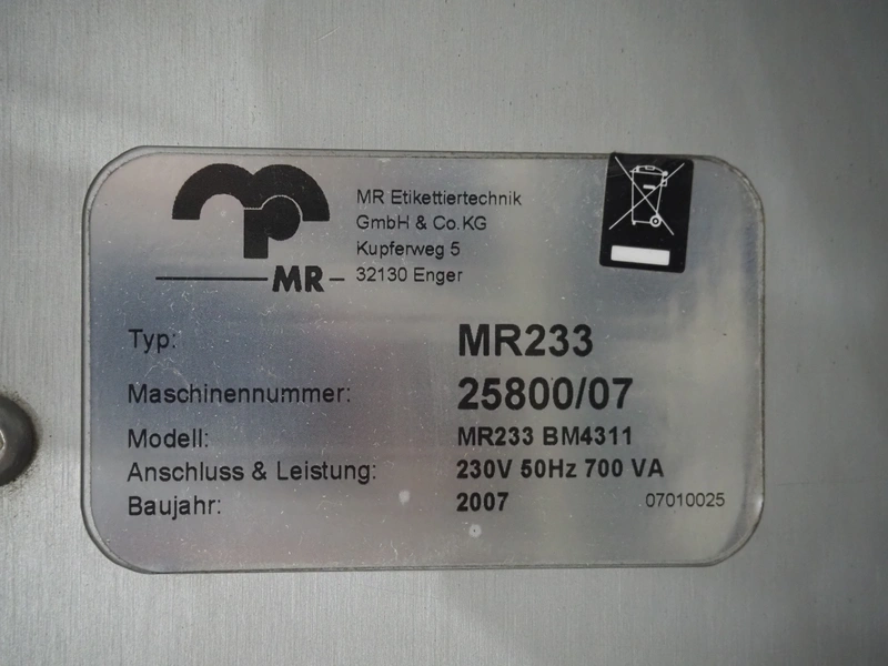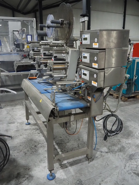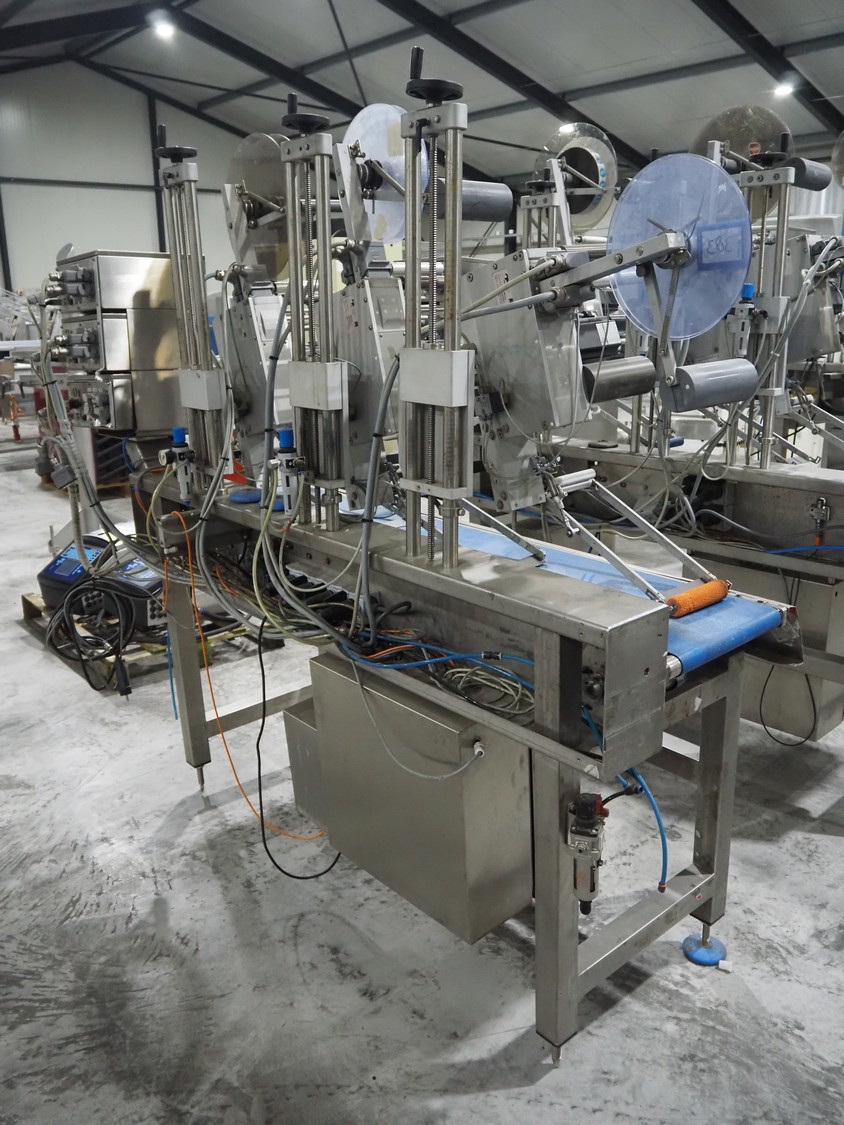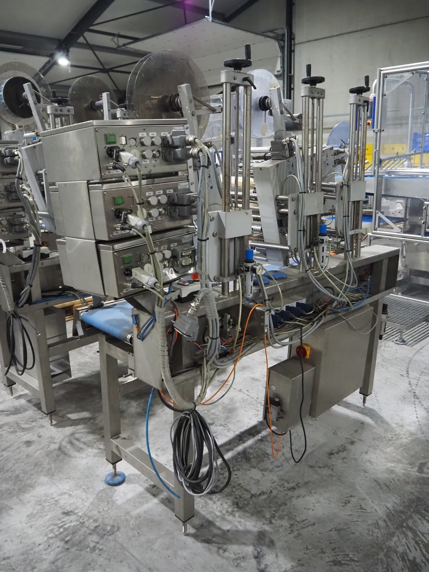 Espera labelling machine with 3 MR Etikettiertechnik labellers, Espera model: ES 7000, labeller type: (3x) MR233, year of construction: 2007, 230 V, 50 Hz, maximum label width: 150 mm, plastic belts, belt width: 350 mm, total dimensions: 2050 mm x 750 mm x 1950 mm.