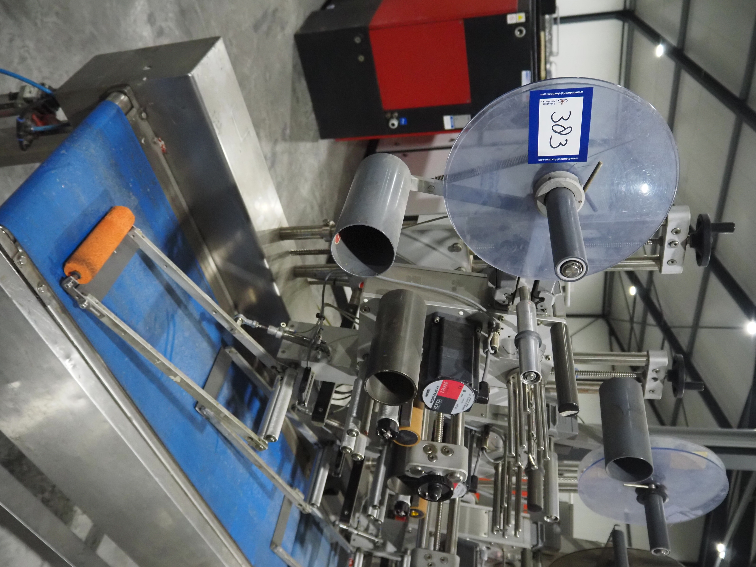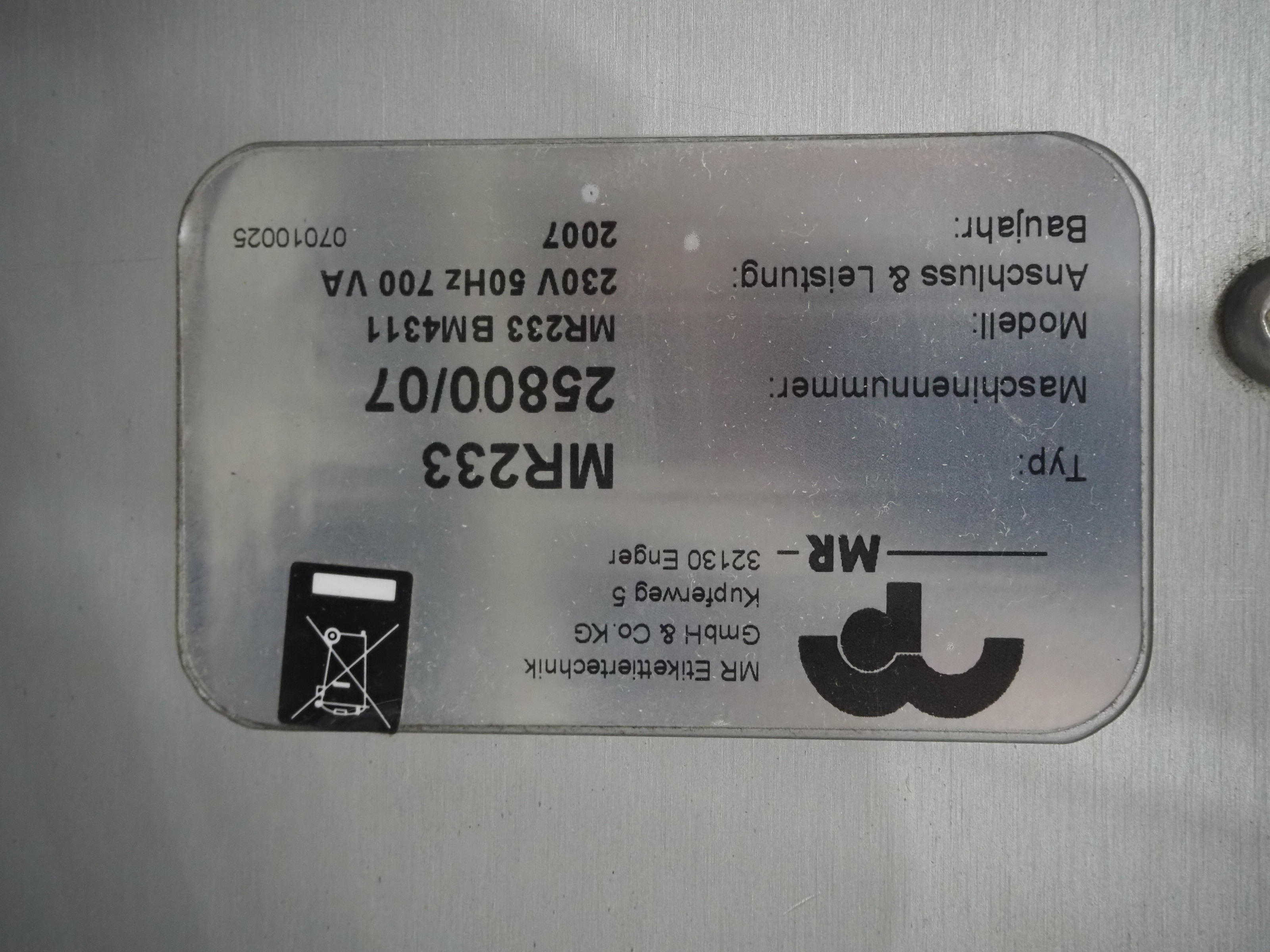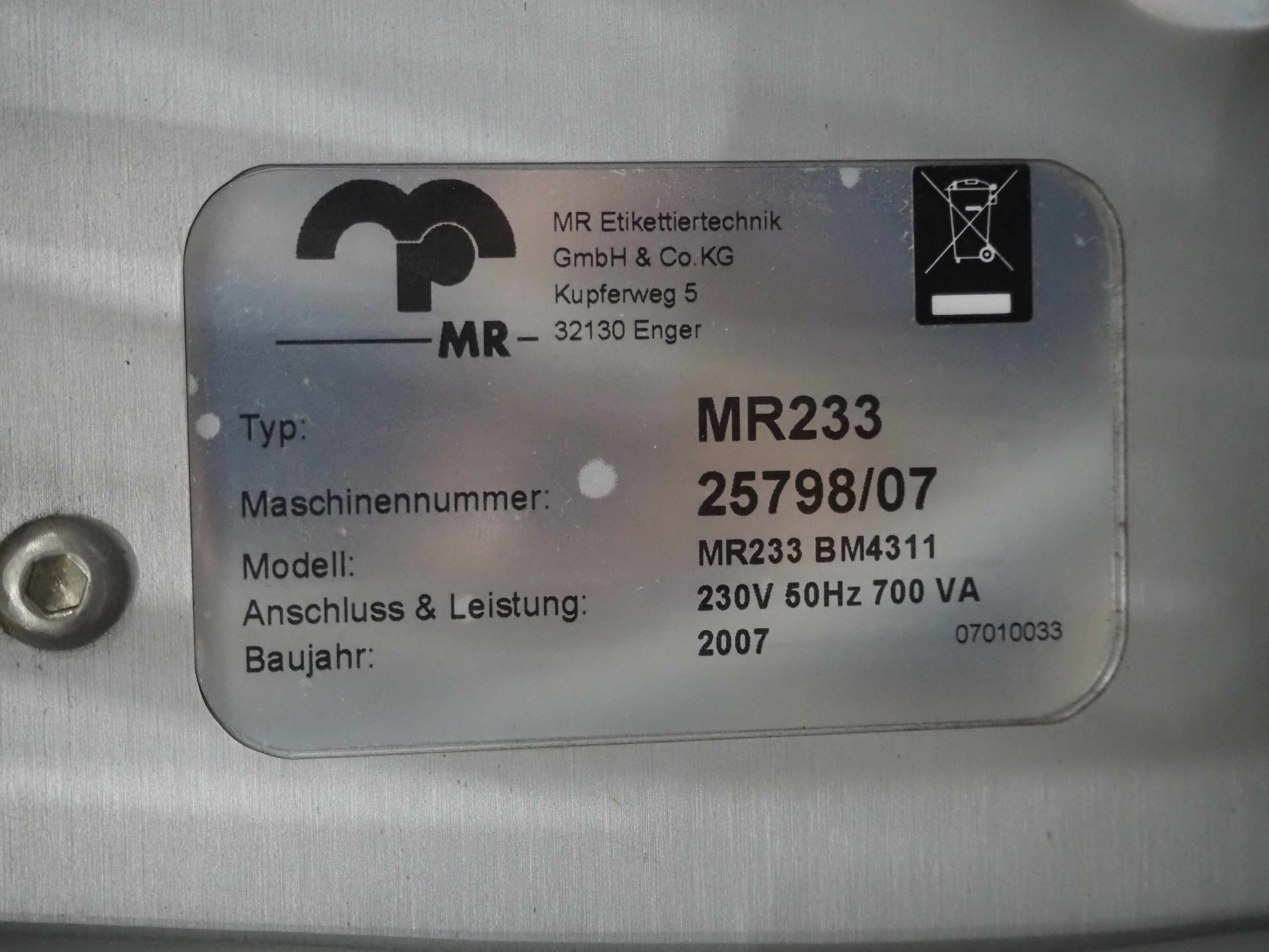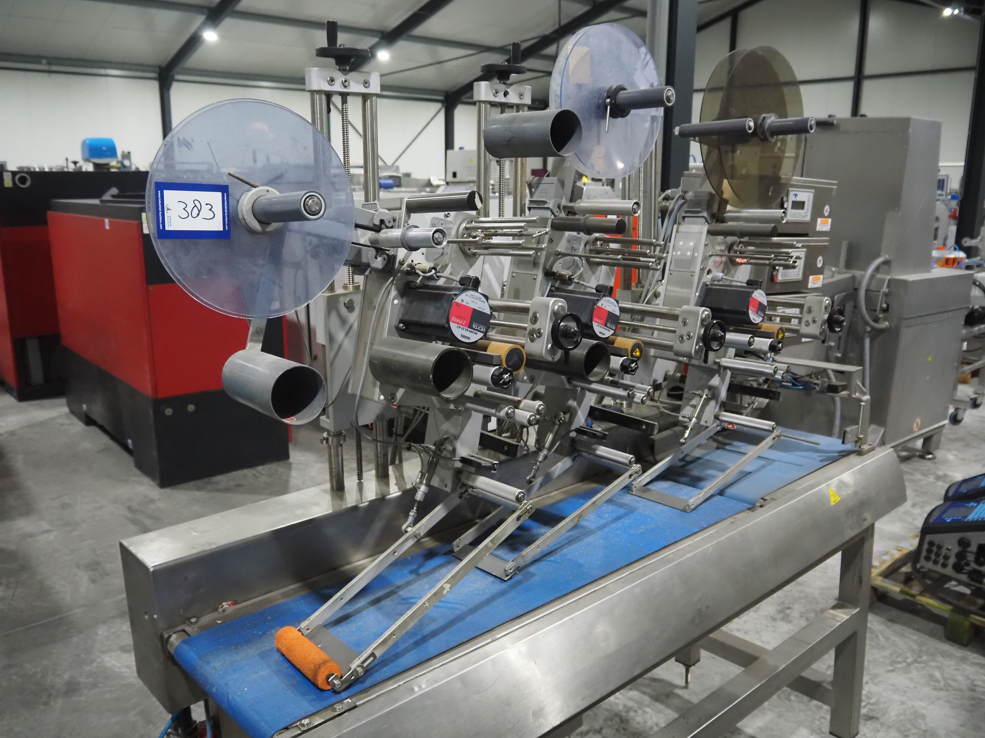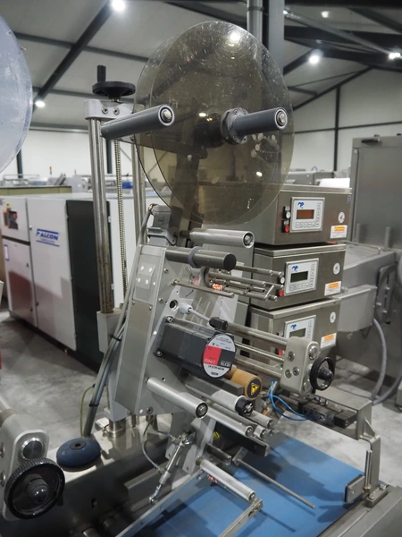Espera labelling machine with 3 MR Etikettiertechnik labellers, Espera model: ES 7000, labeller type: (3x) MR233, year of construction: 2007, 230 V, 50 Hz, maximum label width: 150 mm, plastic belts, belt width: 350 mm, total dimensions: 2050 mm x 750 mm x 1950 mm.