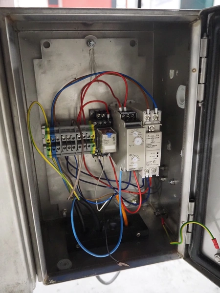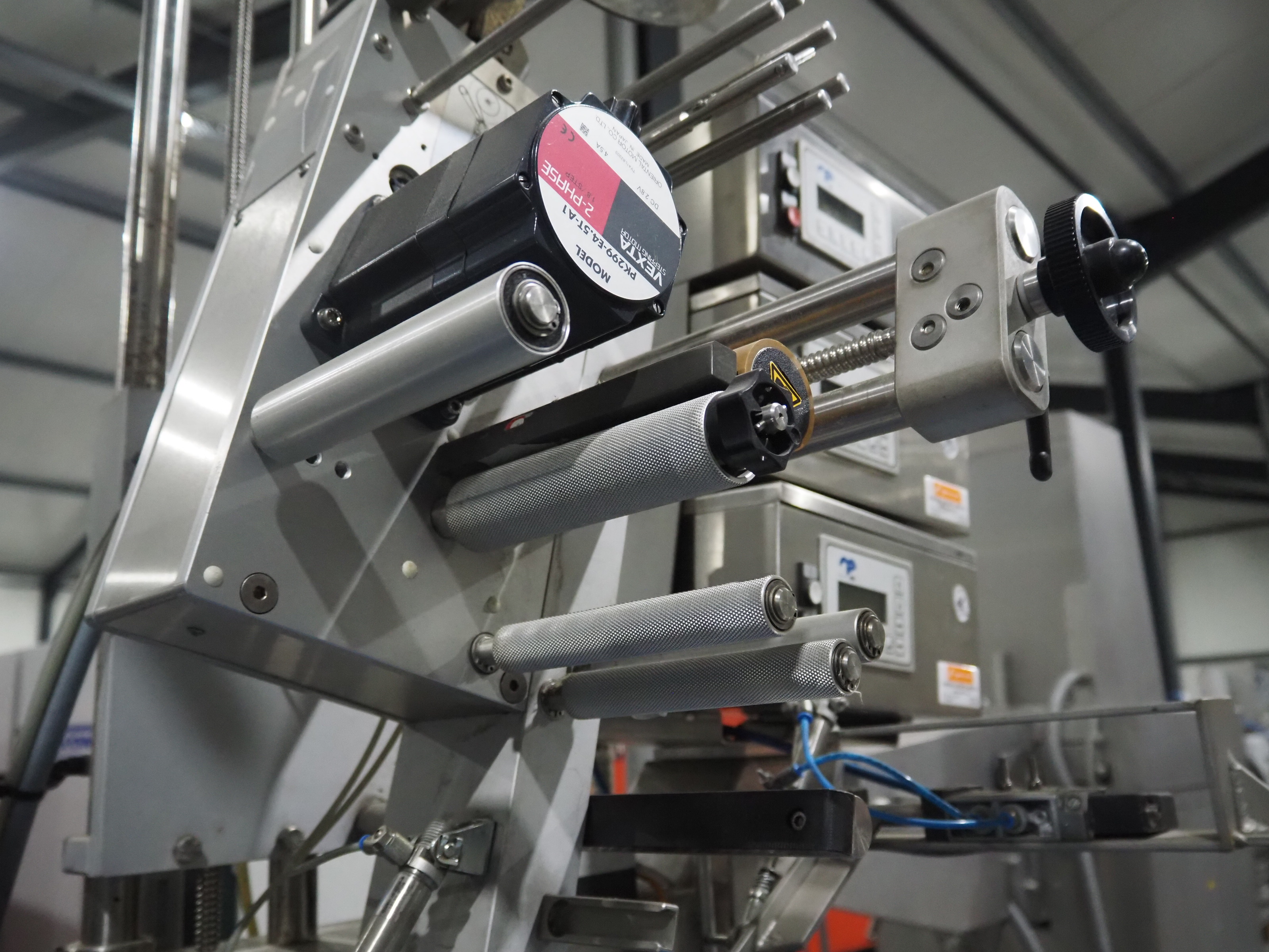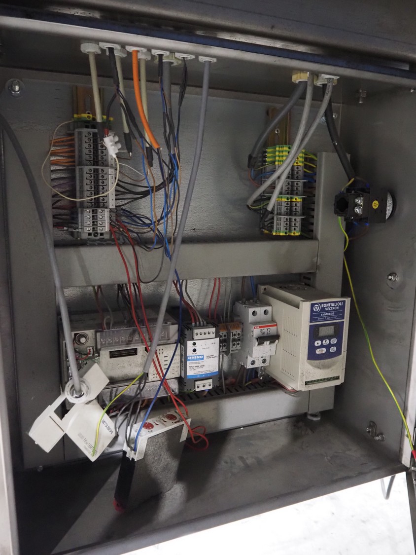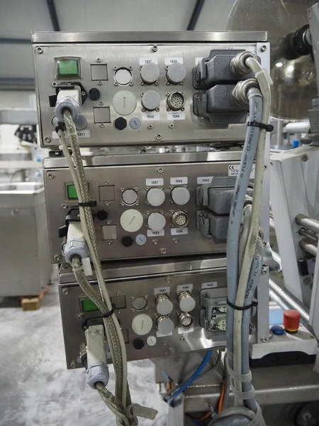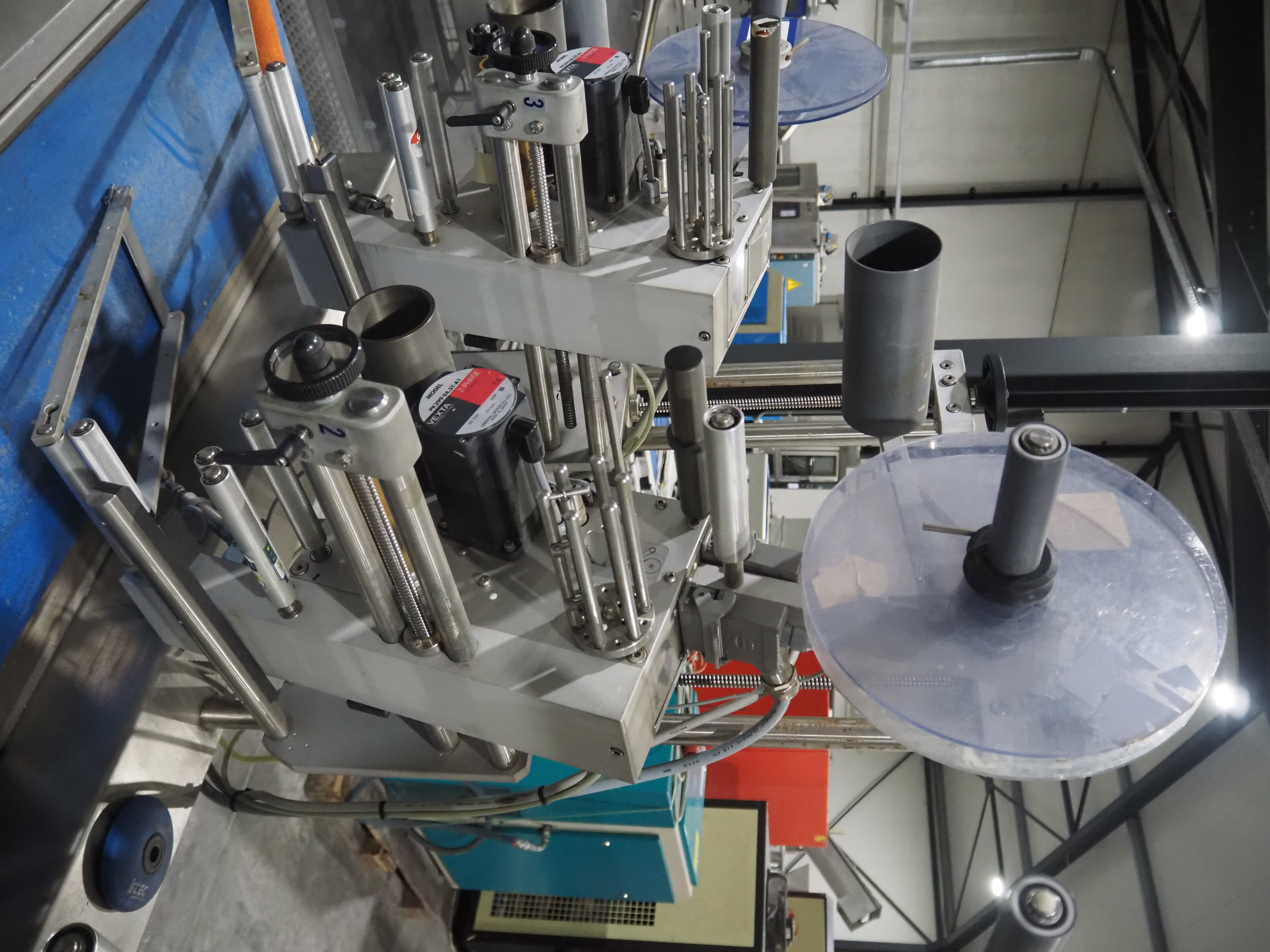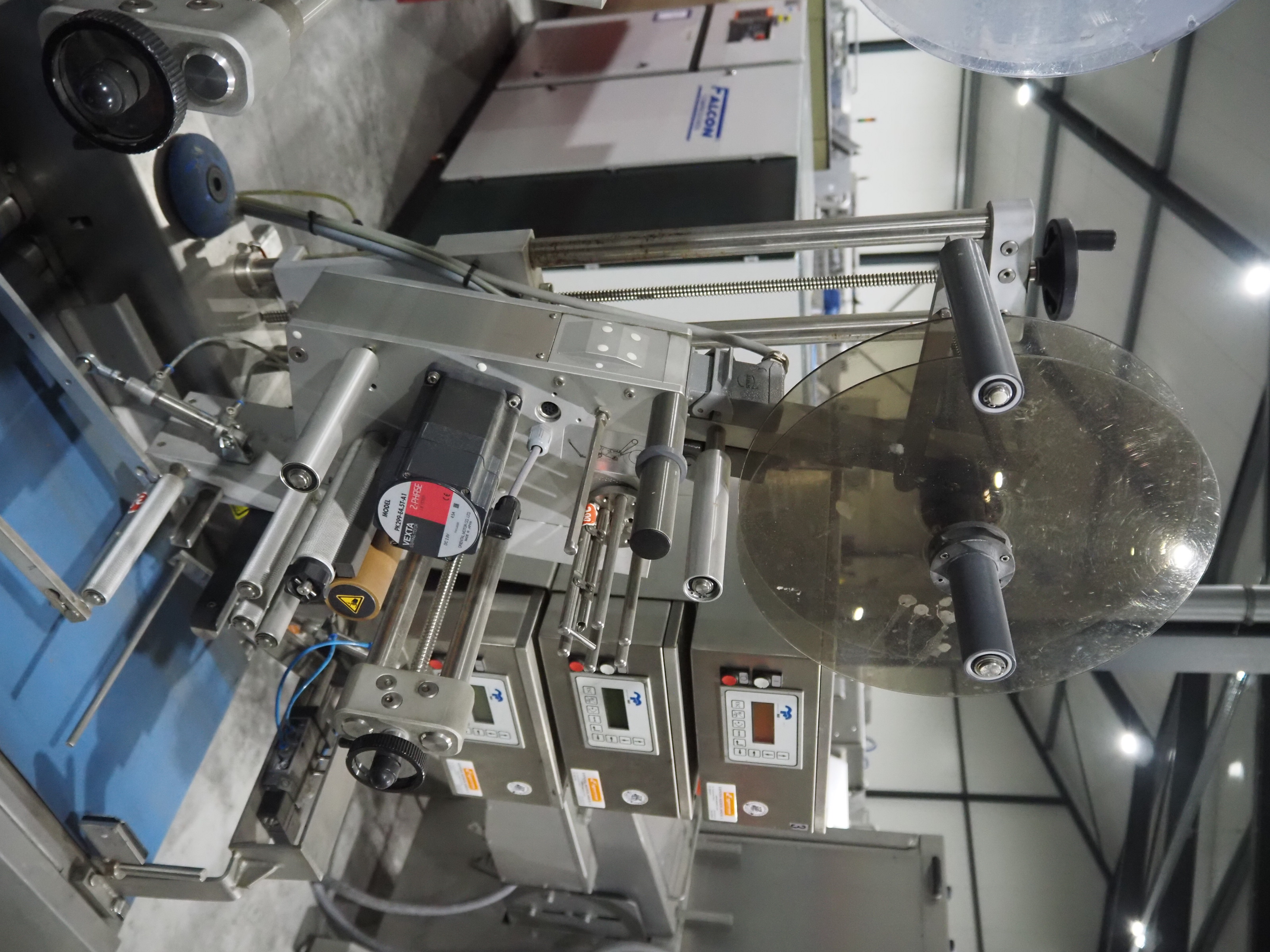 Espera labelling machine with 3 MR Etikettiertechnik labellers, Espera model: ES 7000, labeller type: (3x) MR233, year of construction: 2007, 230 V, 50 Hz, maximum label width: 150 mm, plastic belts, belt width: 350 mm, total dimensions: 2050 mm x 750 mm x 1950 mm.