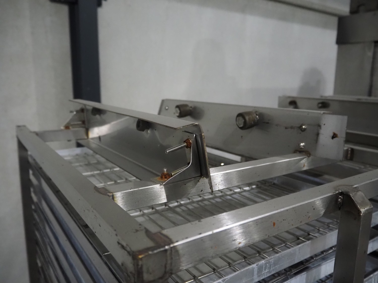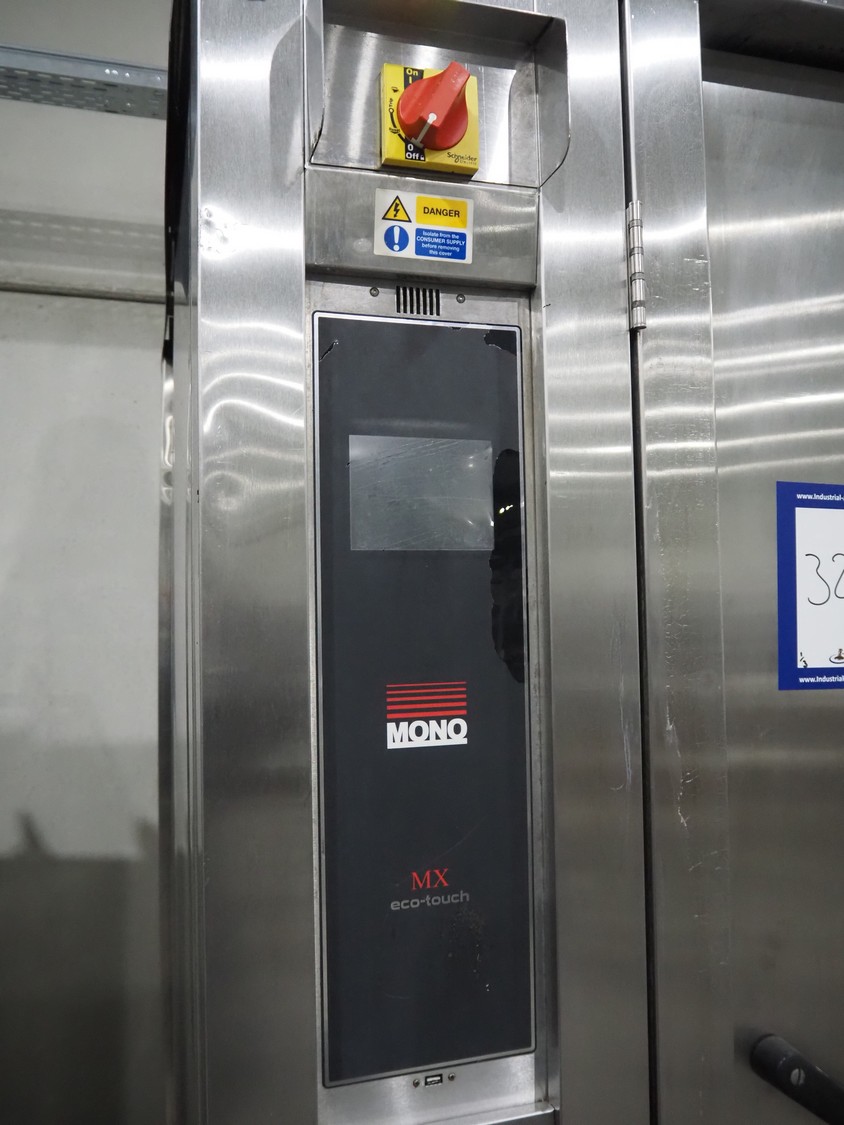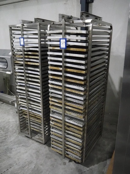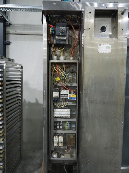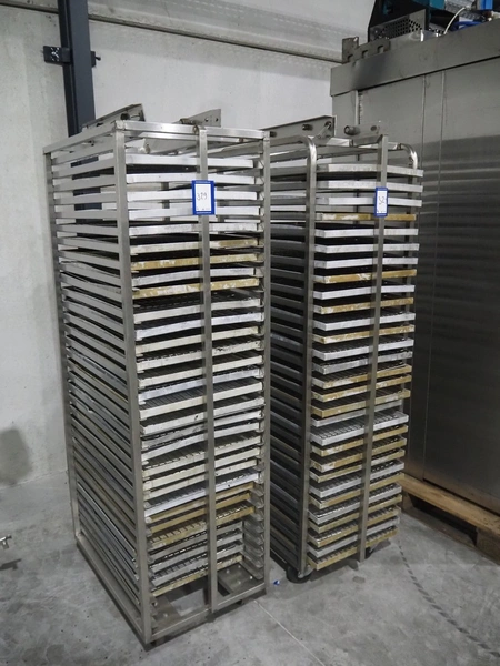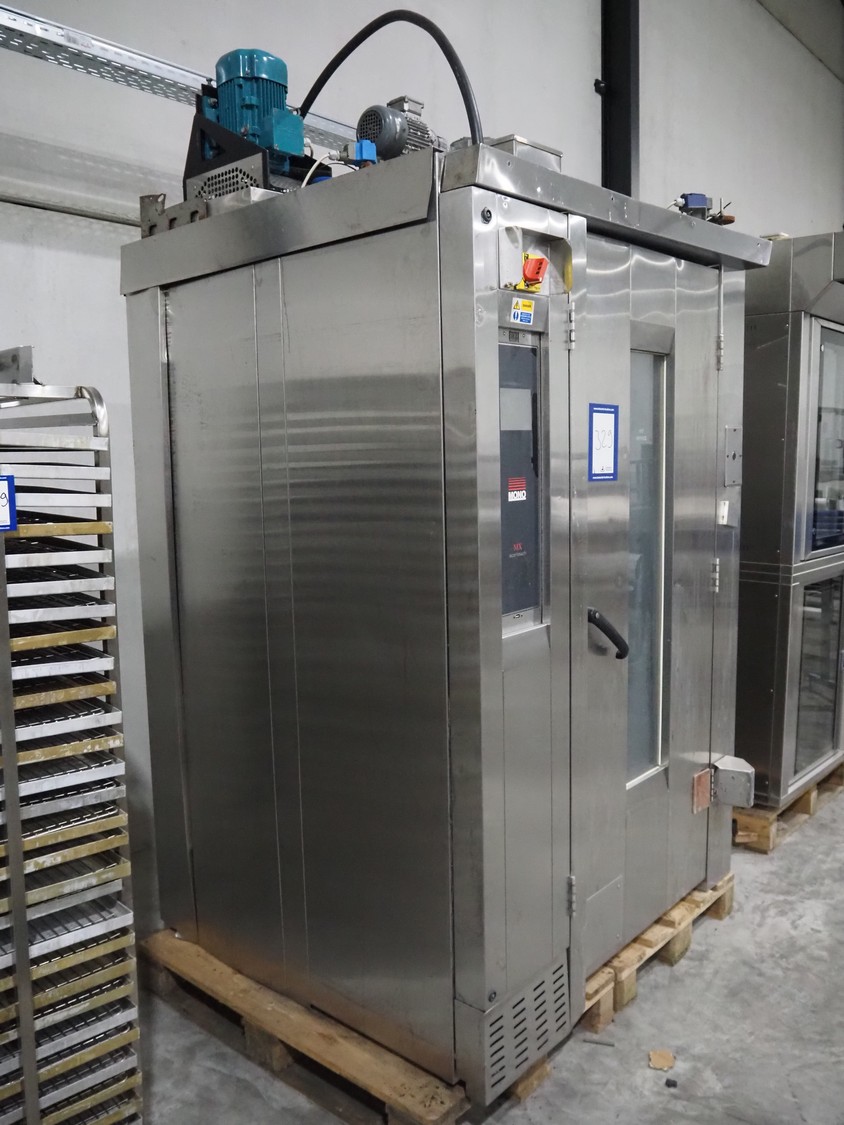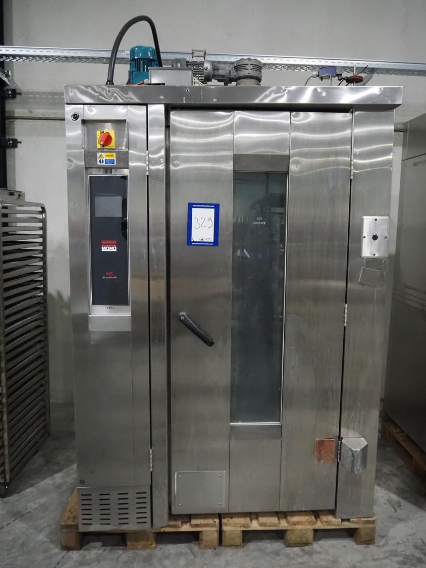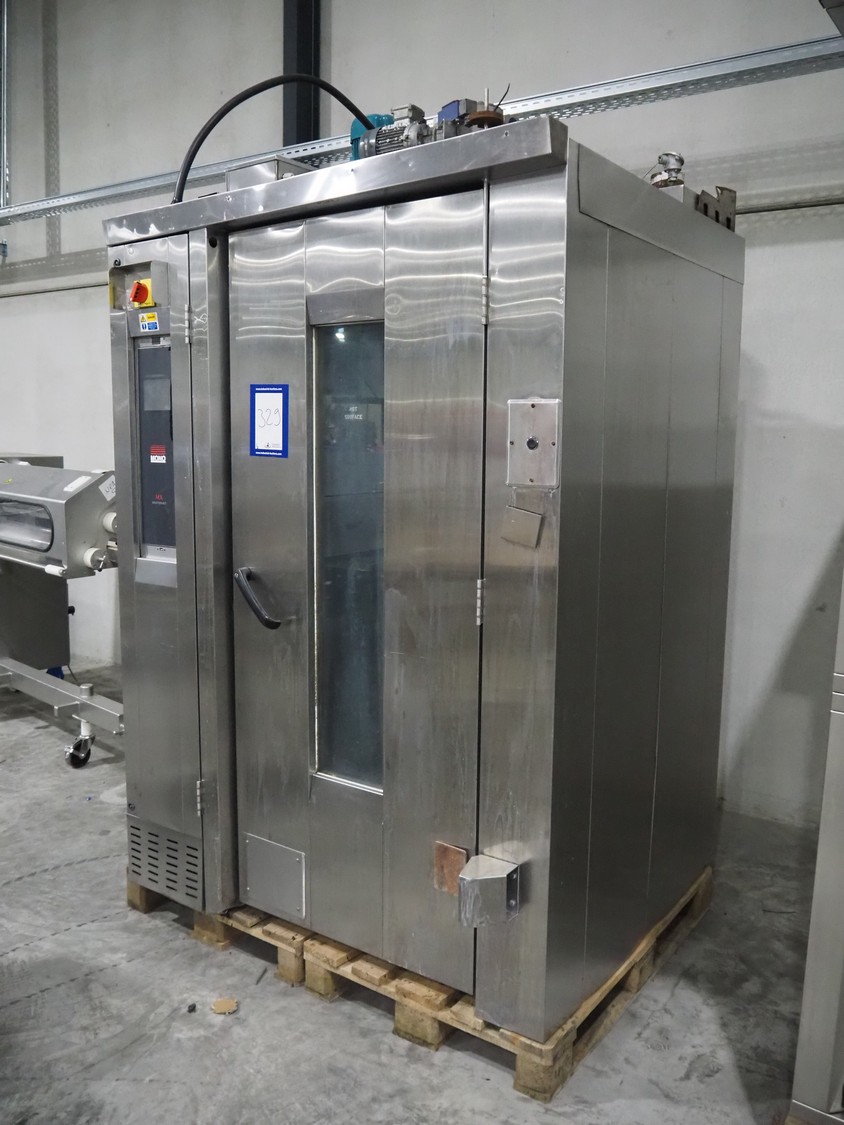 Mono rotary oven with 2 trolleys, inside dimensions: 950 mm x 950 mm x 1950 mm, total dimensions: 1500 mm x 1350 mm x 2600 mm. 2 s/s trolleys, 32 floors, floor dimensions: (32x) 760 mm x 460 mm, total dimensions: (2x) 770 mm x 530 mm x 1830 mm.