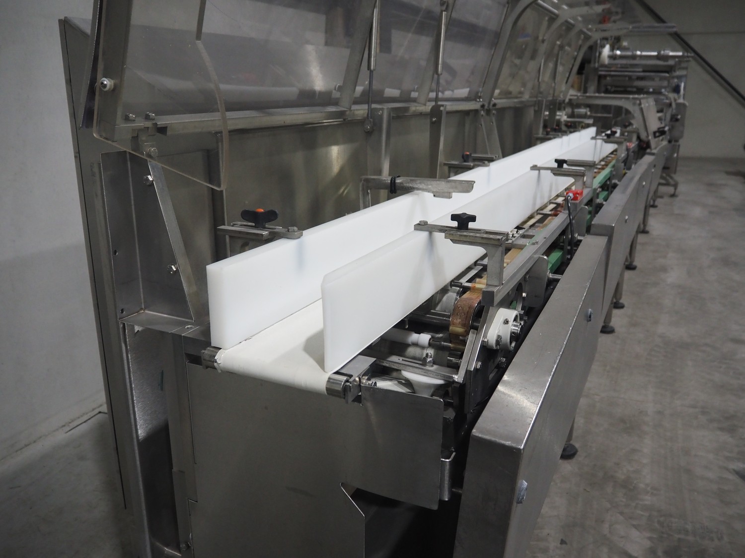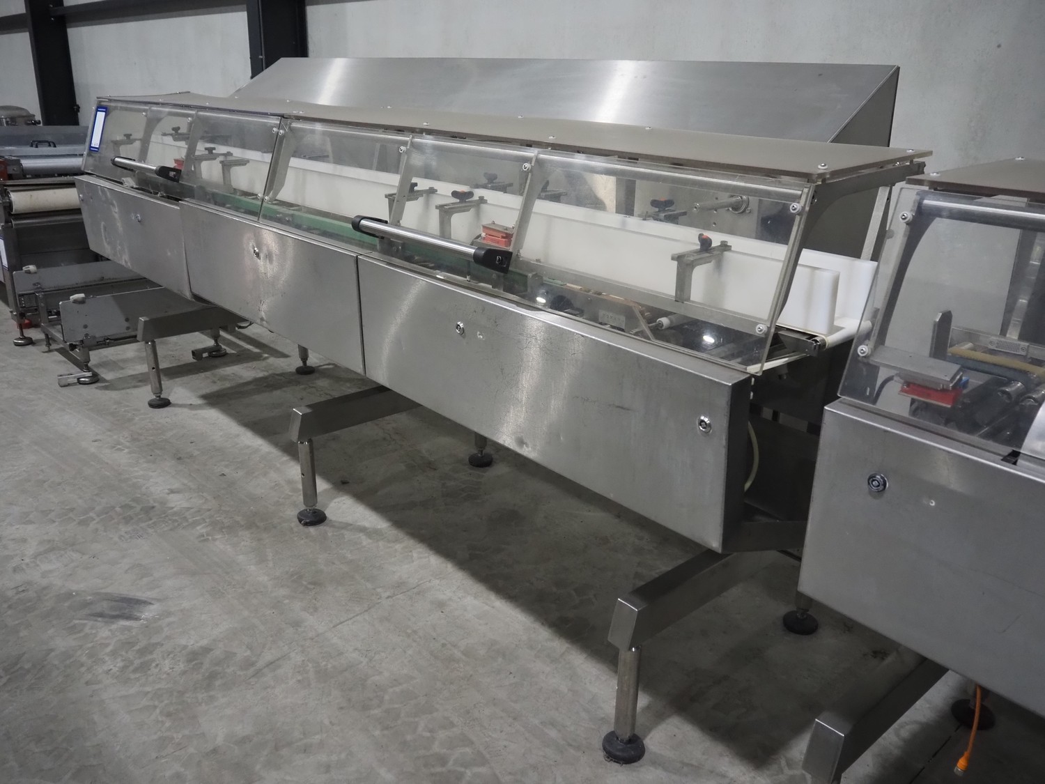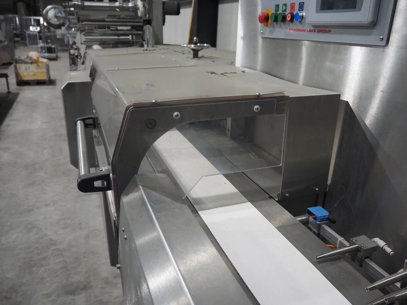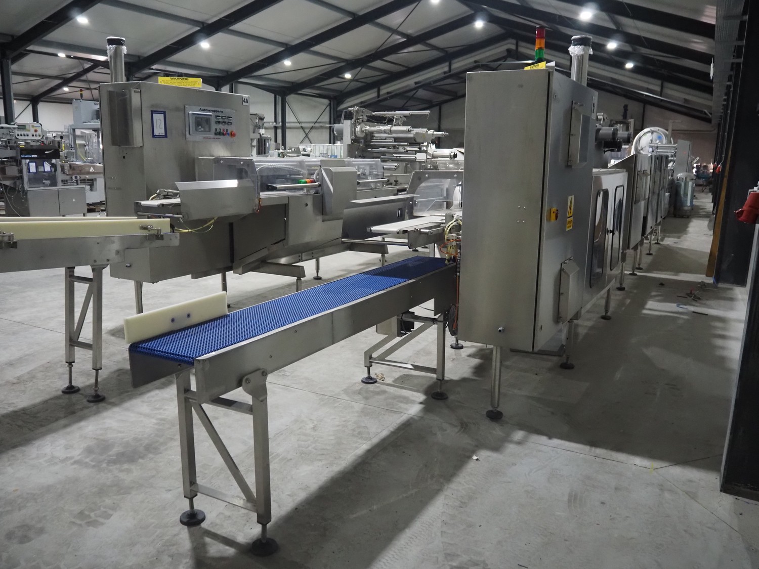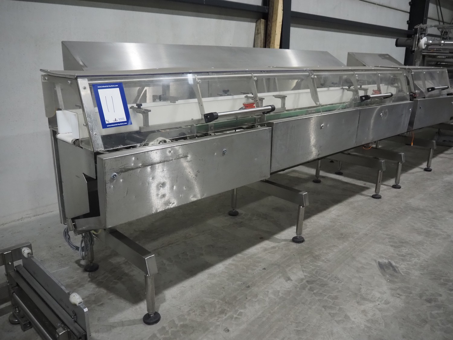Bradman Lake Group dual feed flow packer, machine type: FT120CLX, serial number: 7098, year of construction: 2006, 415 V, 3 Ph, 50 Hz, 10 kW, plastic belt with dividers, belt width: (2x) 40 mm, divider height: 35 mm, distance between dividers: 300 mm, seal width: 230 mm, total dimensions: 5750 mm x 1200 mm x 2500 mm. Including infeed and outfeed belt, plastic infeed belt , belt width: 160 mm, total dimension: 3500 mm x 980 mm x 1550 mm. plastic outfeed belt, plastic mesh belt, belt width: 300 mm, total dimensions: 2600 mm x 600 mm x 1250 mm.
