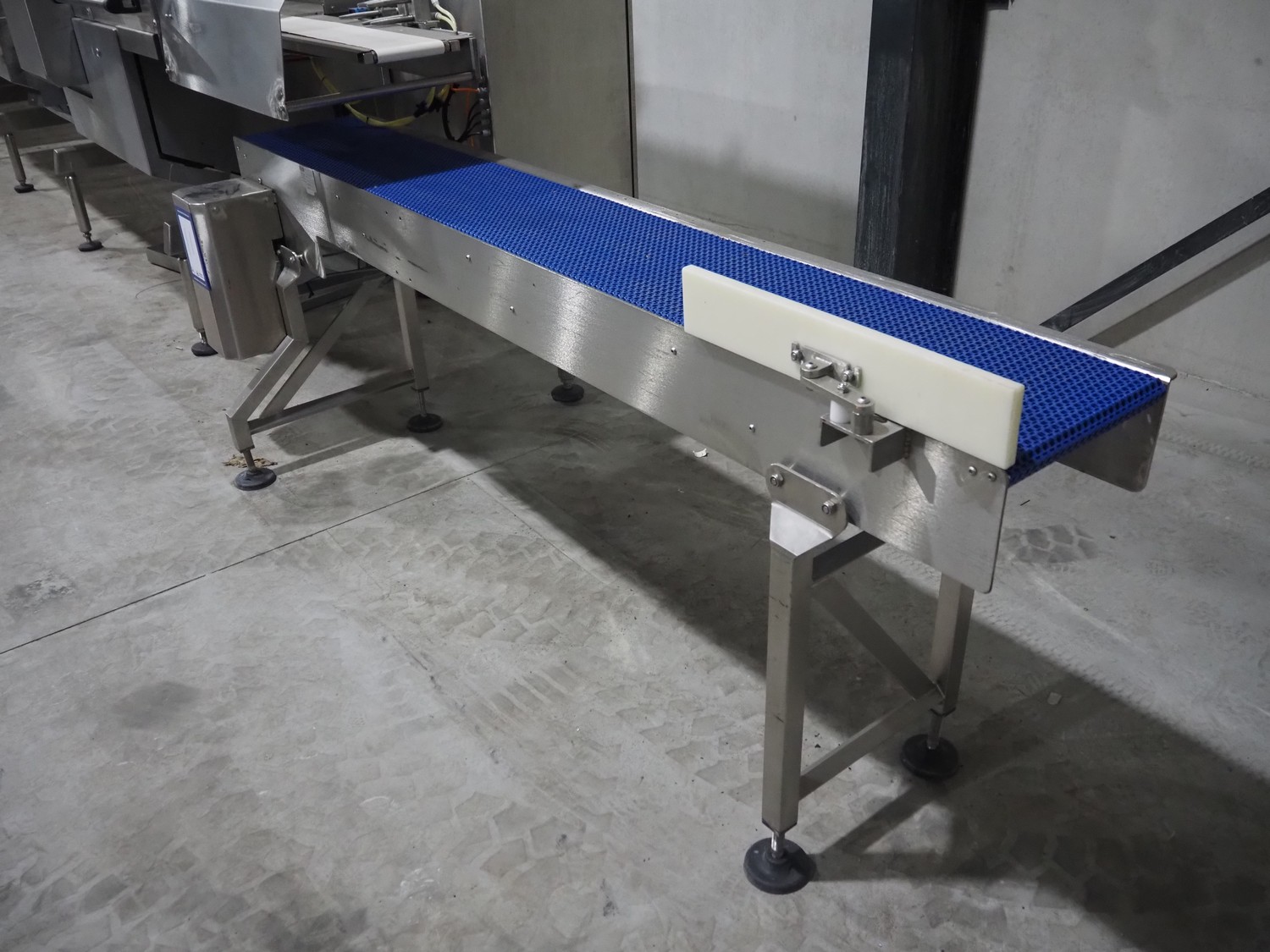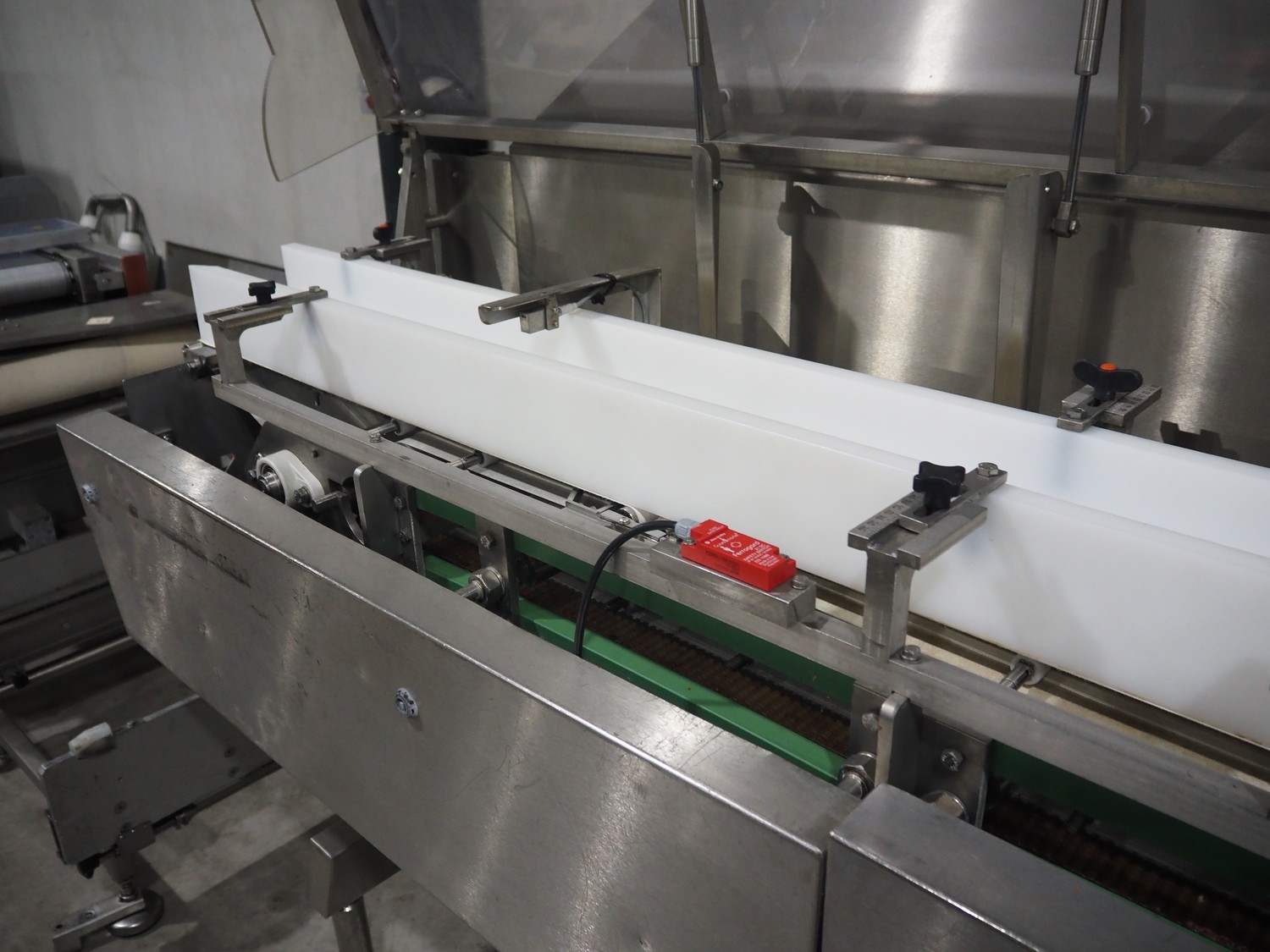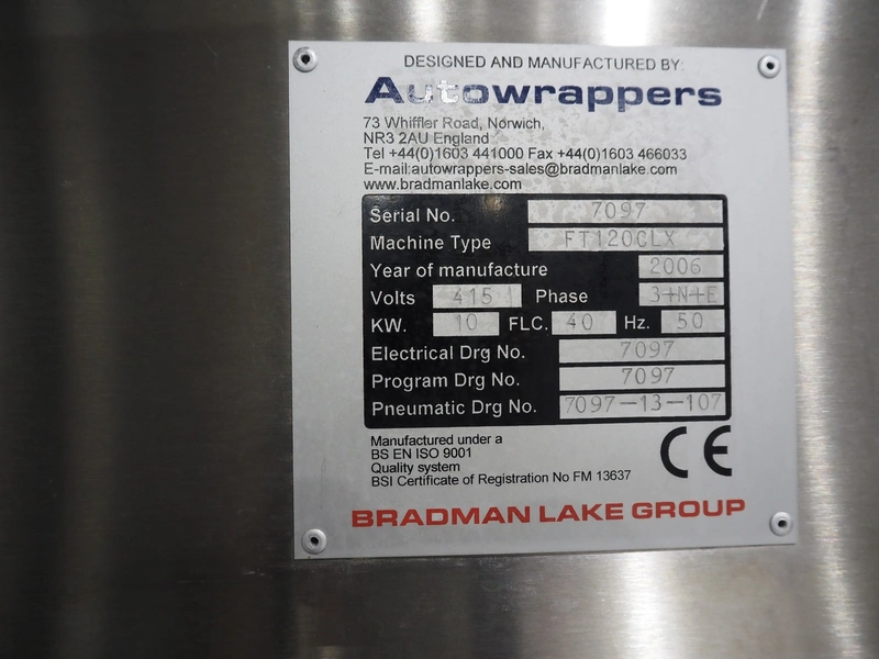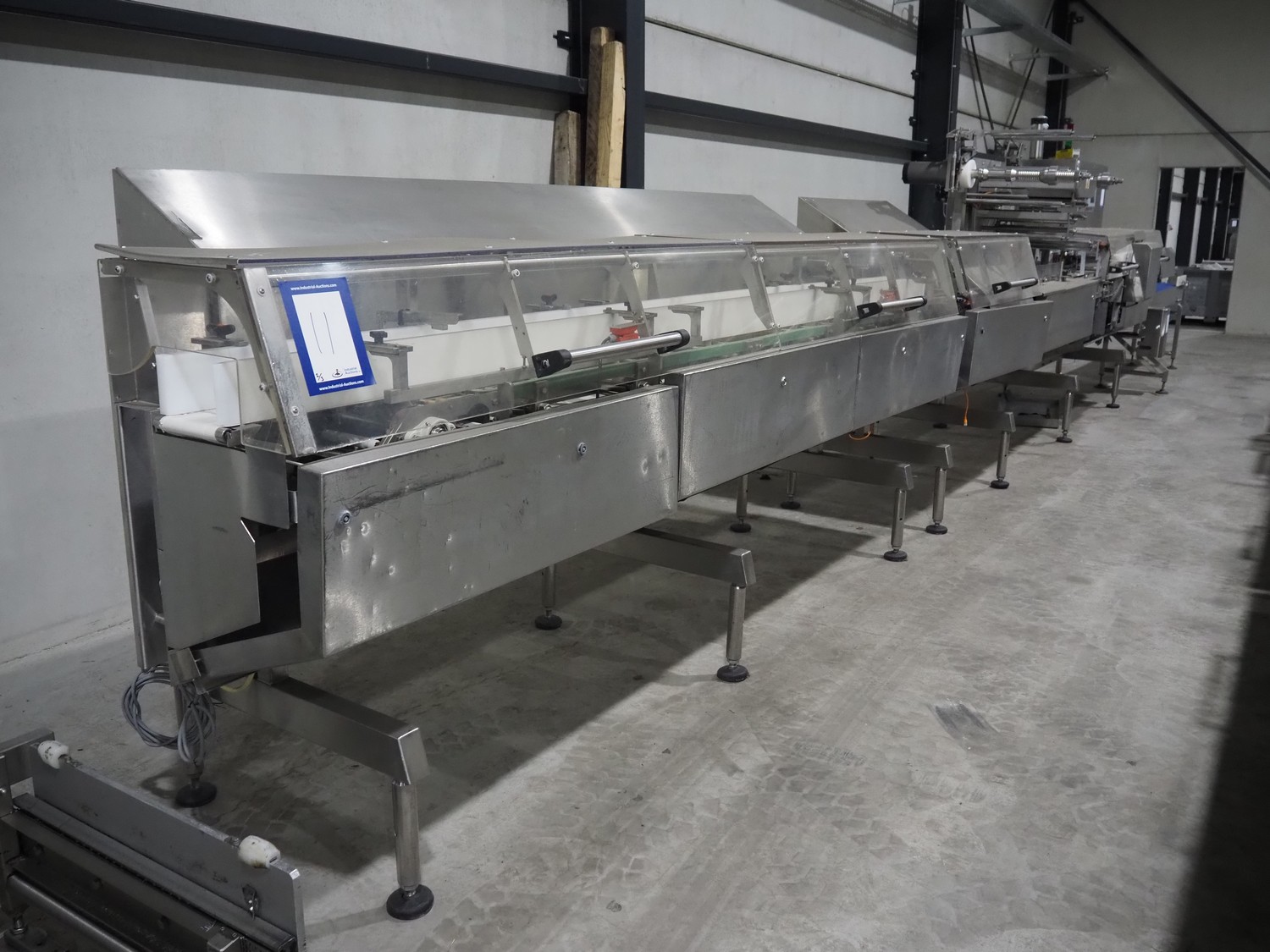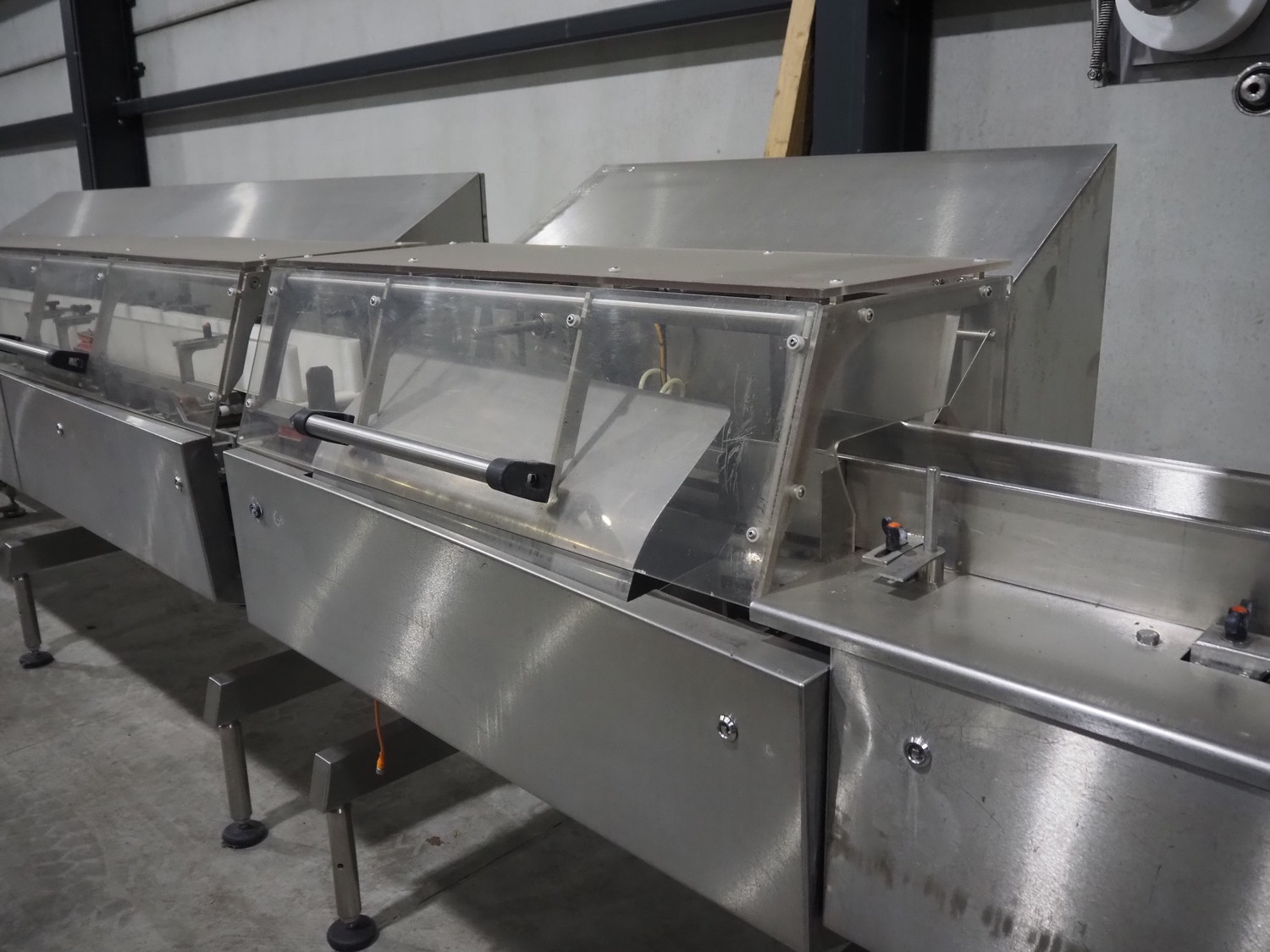 Bradman Lake Group dual feed flow packer, machine type: FT120CLX, serial number: 7098, year of construction: 2006, 415 V, 3 Ph, 50 Hz, 10 kW, plastic belt with dividers, belt width: (2x) 40 mm, divider height: 35 mm, distance between dividers: 300 mm, seal width: 230 mm, total dimensions: 5750 mm x 1200 mm x 2500 mm. Including infeed and outfeed belt, plastic infeed belt , belt width: 160 mm, total dimension: 3500 mm x 980 mm x 1550 mm. plastic outfeed belt, plastic mesh belt, belt width: 300 mm, total dimensions: 2600 mm x 600 mm x 1250 mm.