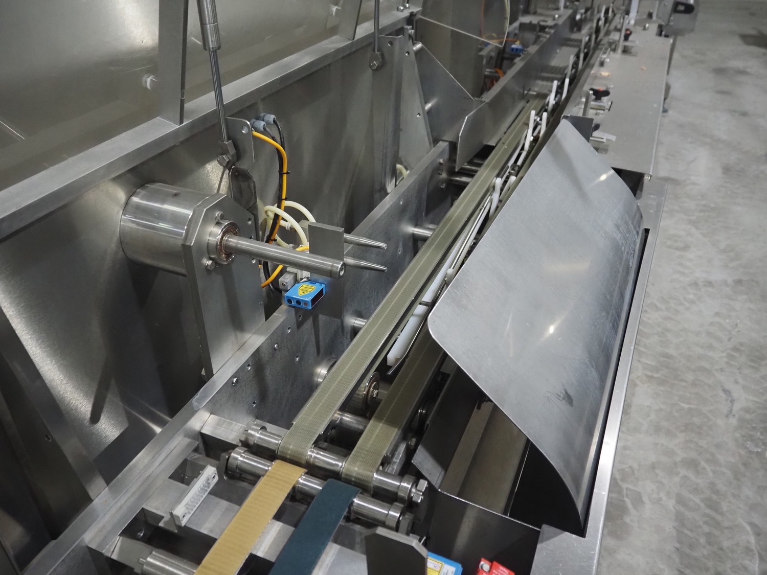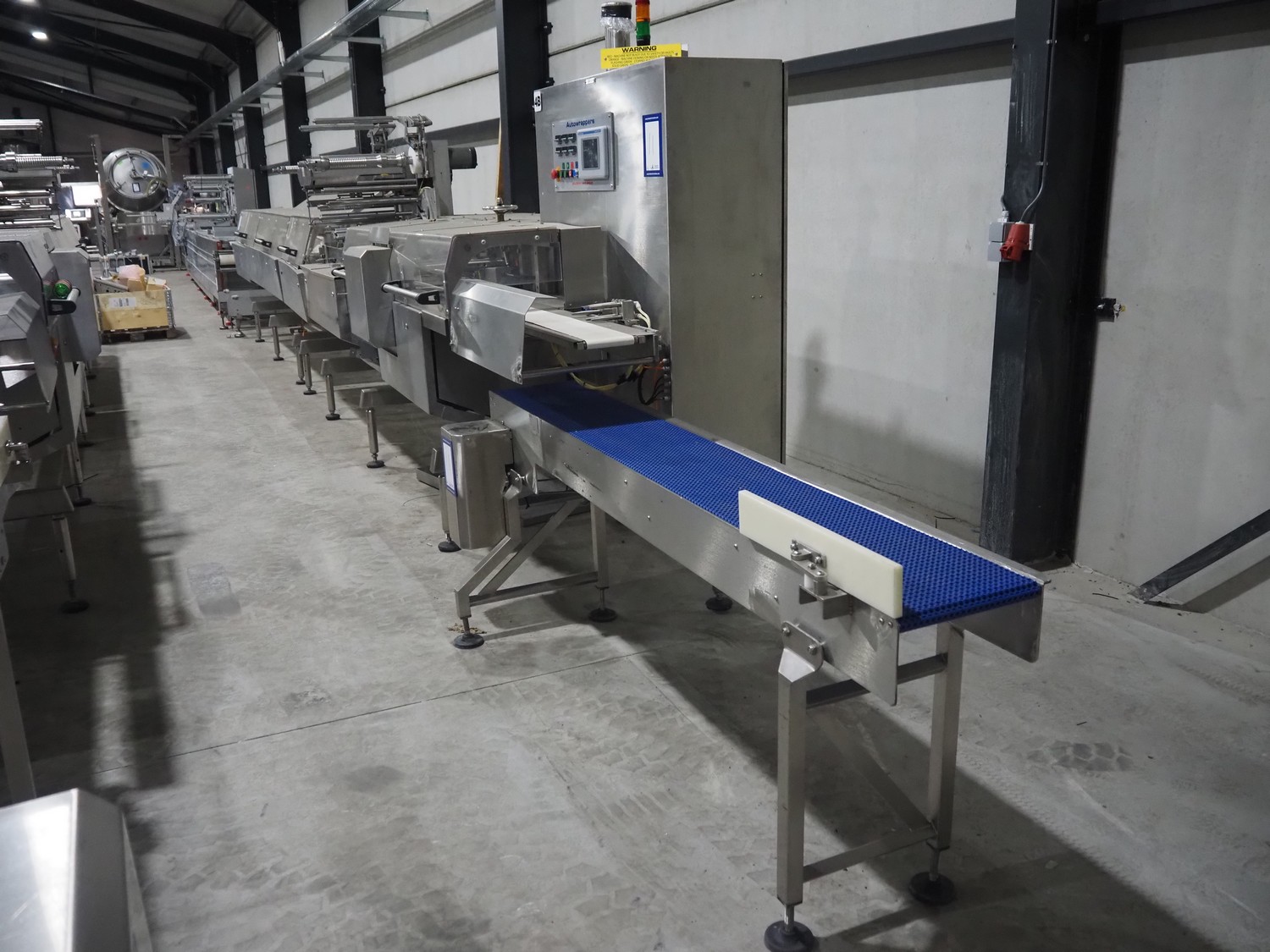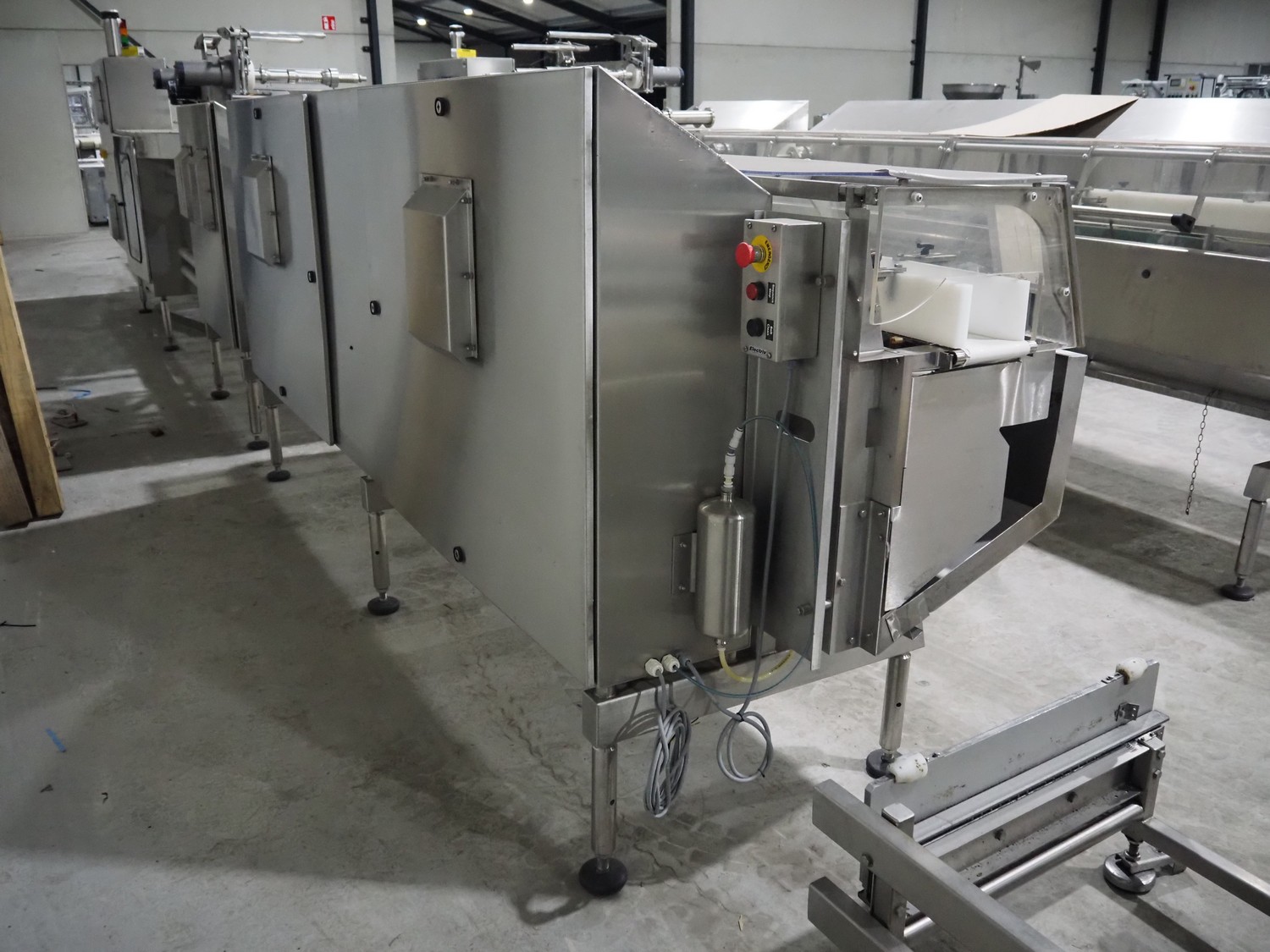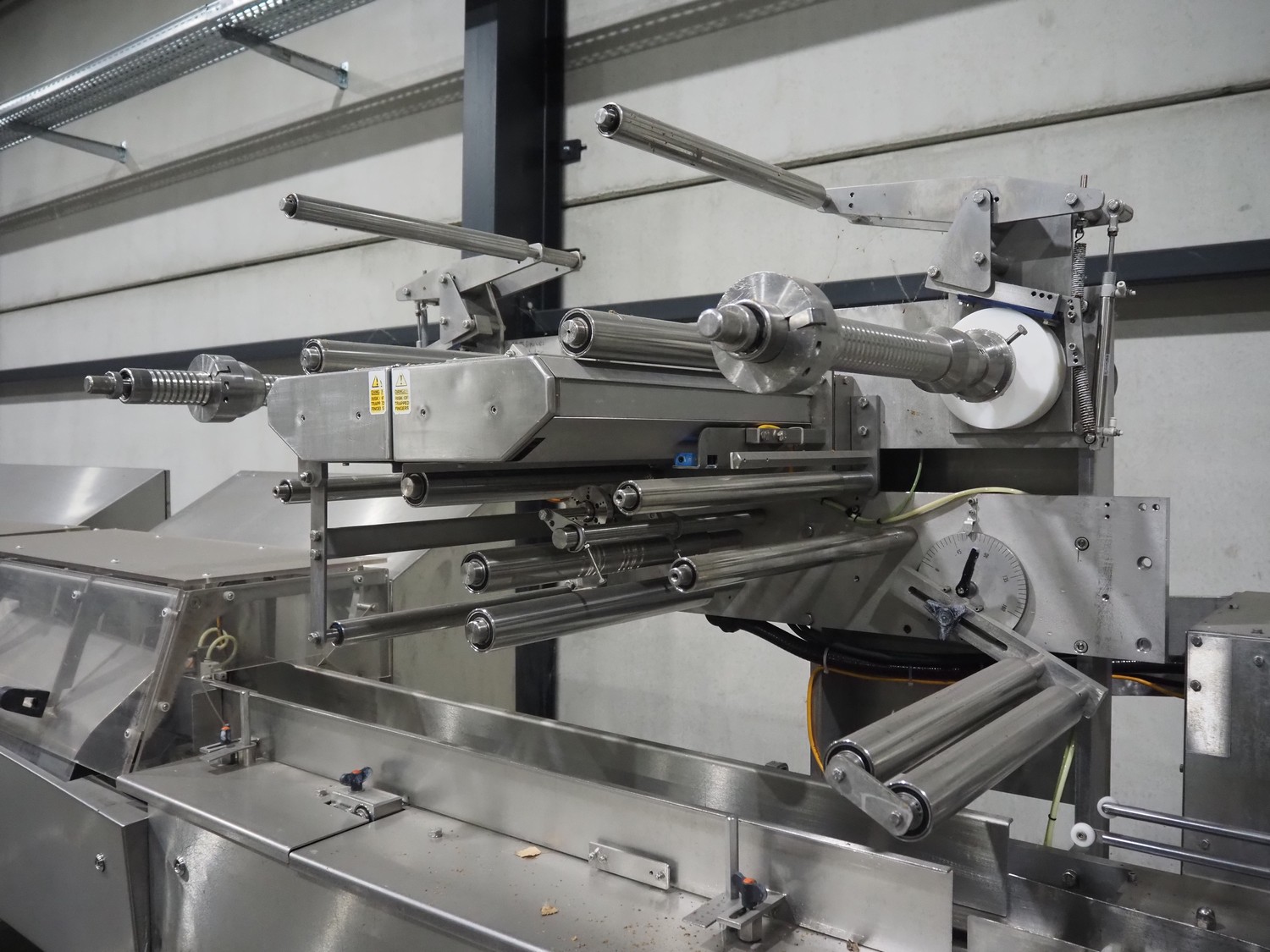 Bradman Lake Group dual feed flow packer, machine type: FT120CLX, serial number: 7098, year of construction: 2006, 415 V, 3 Ph, 50 Hz, 10 kW, plastic belt with dividers, belt width: (2x) 40 mm, divider height: 35 mm, distance between dividers: 300 mm, seal width: 230 mm, total dimensions: 5750 mm x 1200 mm x 2500 mm. Including infeed and outfeed belt, plastic infeed belt , belt width: 160 mm, total dimension: 3500 mm x 980 mm x 1550 mm. plastic outfeed belt, plastic mesh belt, belt width: 300 mm, total dimensions: 2600 mm x 600 mm x 1250 mm.