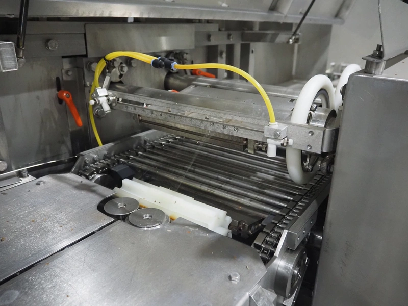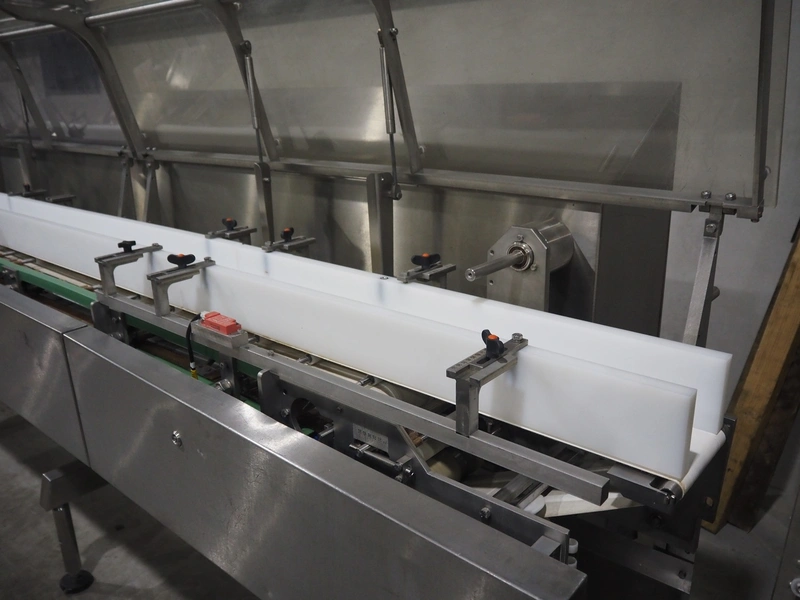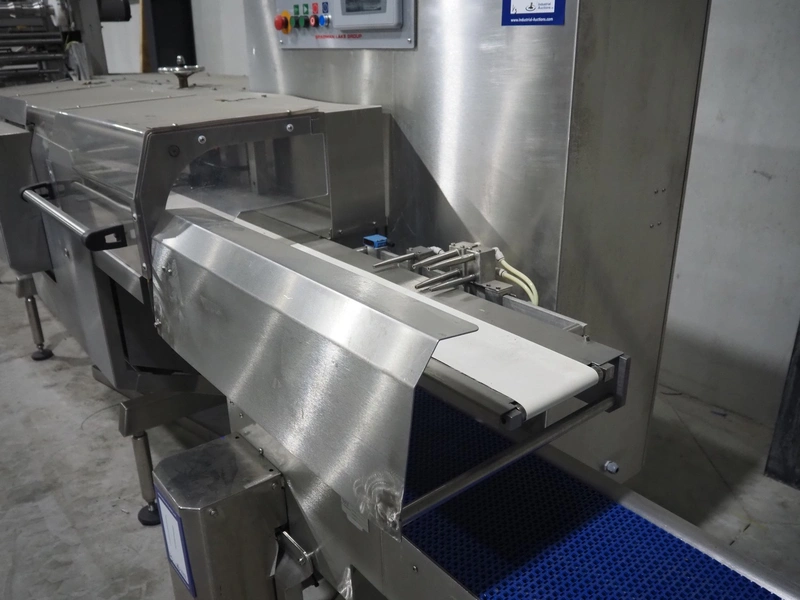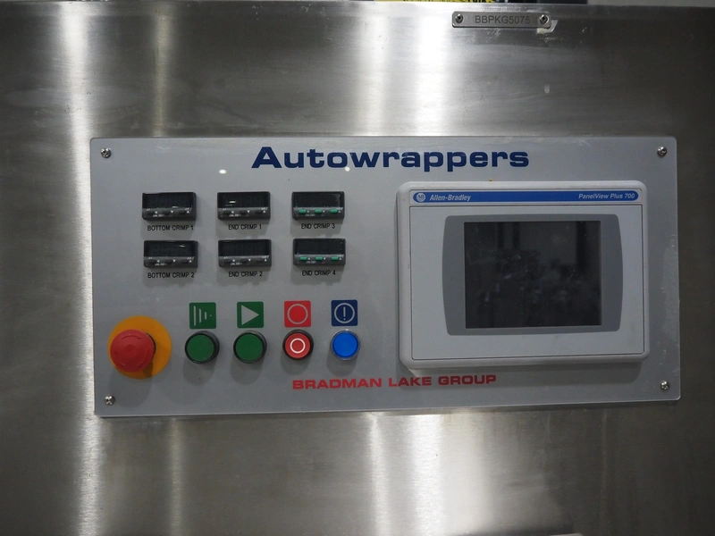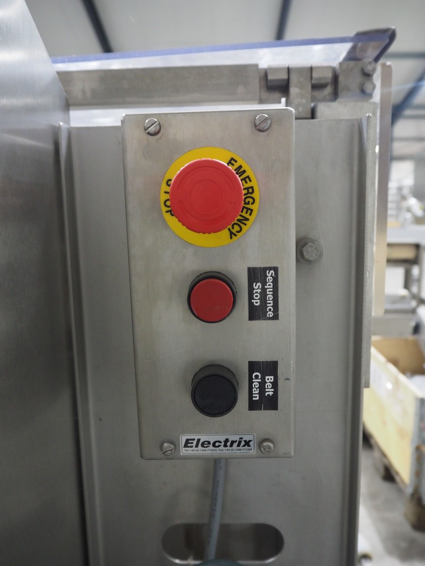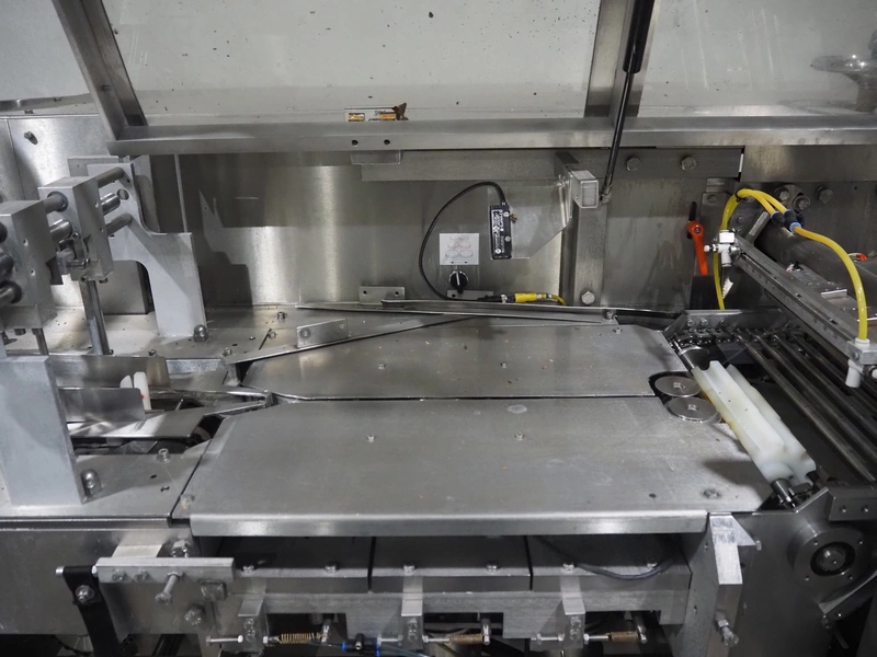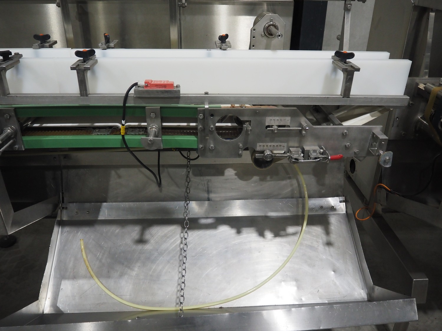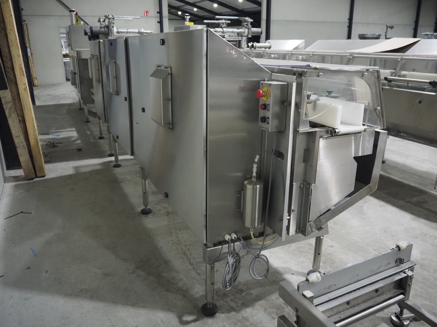 Bradman Lake Group dual feed flow packer, machine type: FT120CLX, serial number: 7098, year of construction: 2006, 415 V, 3 Ph, 50 Hz, 10 kW, plastic belt with dividers, belt width: (2x) 40 mm, divider height: 35 mm, distance between dividers: 300 mm, seal width: 230 mm, total dimensions: 5750 mm x 1200 mm x 2500 mm. Including infeed and outfeed belt, plastic infeed belt , belt width: 160 mm, total dimension: 3500 mm x 980 mm x 1550 mm. plastic outfeed belt, plastic mesh belt, belt width: 300 mm, total dimensions: 2600 mm x 600 mm x 1250 mm.