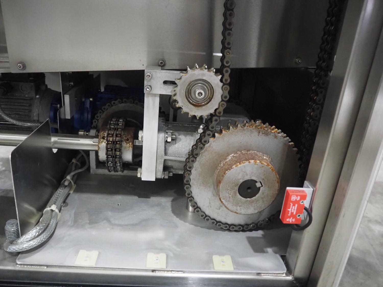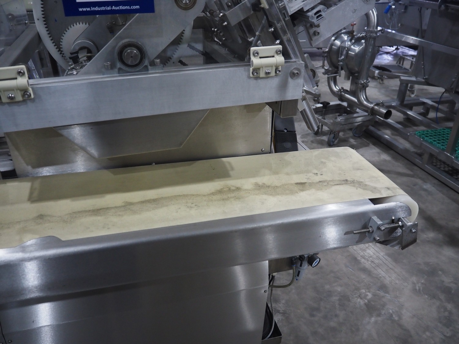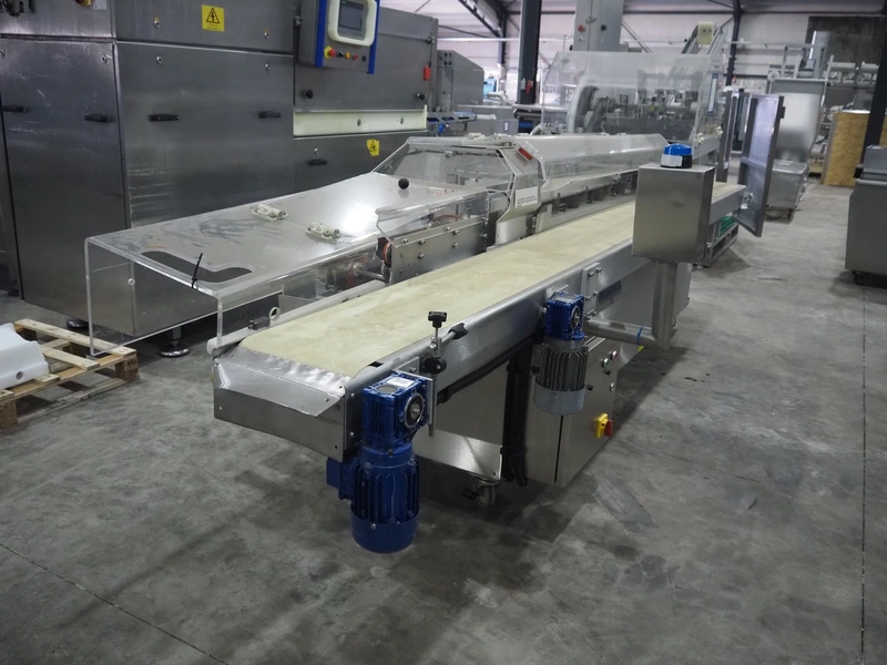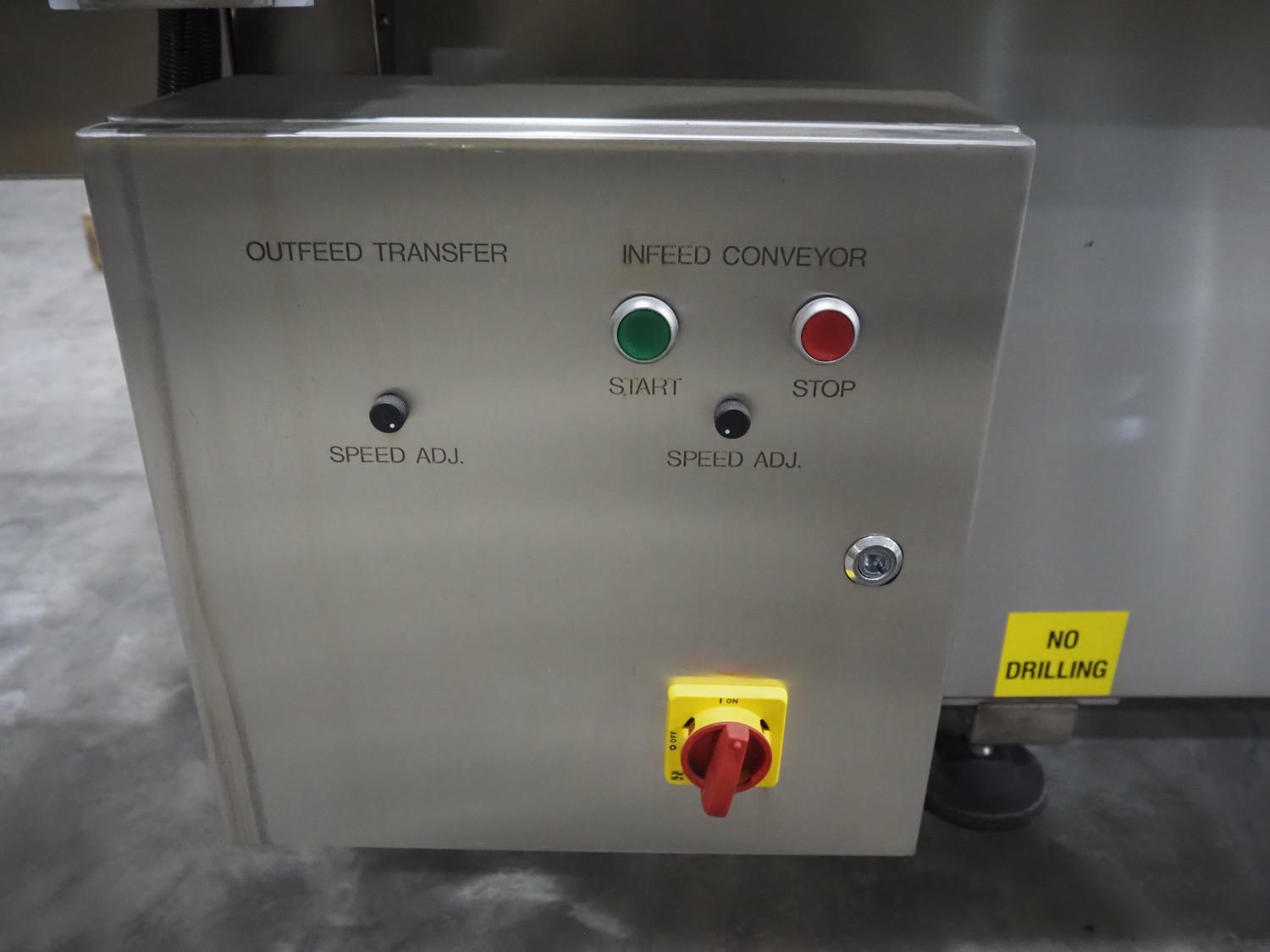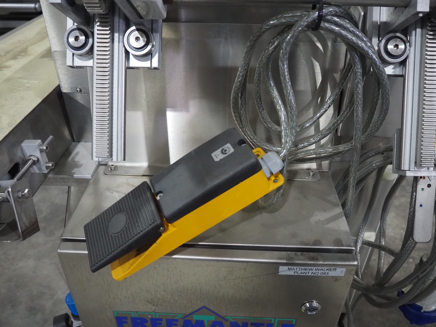 T. Freemantle Ltd. mobile semi automatic pre-glued sleever, model: S11, serial number: 03-178, year of construction: 03/2004, 240 V, 1 Ph, plastic belt, belt width: 250 mm, total dimensions: 4200 mm x 1200 mm x 1700 mm.