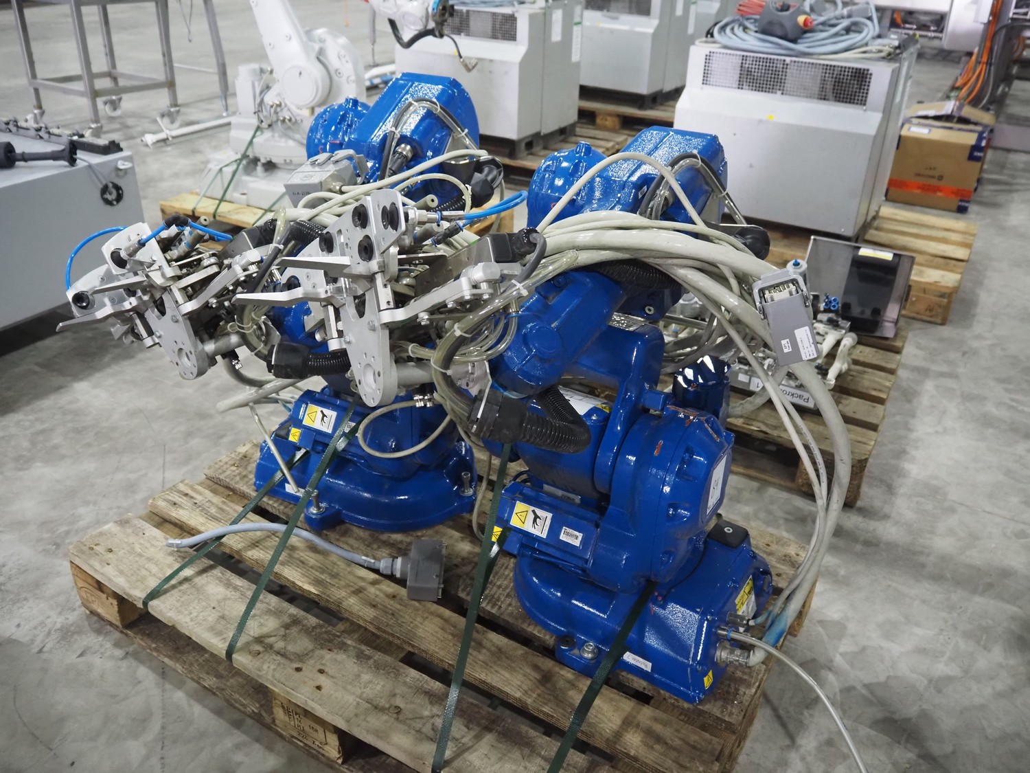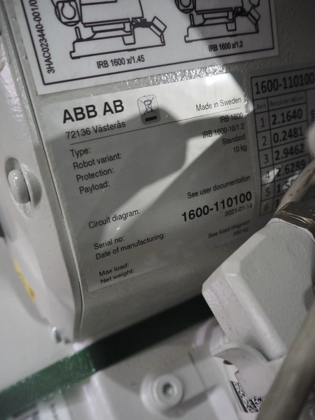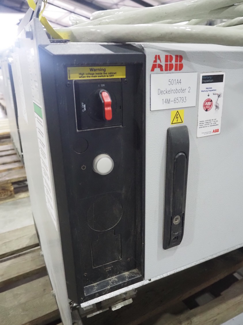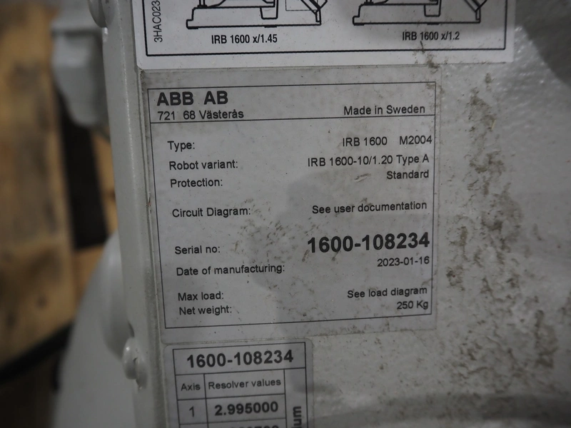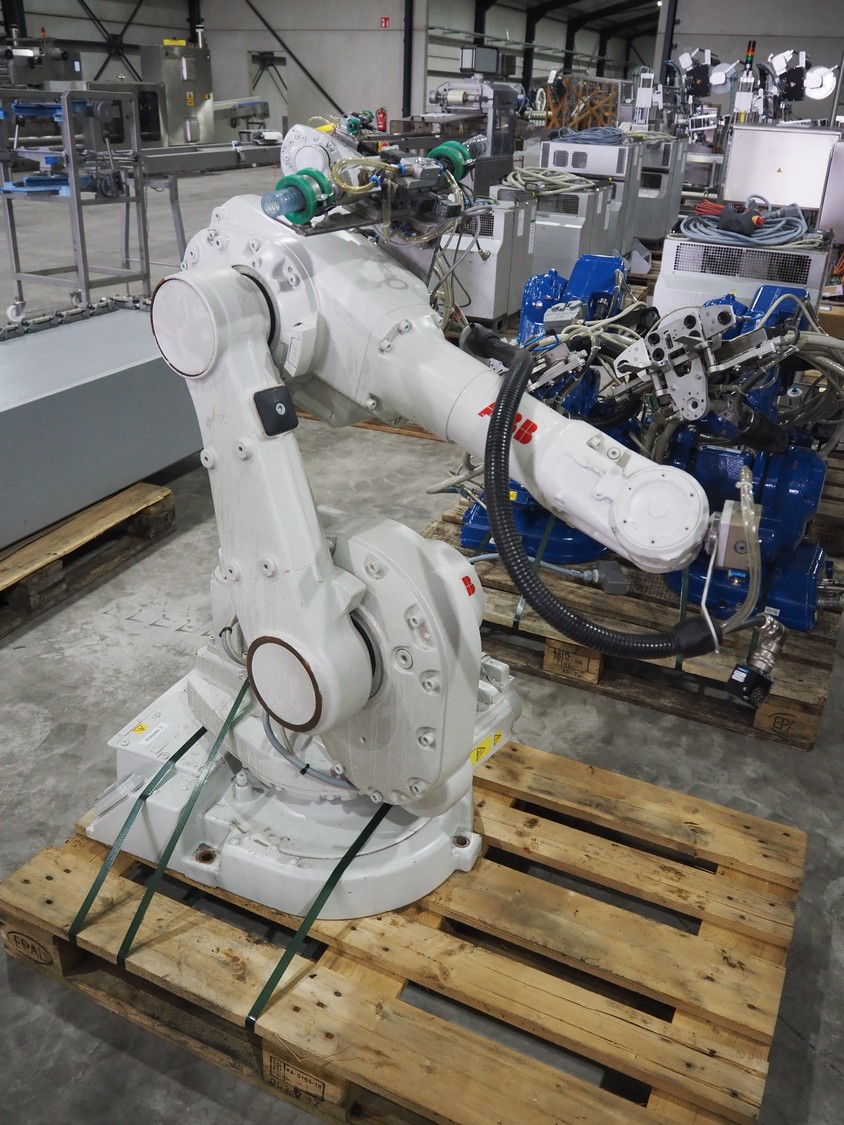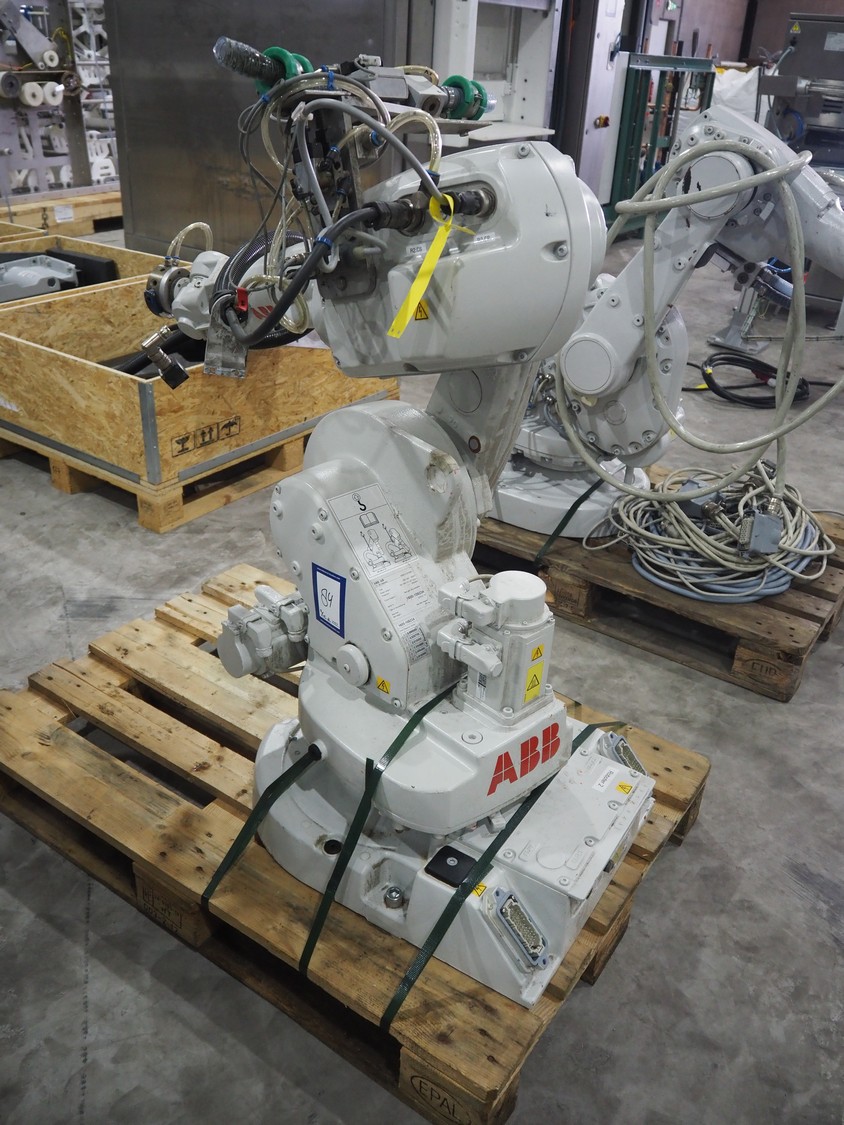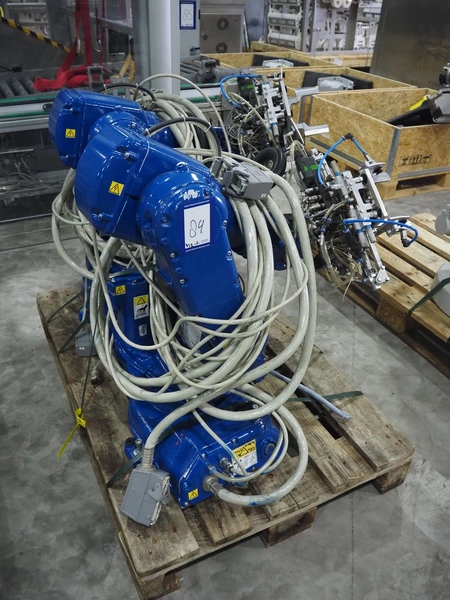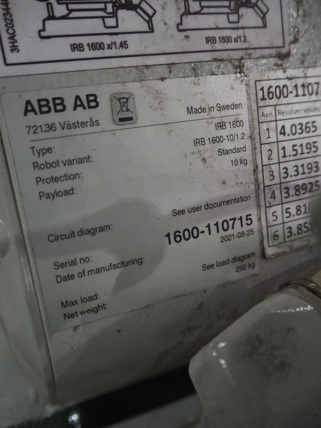 5 ABB AB robot arms, type: (3x) IRB 1600, robot variant: IRB 1600-10/1.2, year of construction: 01/2021 kg, payload: 10 kg, net weight: 250 kg, dimensions: 1400 mm x 5600 mm x 1100 mm, type (2x) IRB 140 M2004, robot variant: IRB 140 T-6/0.8, year of construction: 10/2012, net weight: 98 kg, dimensions: 800 mm x 450 mm x 810 mm, power unit, dimensions: 2850 mm x 800 mm x 500 mm, 5 robot controllers, type: IRC5 M2004, year of construction: 130 kg, year of construction: 10/2012.