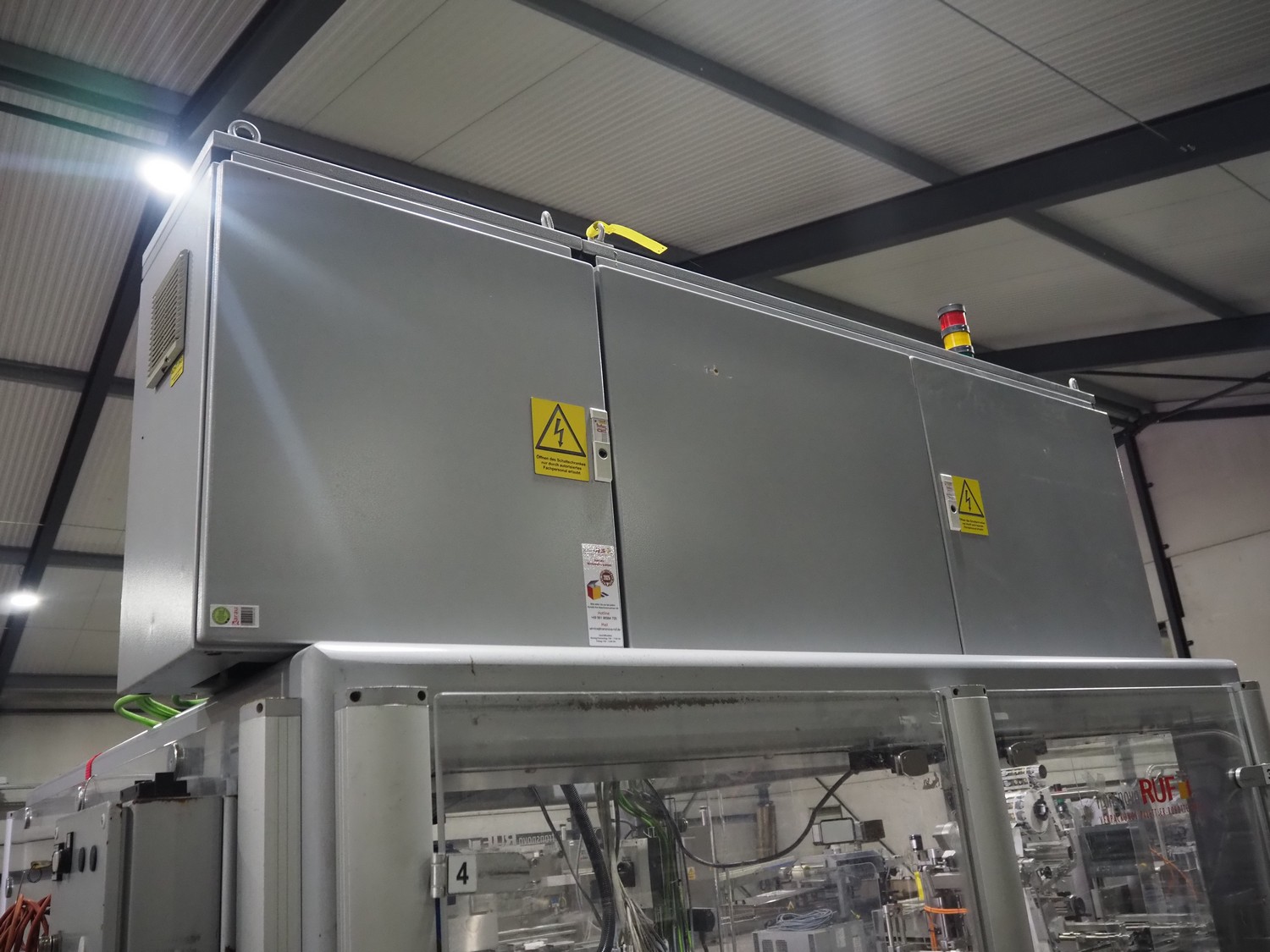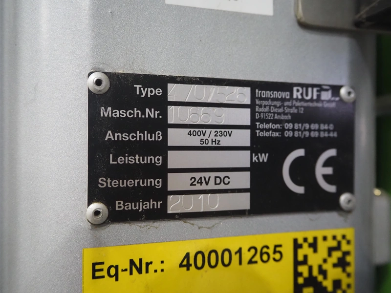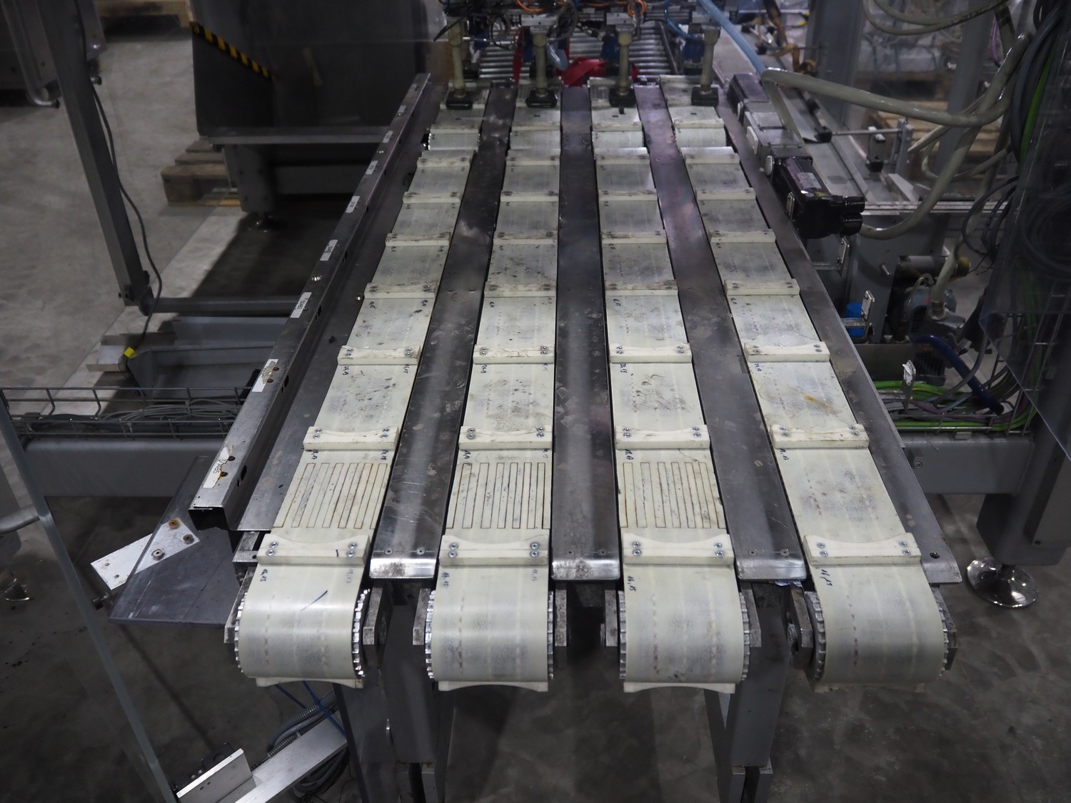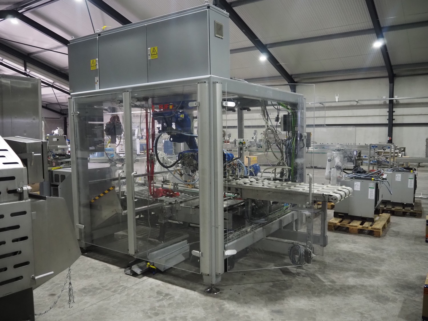Transnova RUF robot palletizer, type: 470/526, machine number: 10669, year of construction: 2010, 4 lanes, plastic belt, belt width: (4x) 100 mm (1x) 400 mm, distance between dividers: 140 mm, divider height: 2 mm, steel rollers, roller width: 750 mm, Busch vacuum pump, type: SV 1040 C 000 INXX, total dimensions: 4000 mm x 2600 mm x 2900 mm. Including 3 Multivac robot arms, type: SR477, serial number: 60177, year of construction: 10/2022, dimensions: (3x) 960 mm x 240 mm x 770 mm.