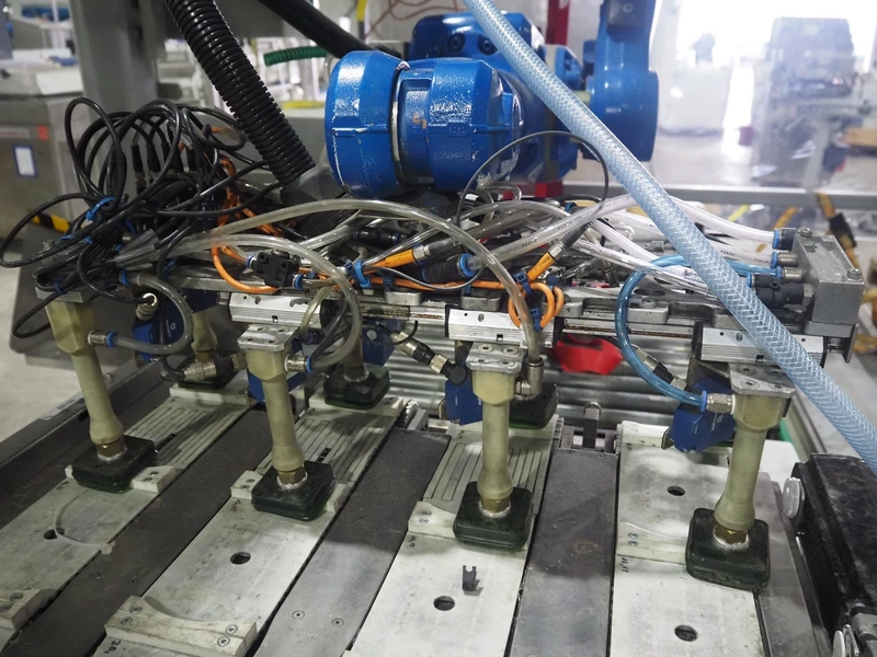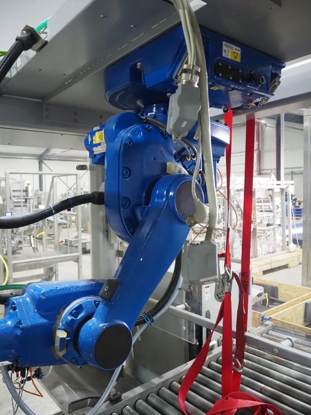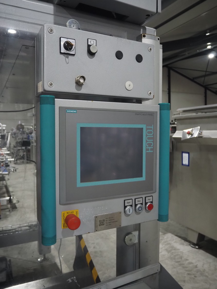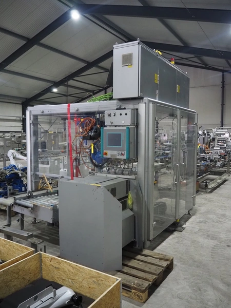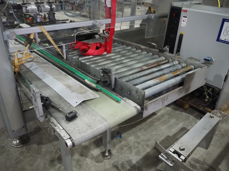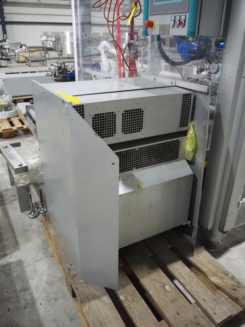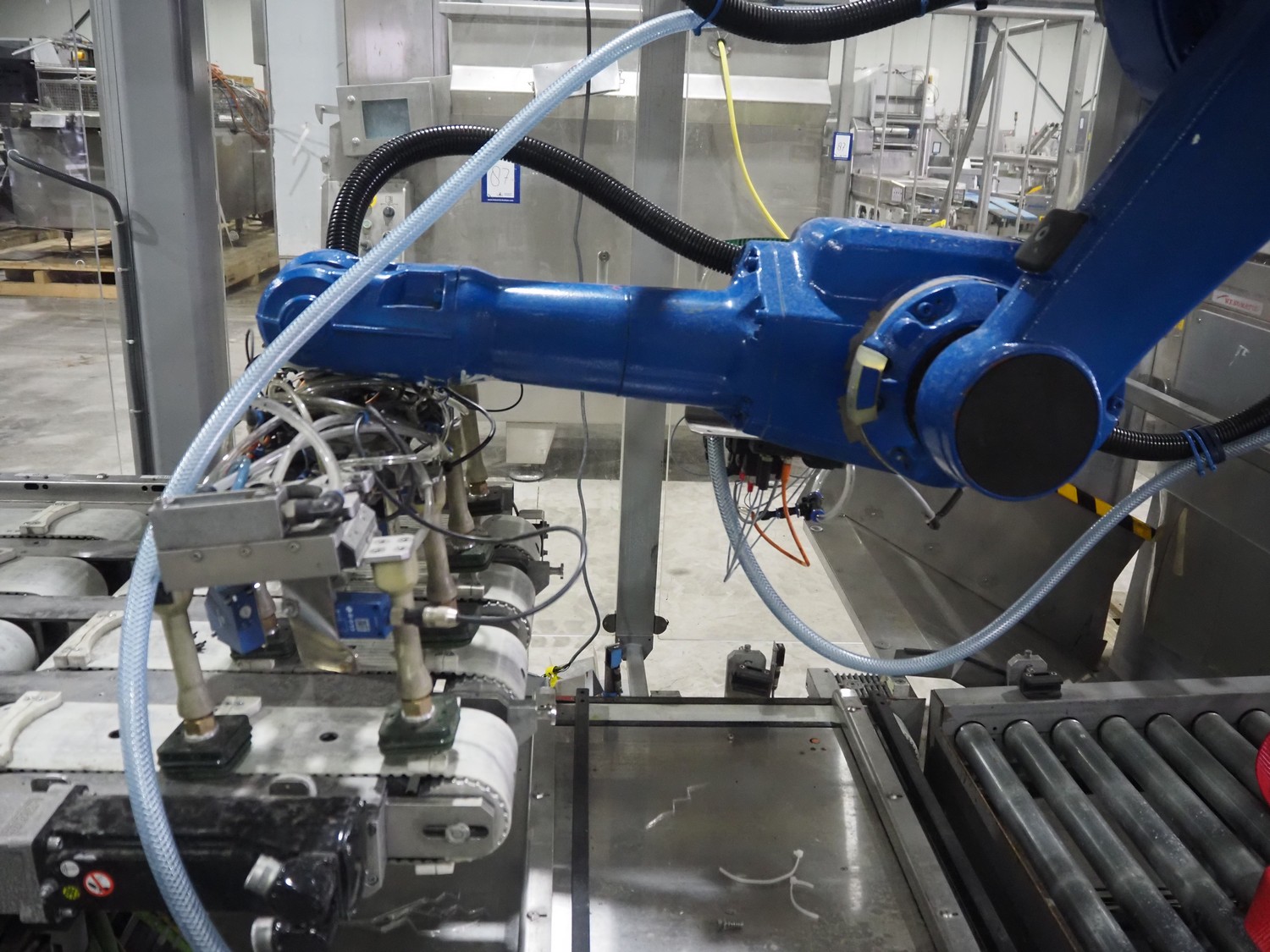 Transnova RUF robot palletizer, type: 470/526, machine number: 10669, year of construction: 2010, 4 lanes, plastic belt, belt width: (4x) 100 mm (1x) 400 mm, distance between dividers: 140 mm, divider height: 2 mm, steel rollers, roller width: 750 mm, Busch vacuum pump, type: SV 1040 C 000 INXX, total dimensions: 4000 mm x 2600 mm x 2900 mm. Including 3 Multivac robot arms, type: SR477, serial number: 60177, year of construction: 10/2022, dimensions: (3x) 960 mm x 240 mm x 770 mm.