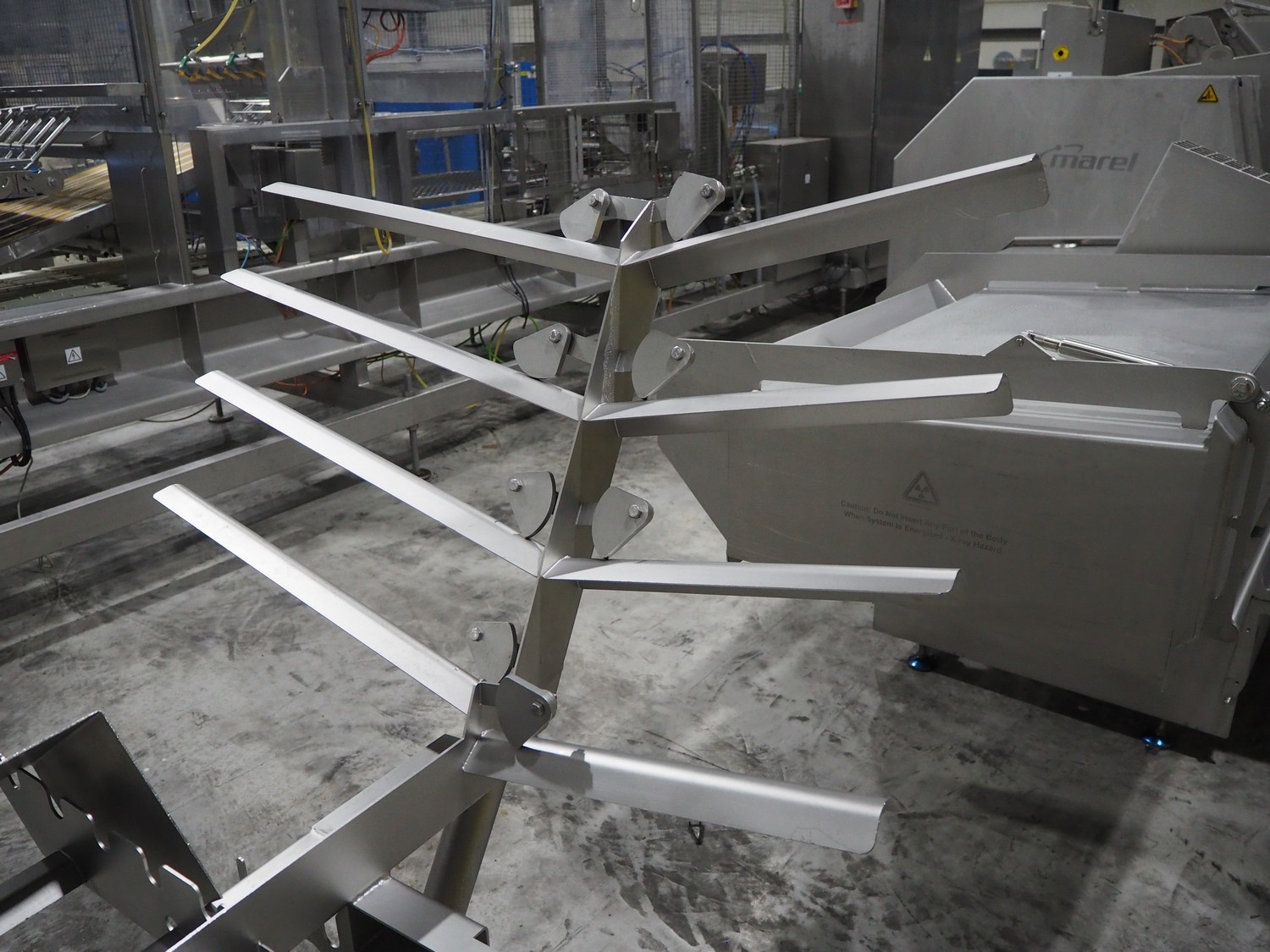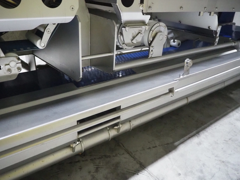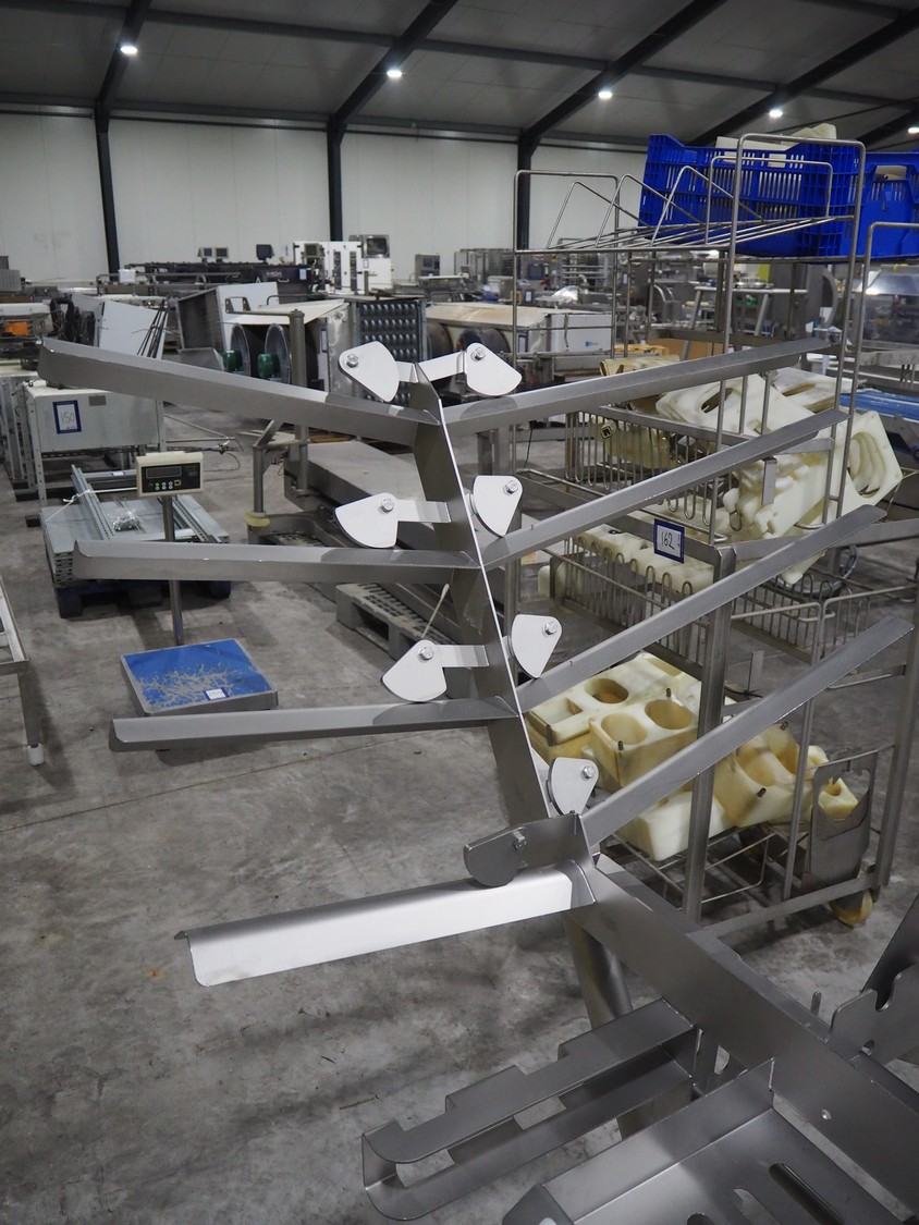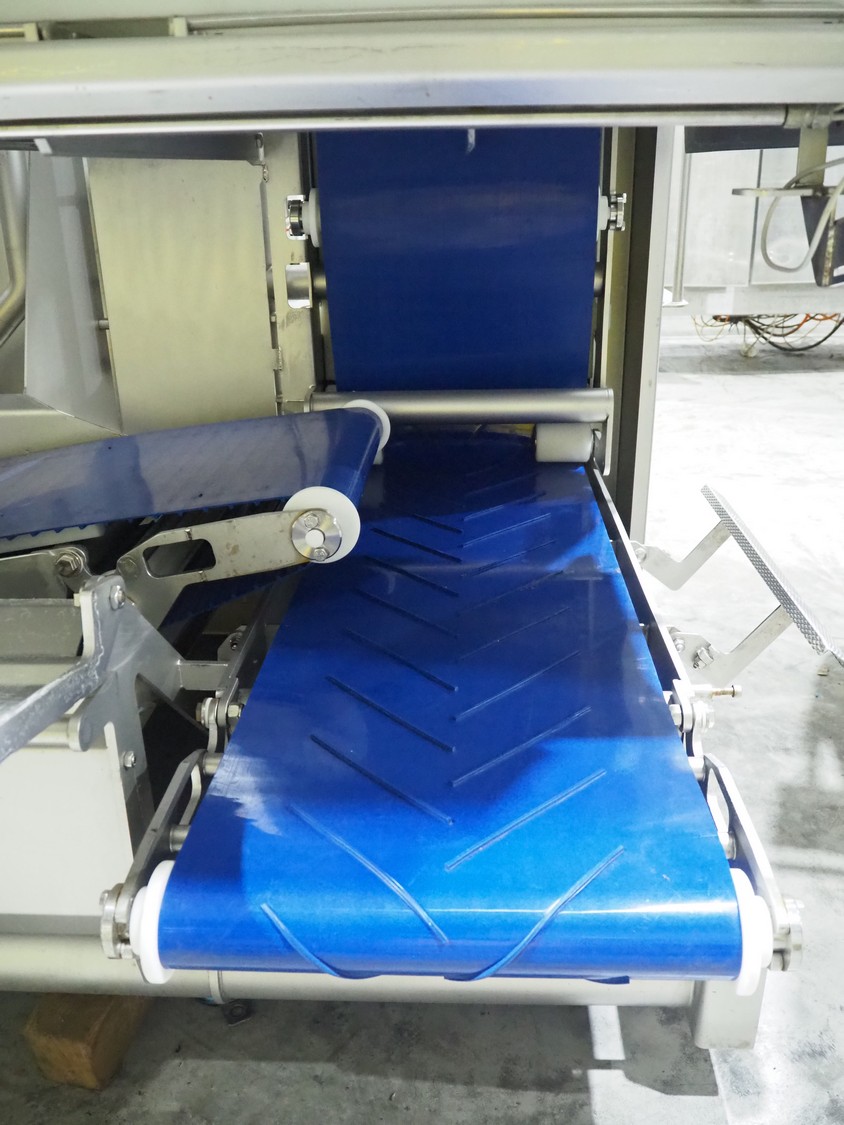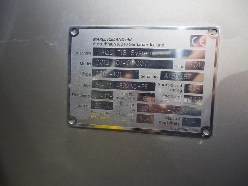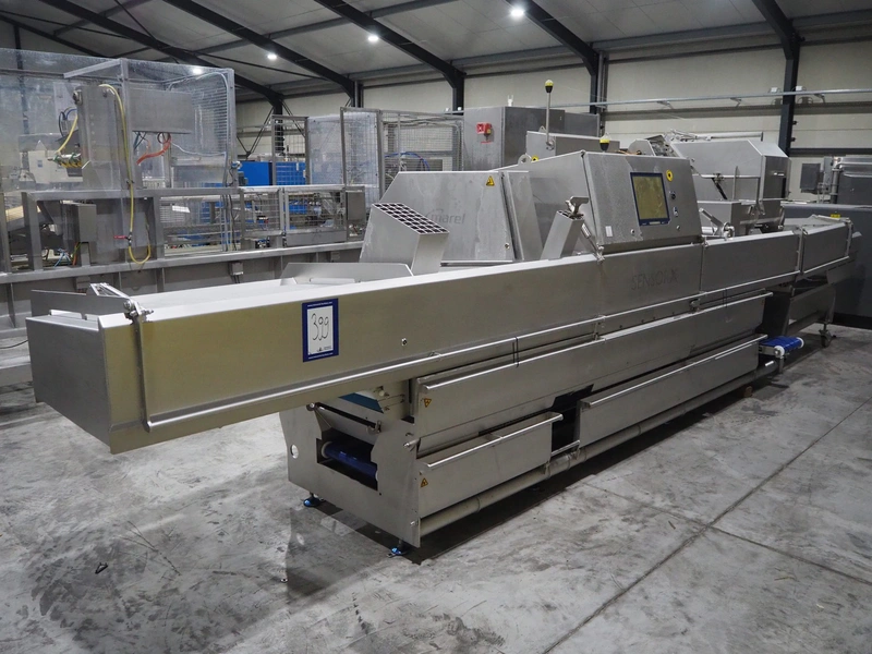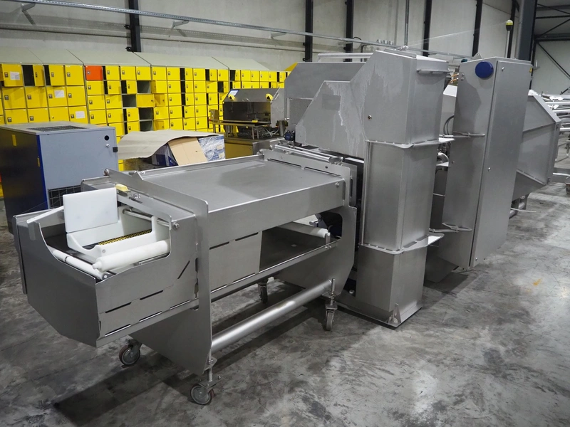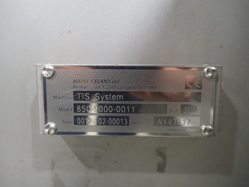 Marel trim inspection and portioning system, model: 850-9000-0011, type: 0012-102-00013, serial number: A143817, year of construction: 2016, plastic infeed belt, belt width: 590 mm, plastic belt, belt width: (2x) 380 mm, plastic mesh belt, belt width: 260 mm and 200 mm, total dimensions: 5150 mm x 1550 mm x 2160 mm. Including outfeed belt, dimensions: 1840 mm x 900 mm x 1180 mm, and 2x trolley for parts, dimensions: 2000 mm x 1150 mm x 1550 mm and 1650 mm x 1450 mm x 980 mm.