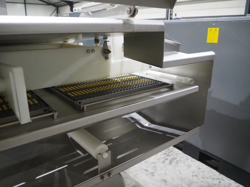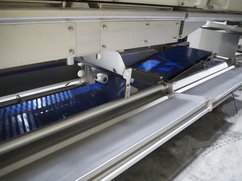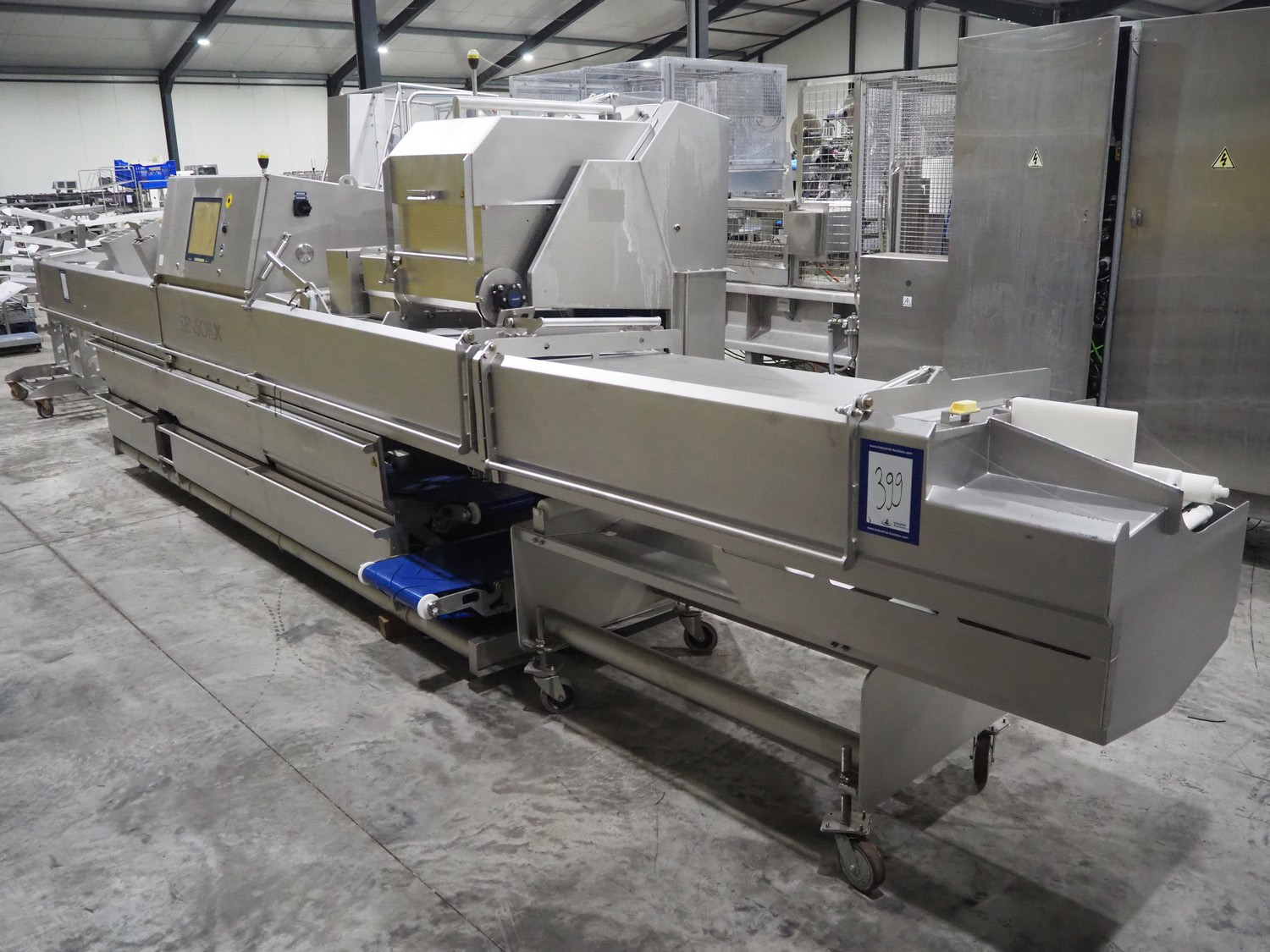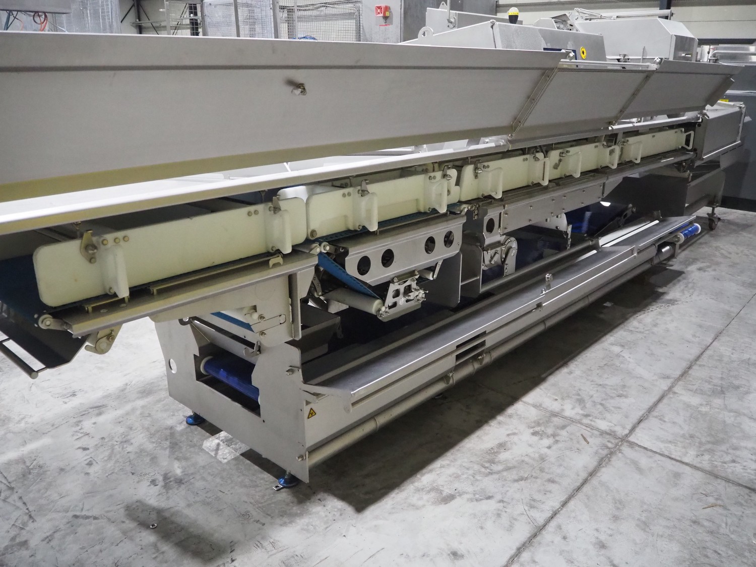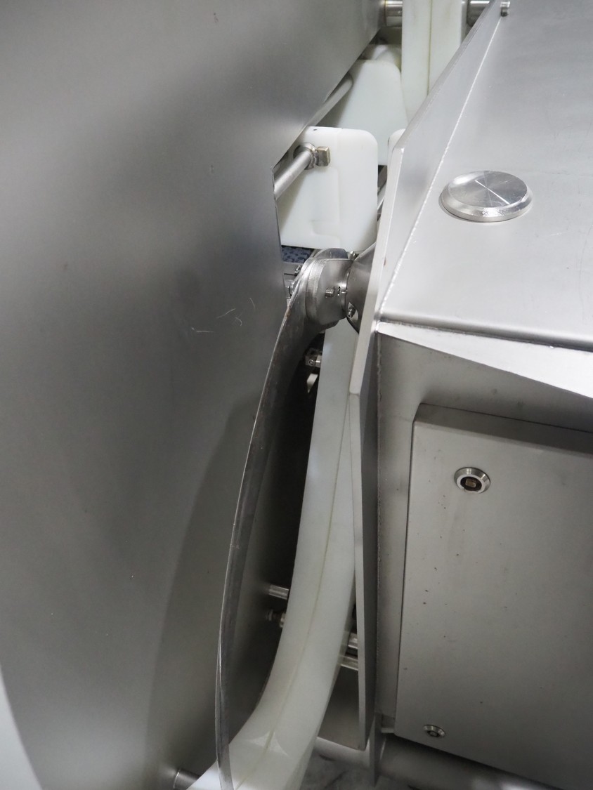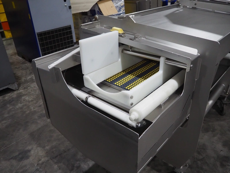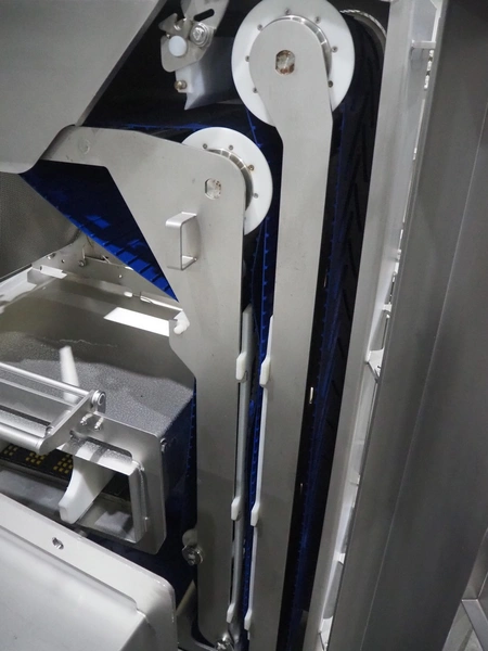 Marel trim inspection and portioning system, model: 850-9000-0011, type: 0012-102-00013, serial number: A143817, year of construction: 2016, plastic infeed belt, belt width: 590 mm, plastic belt, belt width: (2x) 380 mm, plastic mesh belt, belt width: 260 mm and 200 mm, total dimensions: 5150 mm x 1550 mm x 2160 mm. Including outfeed belt, dimensions: 1840 mm x 900 mm x 1180 mm, and 2x trolley for parts, dimensions: 2000 mm x 1150 mm x 1550 mm and 1650 mm x 1450 mm x 980 mm.