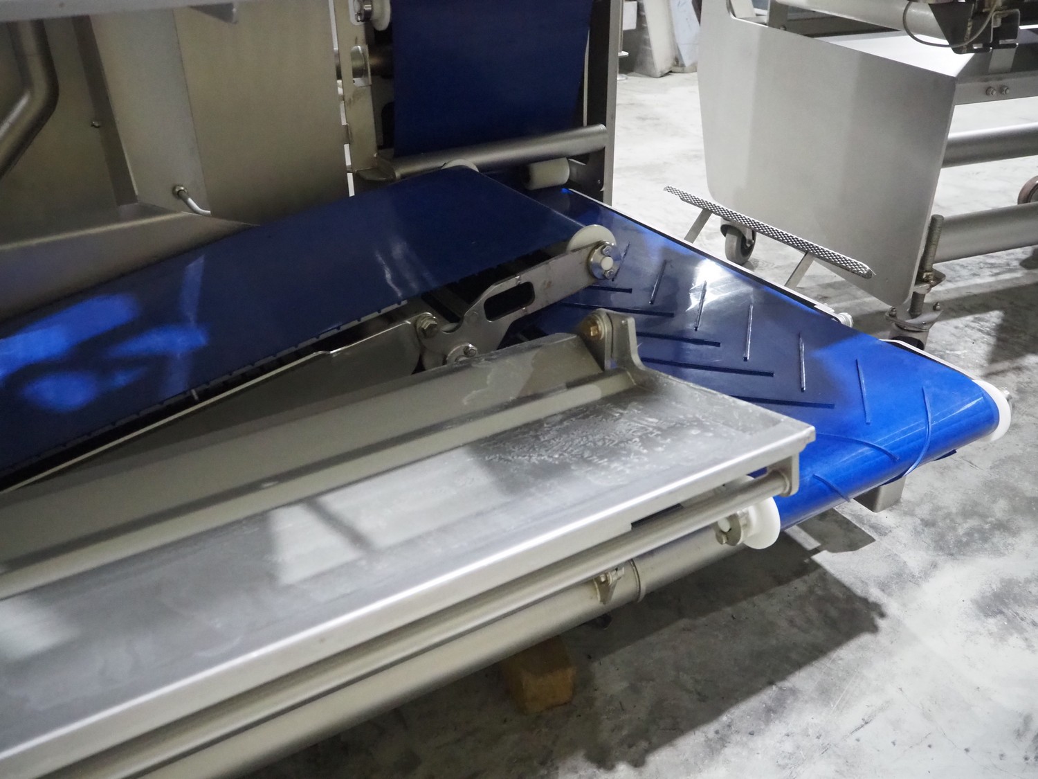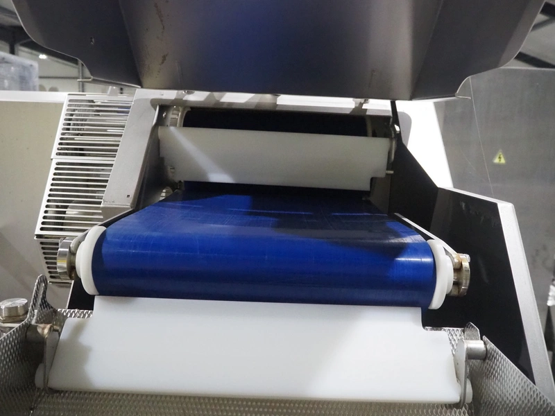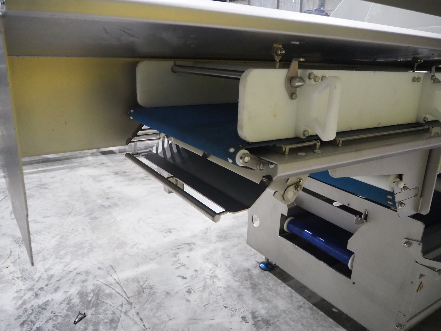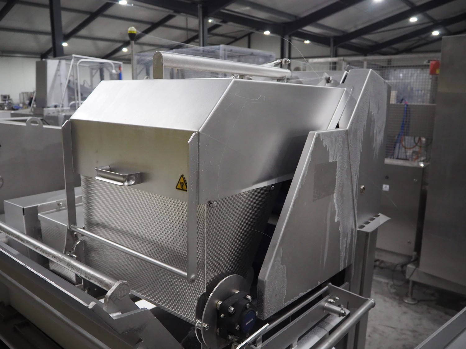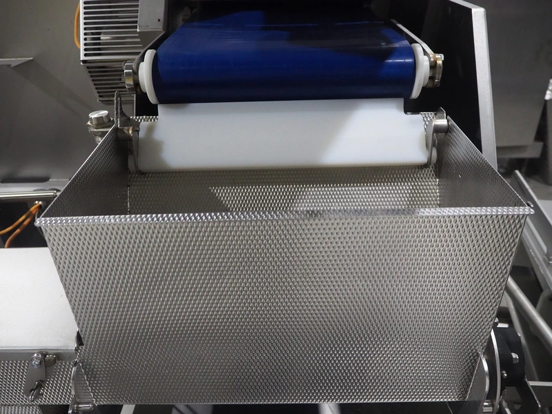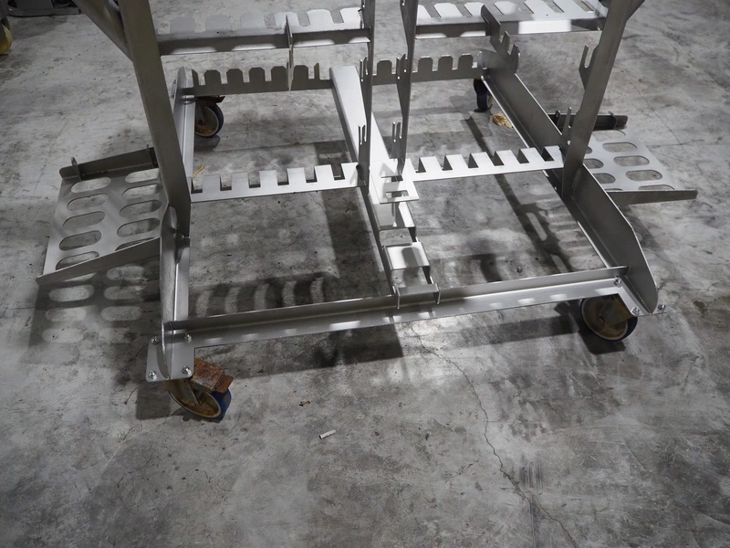 Marel trim inspection and portioning system, model: 850-9000-0011, type: 0012-102-00013, serial number: A143817, year of construction: 2016, plastic infeed belt, belt width: 590 mm, plastic belt, belt width: (2x) 380 mm, plastic mesh belt, belt width: 260 mm and 200 mm, total dimensions: 5150 mm x 1550 mm x 2160 mm. Including outfeed belt, dimensions: 1840 mm x 900 mm x 1180 mm, and 2x trolley for parts, dimensions: 2000 mm x 1150 mm x 1550 mm and 1650 mm x 1450 mm x 980 mm.