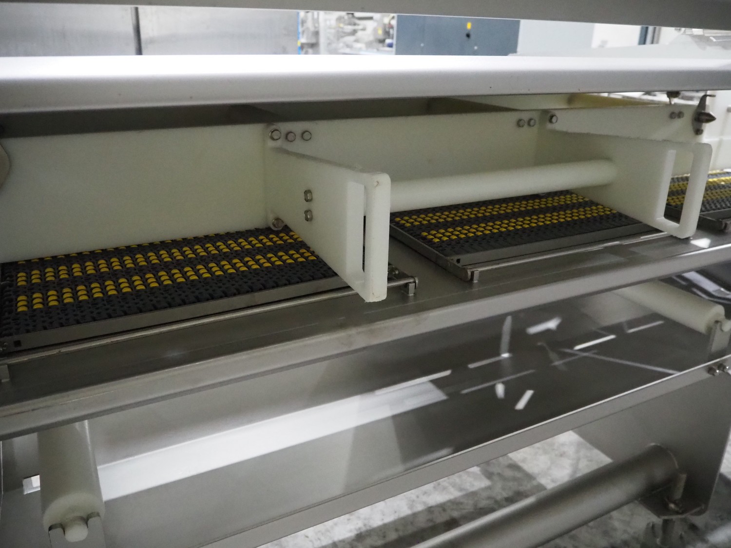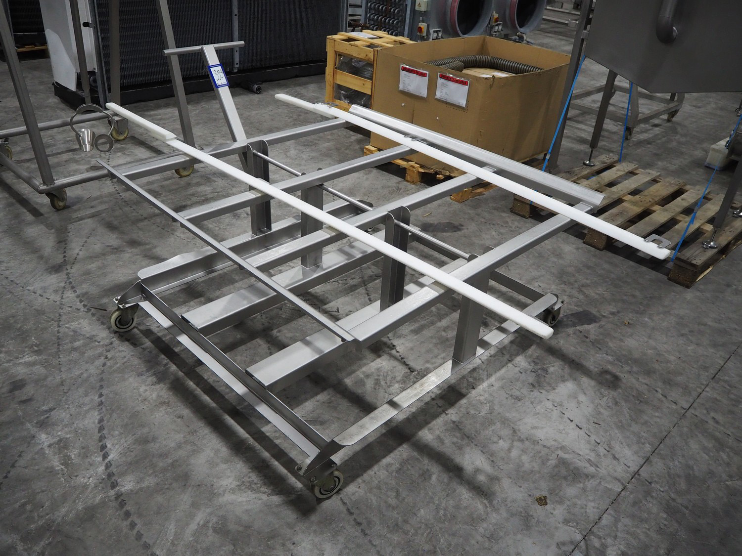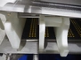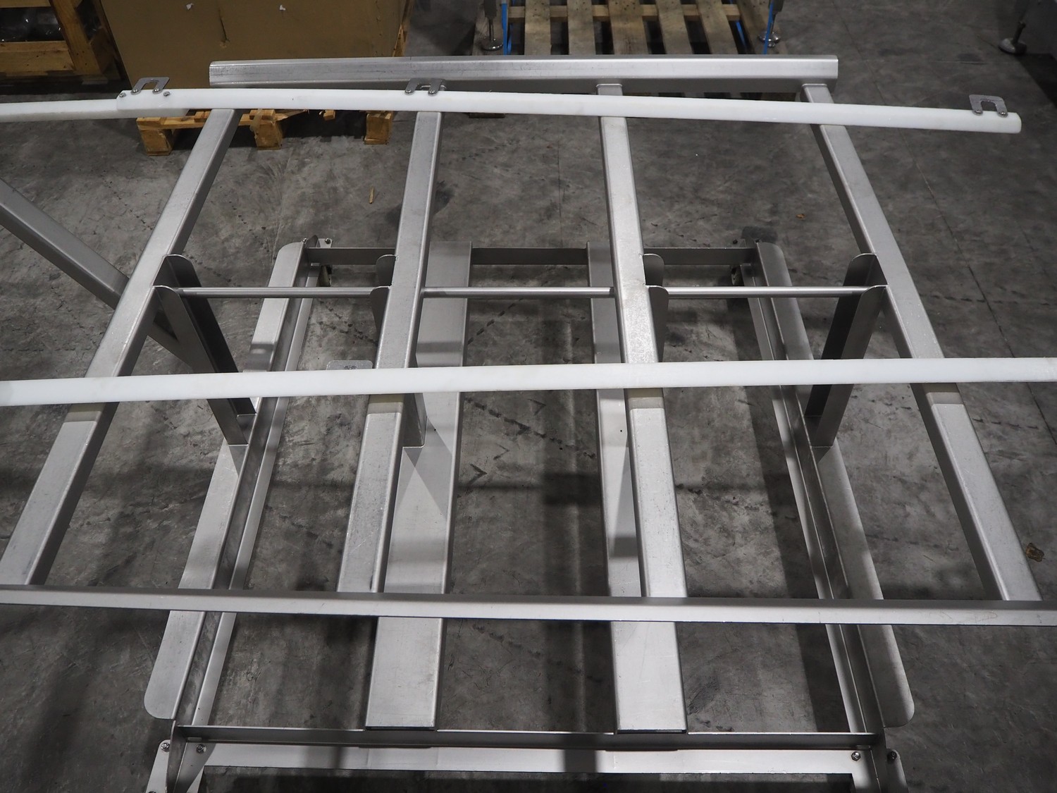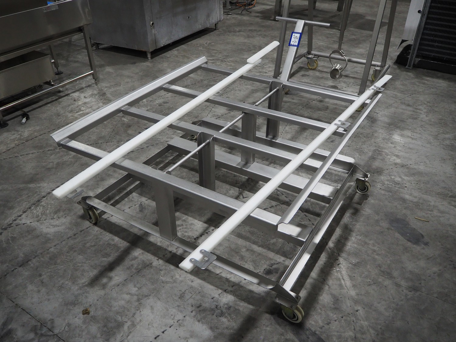 Marel trim inspection and portioning system, model: 850-9000-0011, type: 0012-102-00013, serial number: A143817, year of construction: 2016, plastic infeed belt, belt width: 590 mm, plastic belt, belt width: (2x) 380 mm, plastic mesh belt, belt width: 260 mm and 200 mm, total dimensions: 5150 mm x 1550 mm x 2160 mm. Including outfeed belt, dimensions: 1840 mm x 900 mm x 1180 mm, and 2x trolley for parts, dimensions: 2000 mm x 1150 mm x 1550 mm and 1650 mm x 1450 mm x 980 mm.