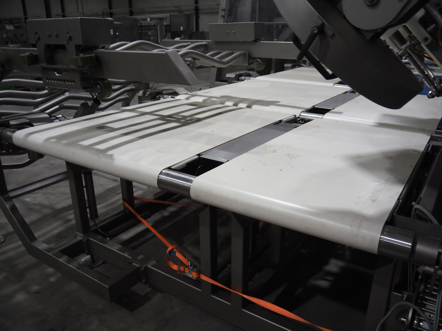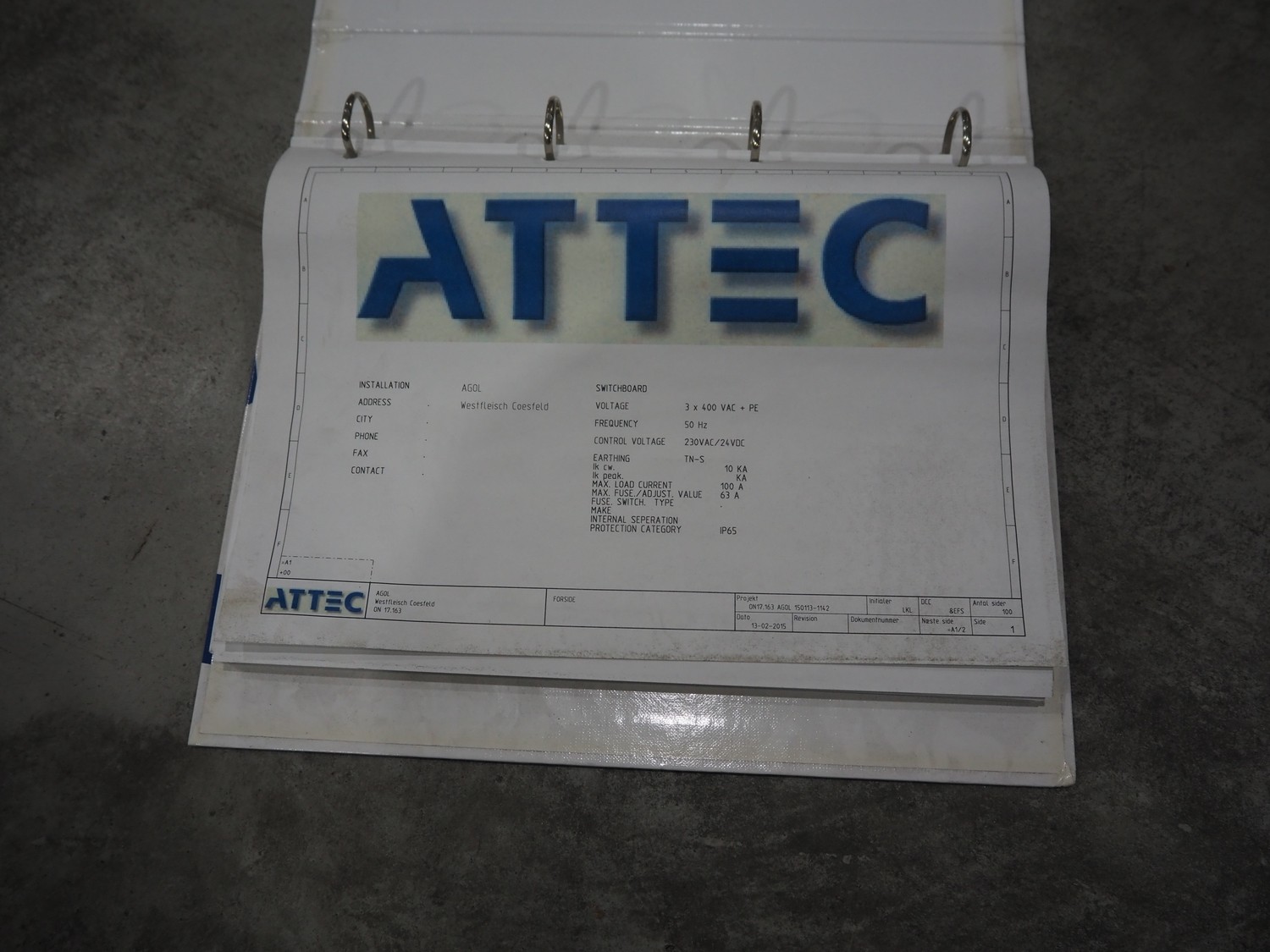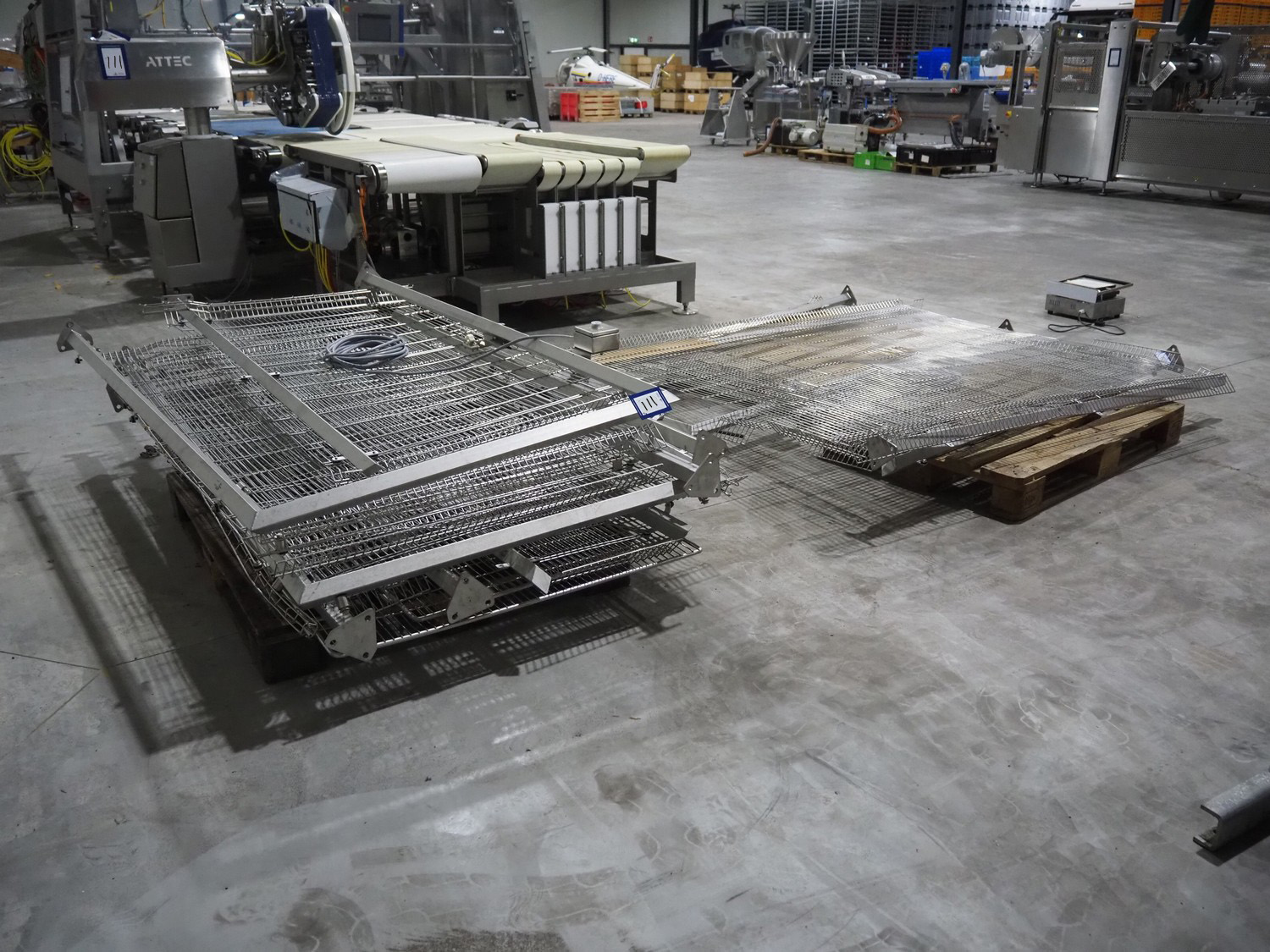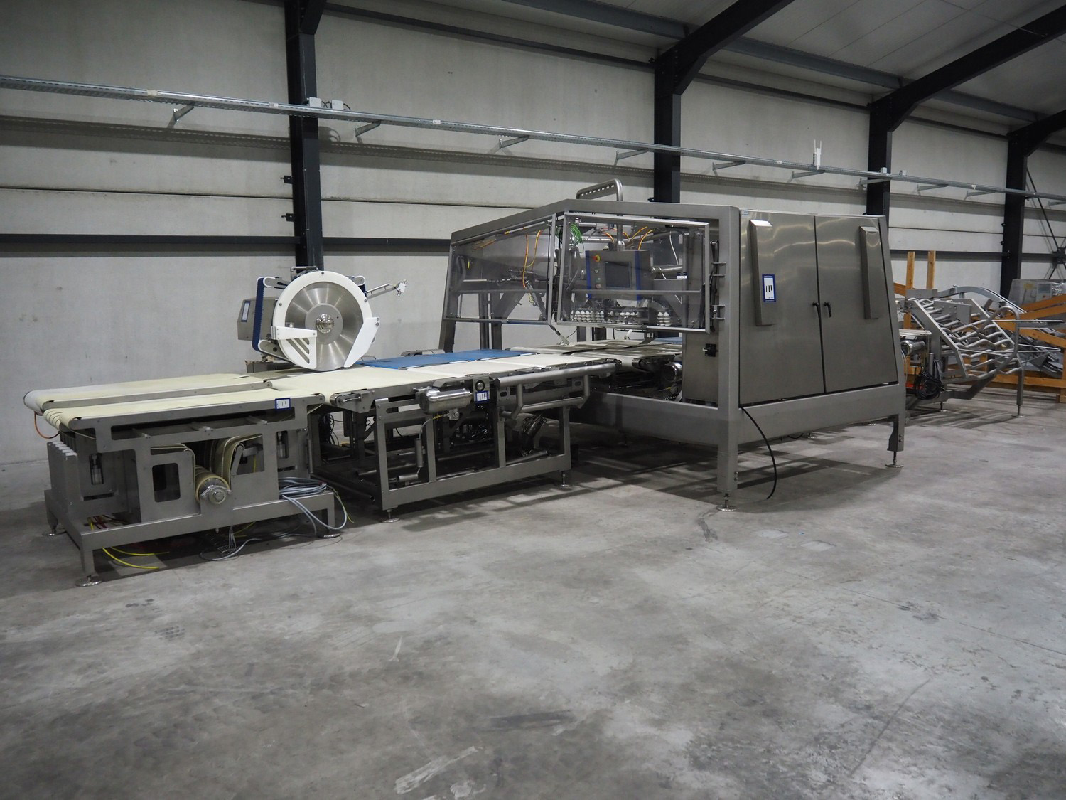 Attec Food Technology fully automatic pig cutting line consisting of: steel hanging line, dimensions: 6500 mm x 400 mm x 1700, Attec automatic primal cutting line, type: AGOL-850, order number: ON17163, year of construction: 2015, 400 V, 3 Ph, 50 Hz, 45 kW, capacity: 800 pigs/hr, product: pork carcasses, left & right, s/s outfeed belt for waste pork legs, belt width: 290 mm, automatic measuring system for precise and individual cuts of individual pork carcass, plastic belt, belt width: 800 mm, 1300 mm, 500 mm, 300 mm, 100 mm and s/s protection fence, total dimensions: 9800 mm x 4200 mm x 2200 mm. Line is never used.