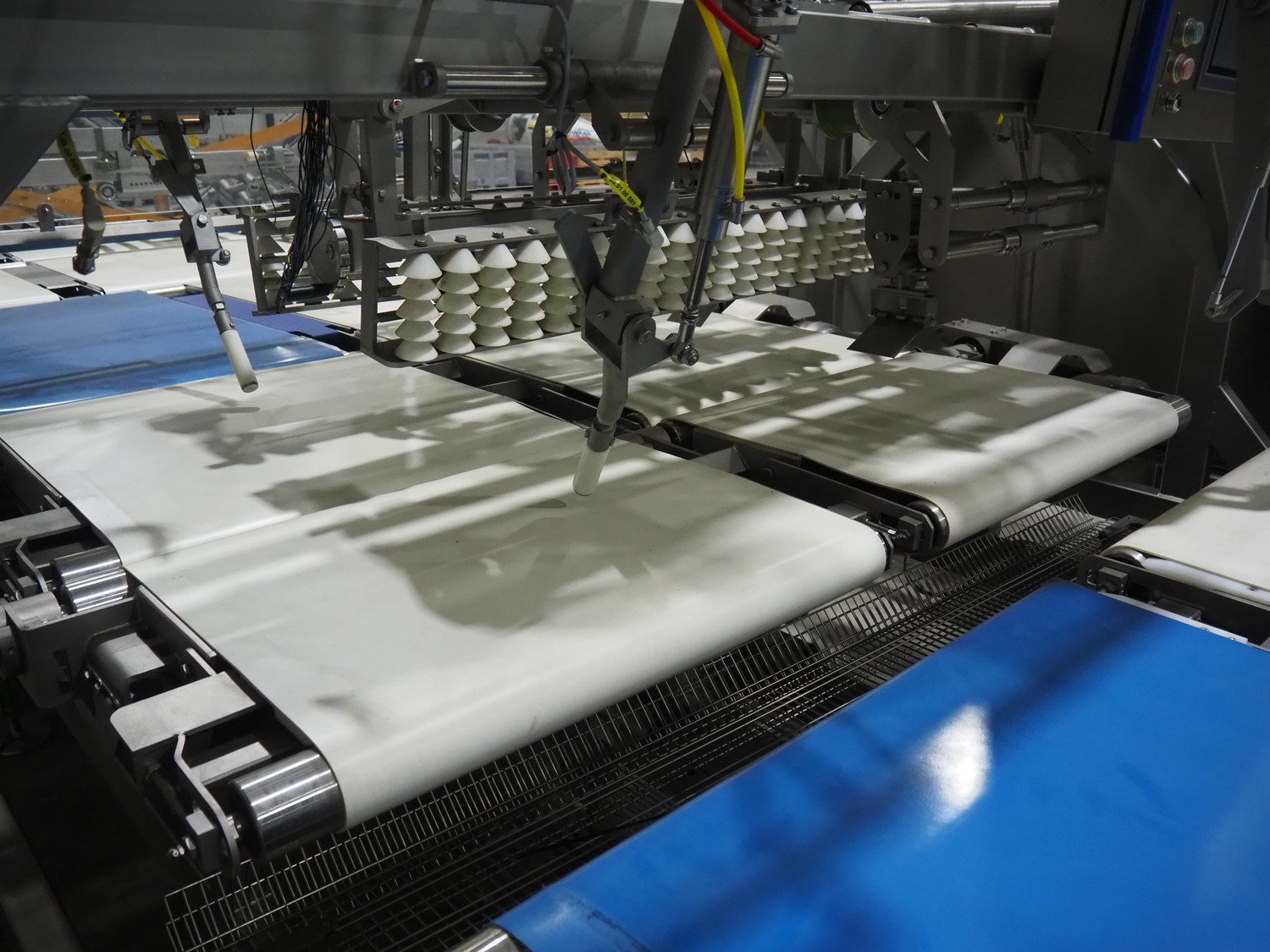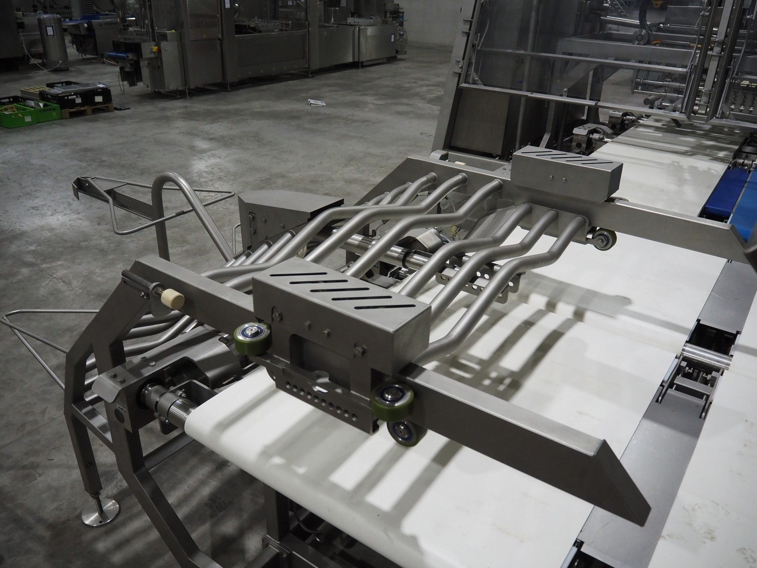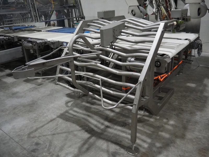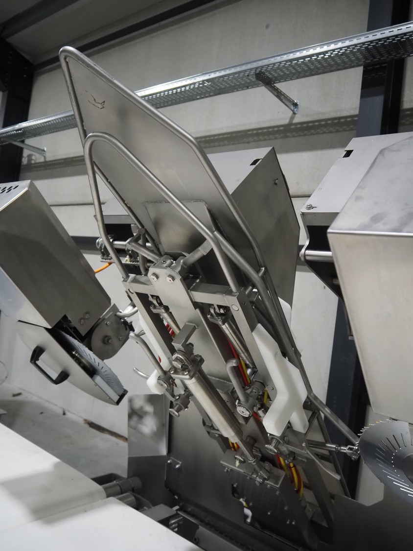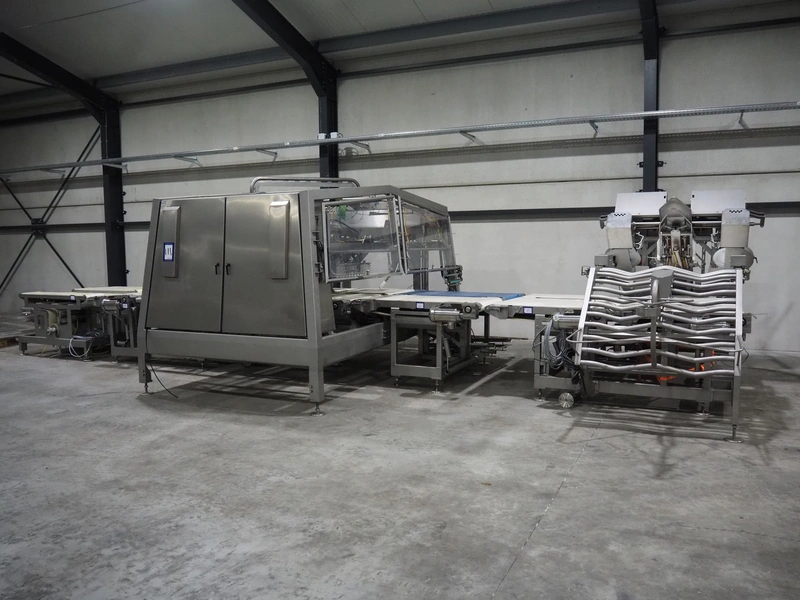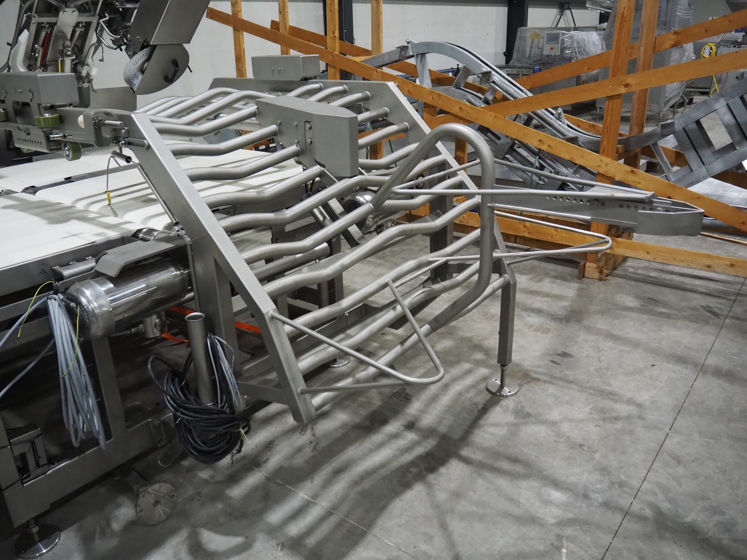 Attec Food Technology fully automatic pig cutting line consisting of: steel hanging line, dimensions: 6500 mm x 400 mm x 1700, Attec automatic primal cutting line, type: AGOL-850, order number: ON17163, year of construction: 2015, 400 V, 3 Ph, 50 Hz, 45 kW, capacity: 800 pigs/hr, product: pork carcasses, left & right, s/s outfeed belt for waste pork legs, belt width: 290 mm, automatic measuring system for precise and individual cuts of individual pork carcass, plastic belt, belt width: 800 mm, 1300 mm, 500 mm, 300 mm, 100 mm and s/s protection fence, total dimensions: 9800 mm x 4200 mm x 2200 mm. Line is never used.