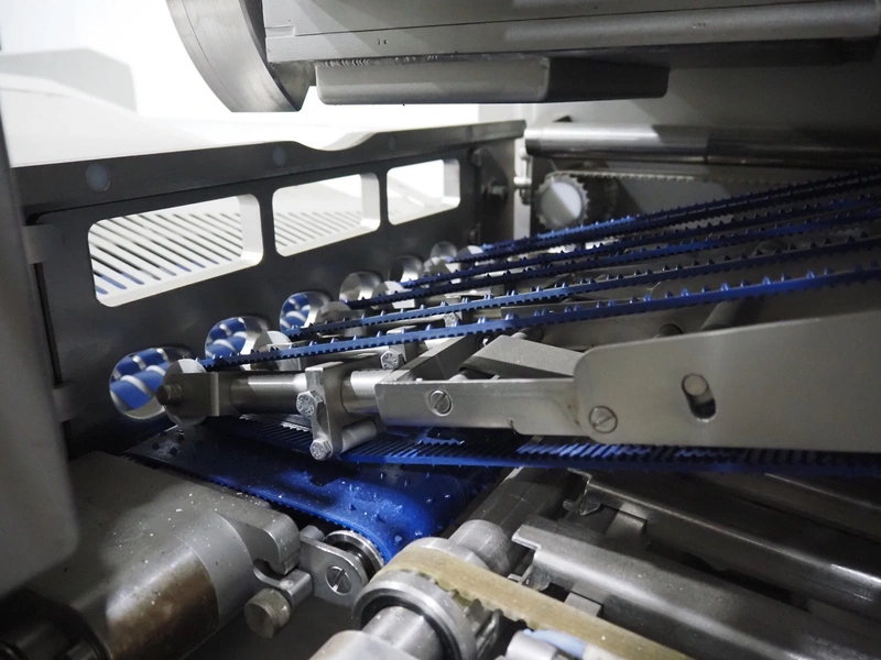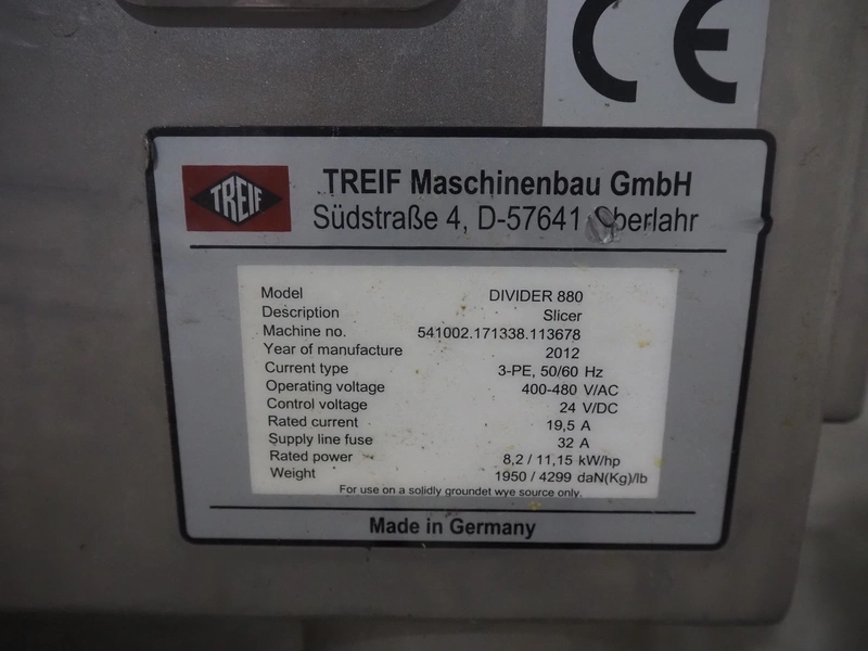 - Slicer, model: Divider 880, machine number: 541002.171338.113678, year of construction: 2012, 400-480 V, 3 Ph, 50 Hz, 19.5 A, weight: 1950 kg, 6 lanes, plastic infeed belt, belt width: 450 mm, dimensions: 6250 mm x 1970 mm x 2700 mm;