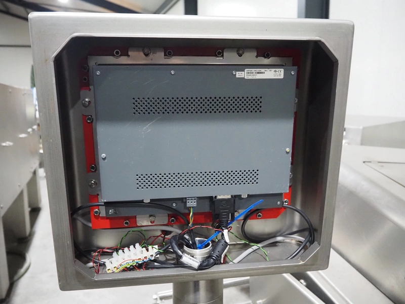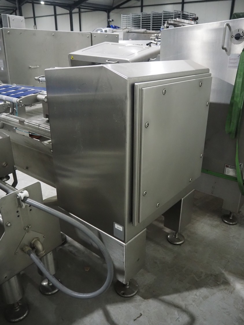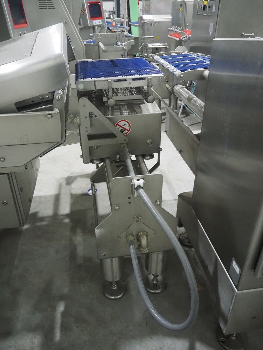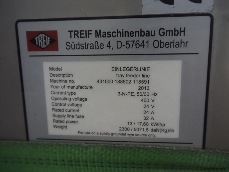 - Tray feeder line, model: Einlegerlinie, machine number: 431000.188602.118591, year of construction: 2013, 400 V, 3 Ph, 50/60 Hz, 24 A, 13 kW, weight: 2300 kg, plastic belt, belt width: 505 mm, dimensions: 5700 mm x 1650 mm x 1880 mm, total dimensions: 10800 mm x 1870 mm x 2700 mm.