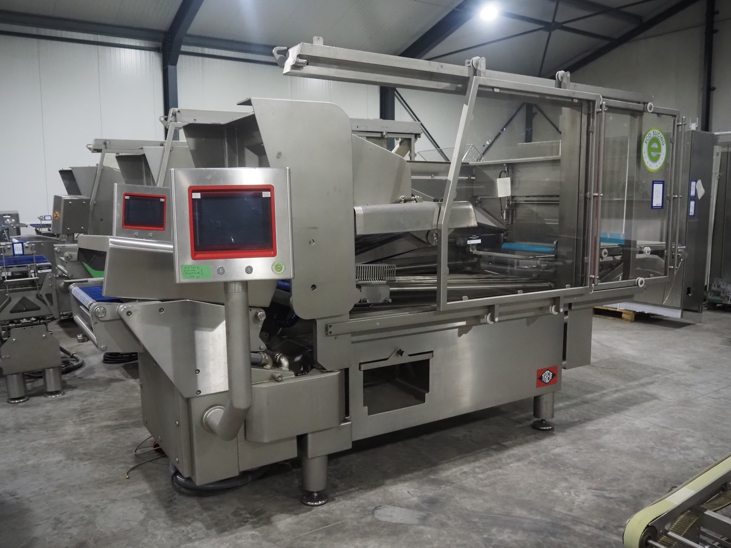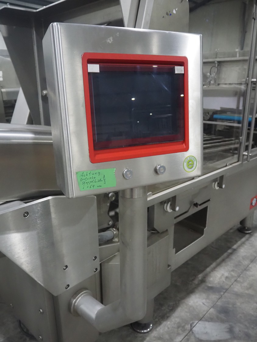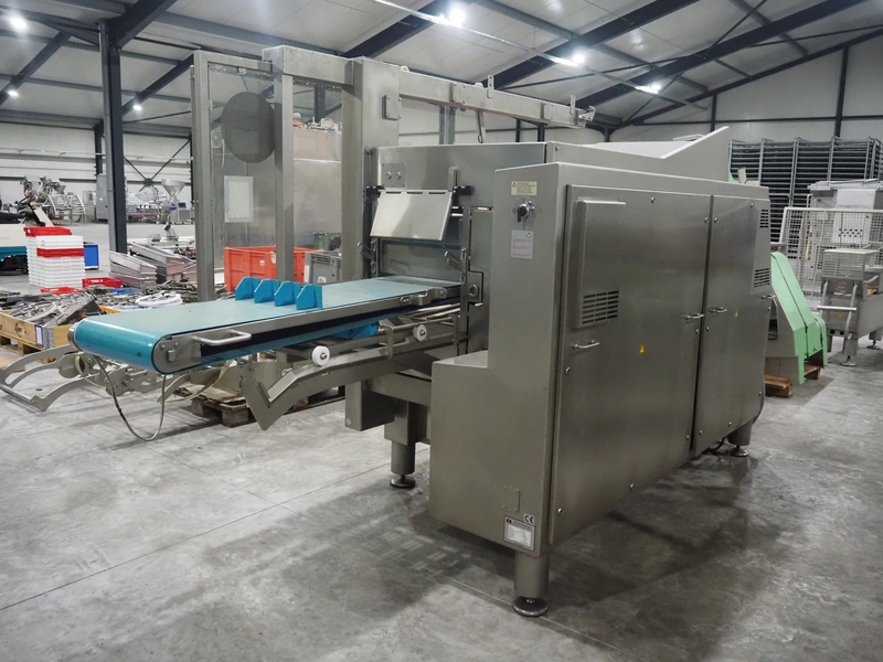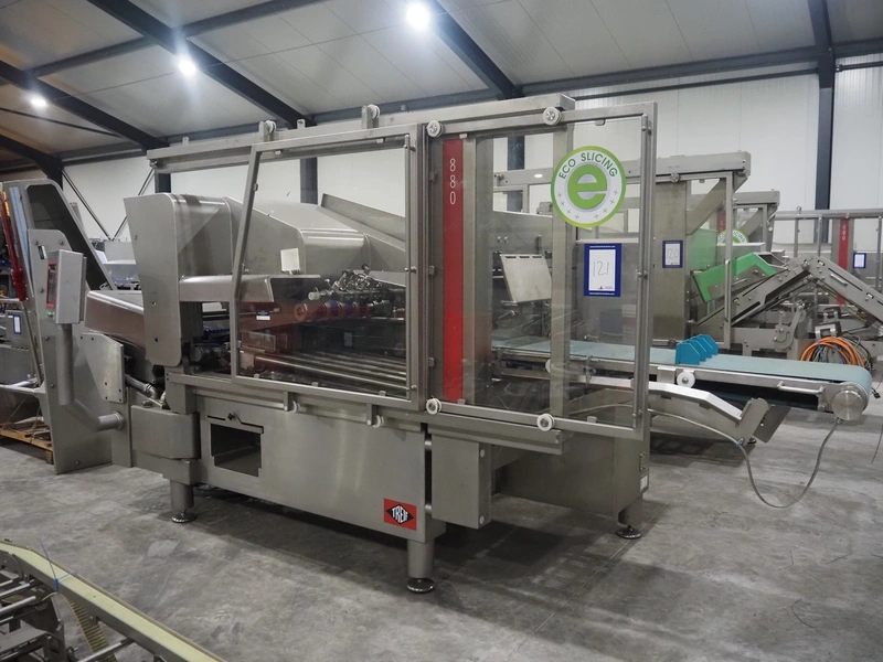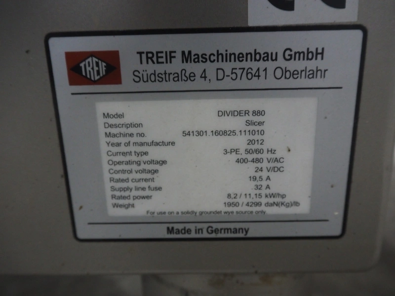 Treif Maschinenbau GmbH slicer, model: Divider 880, machine number: 541301.160825.111010, year of construction: 2012, 400/480 V, 3 Ph, 50/60 Hz, 19.5 A, 8.2 kW, weight: 1950 kg, 4 lanes, plastic infeed belt, belt width: 445 mm, dimensions slicer: 5100 mm x 1870 mm x 2700 mm. Technical condition unknown.
