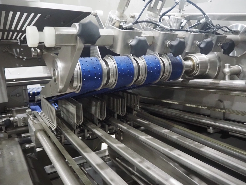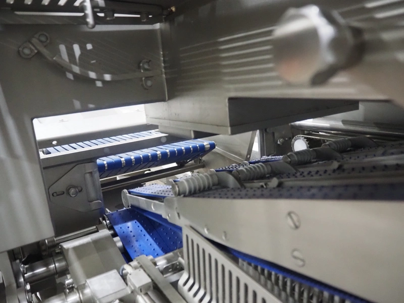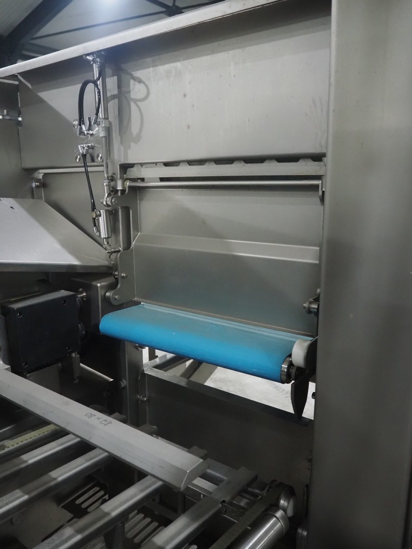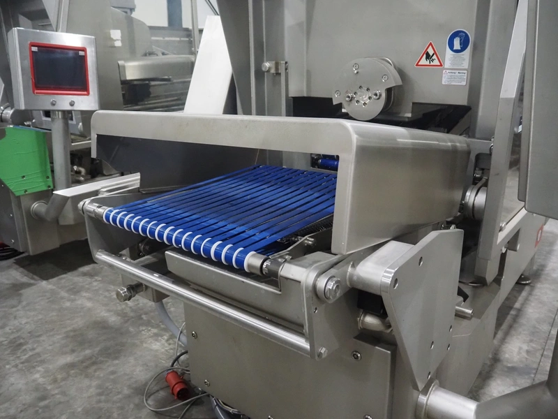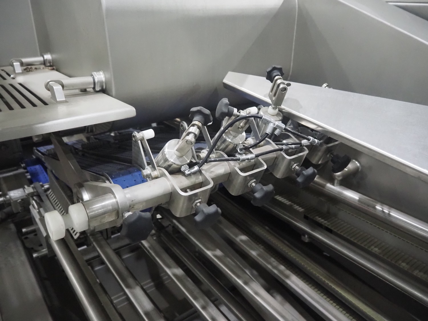 Treif Maschinenbau GmbH slicer, model: Divider 880, machine number: 541301.160825.111010, year of construction: 2012, 400/480 V, 3 Ph, 50/60 Hz, 19.5 A, 8.2 kW, weight: 1950 kg, 4 lanes, plastic infeed belt, belt width: 445 mm, dimensions slicer: 5100 mm x 1870 mm x 2700 mm. Technical condition unknown.