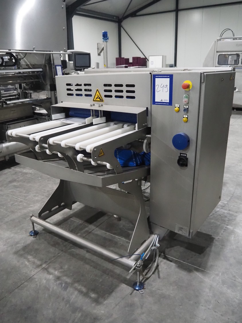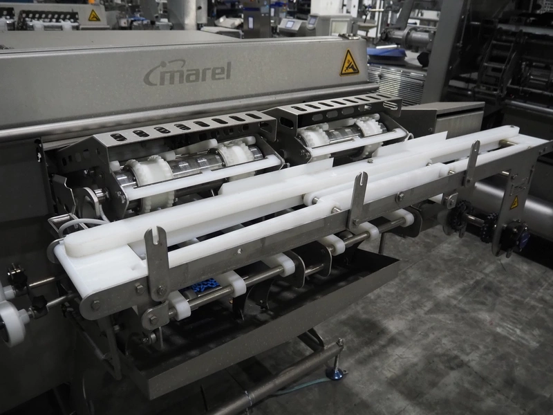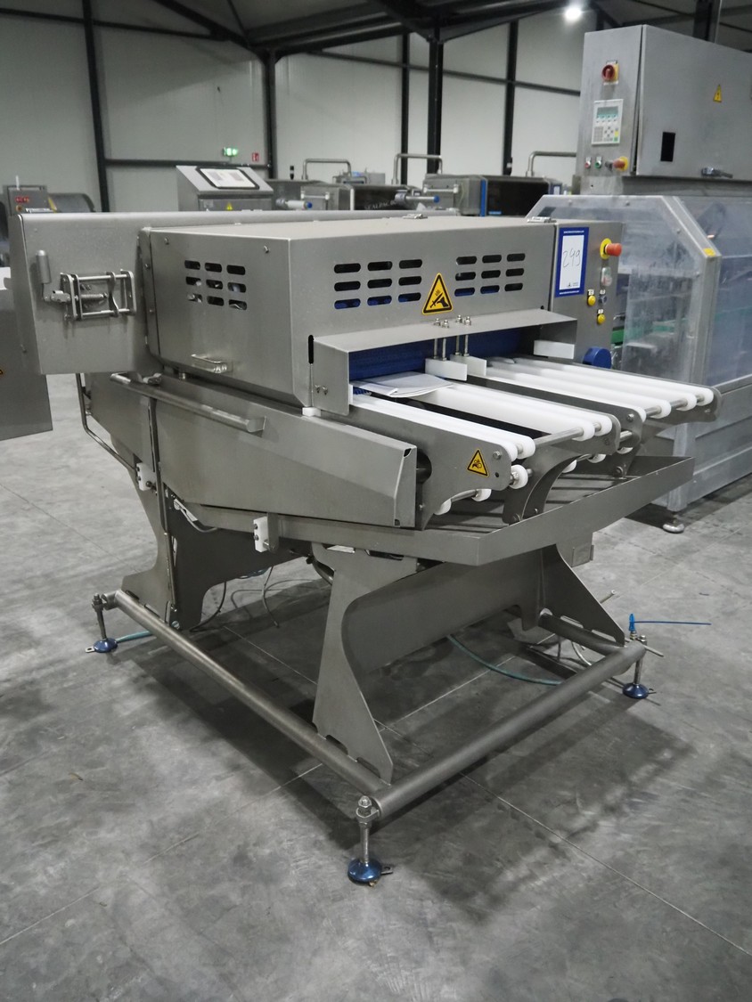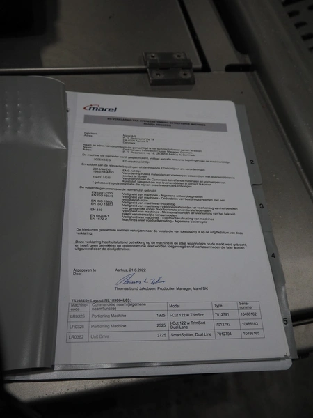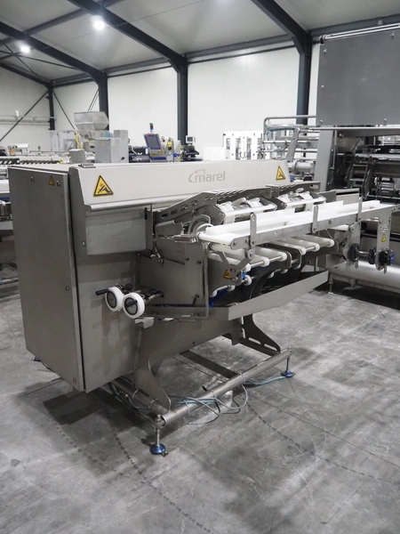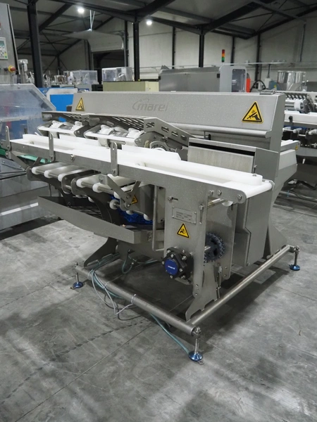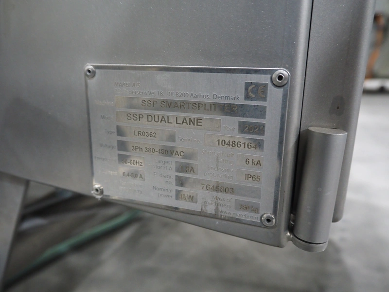 Marel smart splitter, model: SSP dual lane, serial number: 10486164, year of construction: 2021, belt width: (2x) 360 mm, (1x) 180 mm, clearance: (2x) 325 mm x 120 mm, working width: 300 mm, total dimensions: 2090 mm x 1850 mm x 1460 mm.