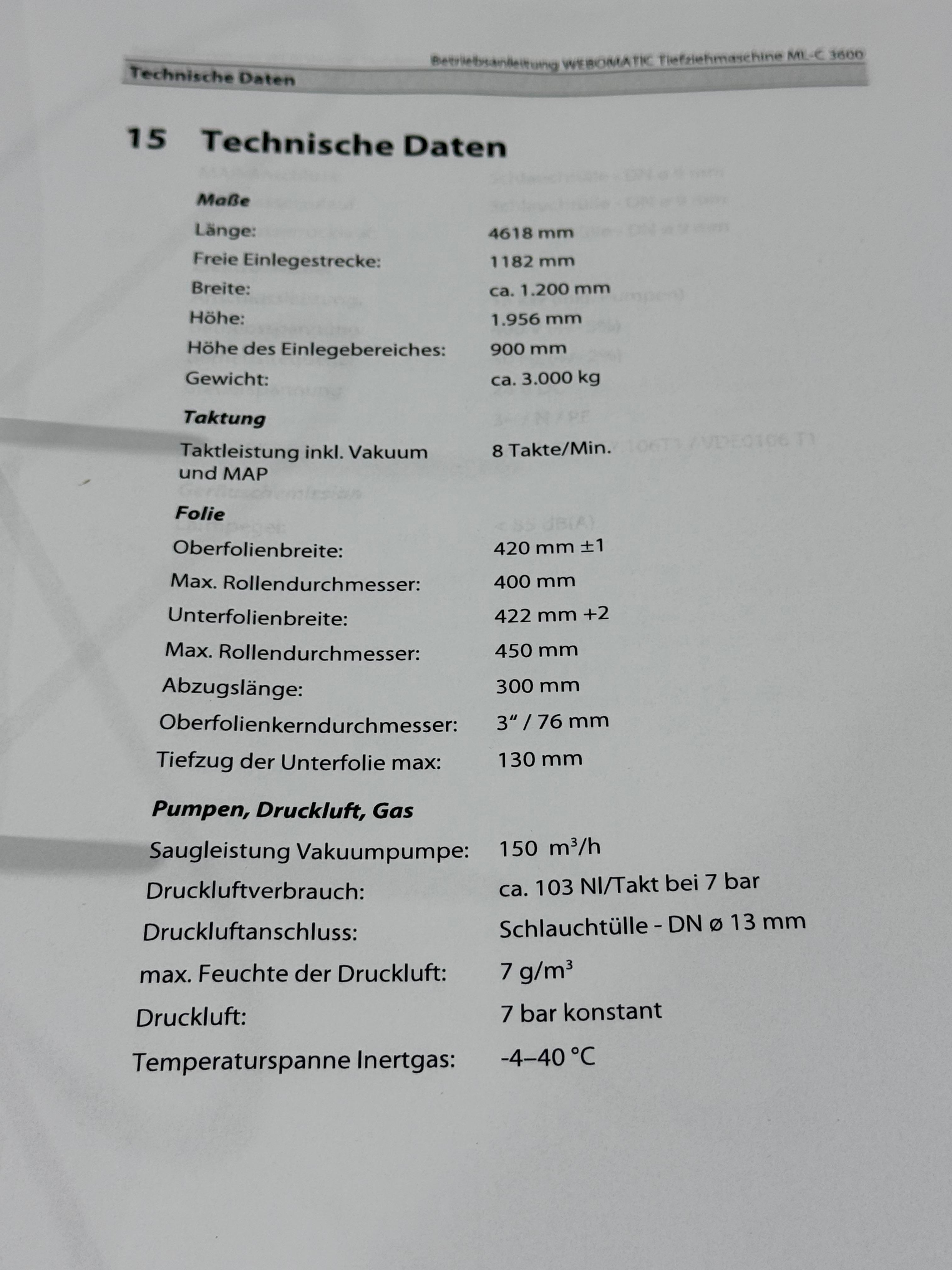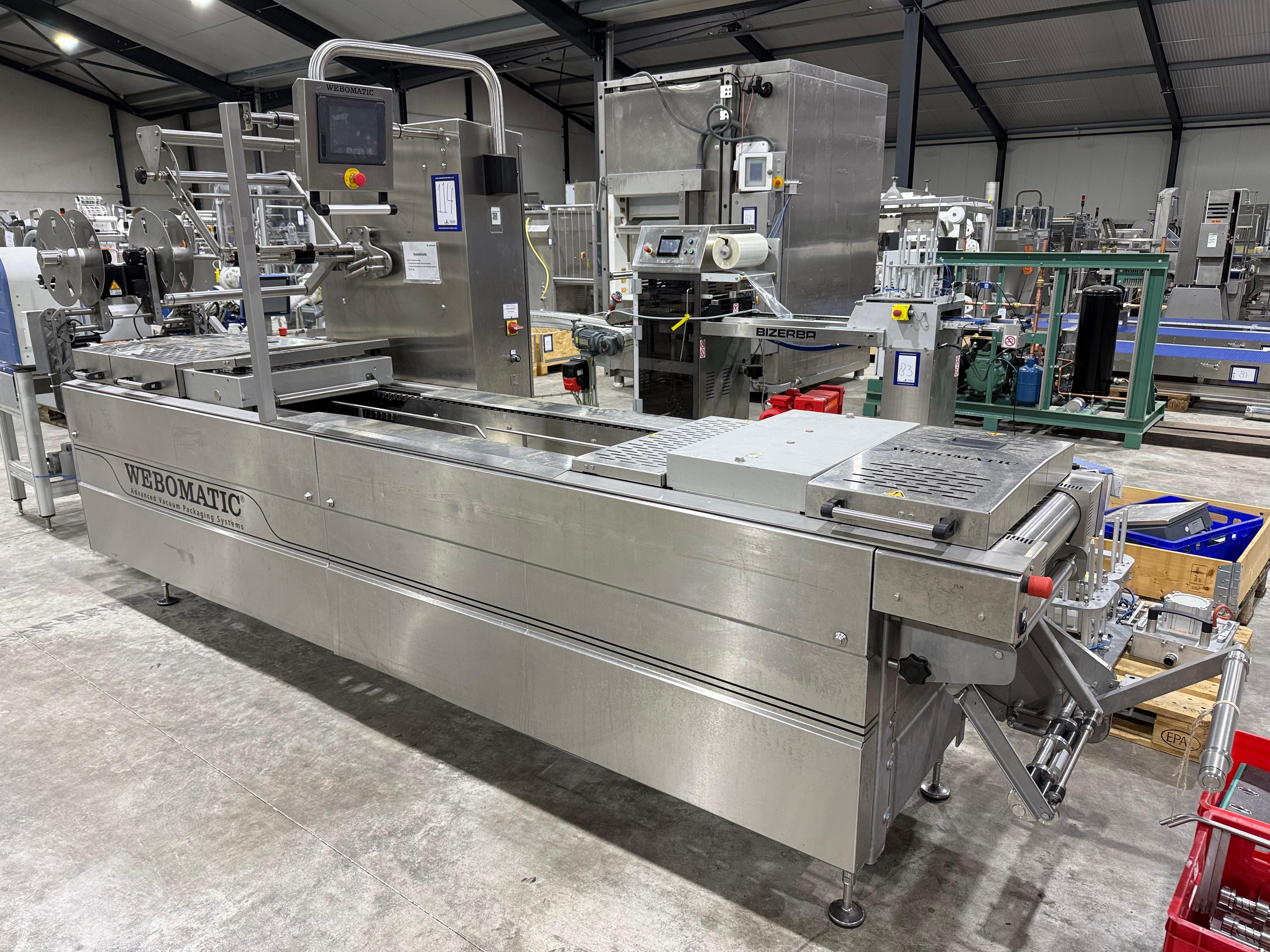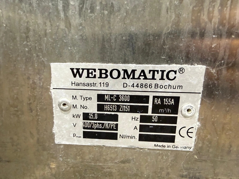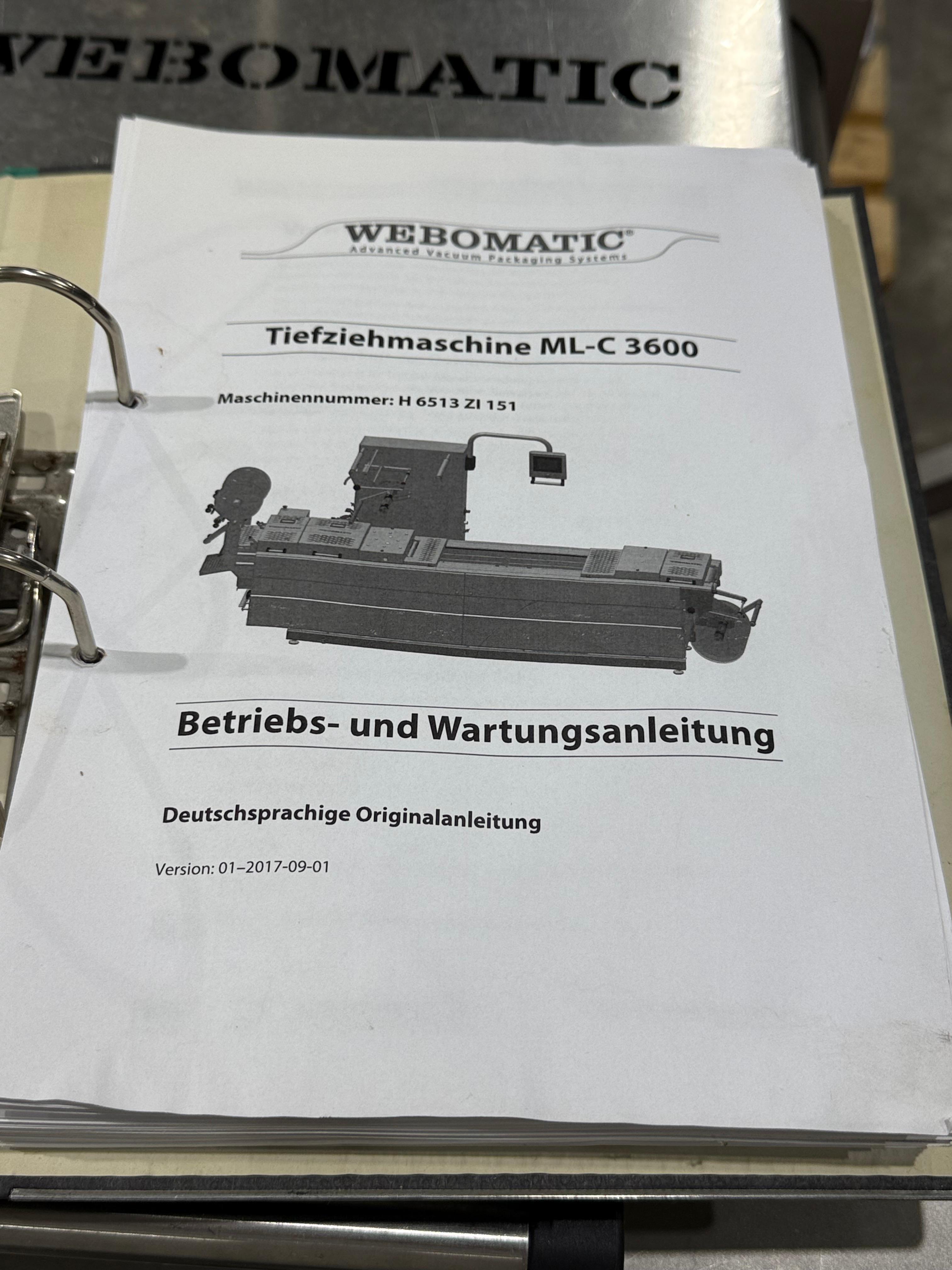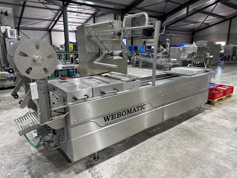Webomatic thermoformer, type: ML-C 3600, machine number: H6513 ZI151, 400 V, 3 Ph, 50 Hz, 15 kW, dye: (1x) 367 mm x 285 mm, (2x) 285 mm x 178 mm and (3x) 115 mm x 285 mm, Busch vacuum pump, type: RA 0155 A 503, capacity: 155 m³ per hour, Selbach water chiller, type: BK30, total dimensions: 4650 mm x 1200 mm x 1960 mm.