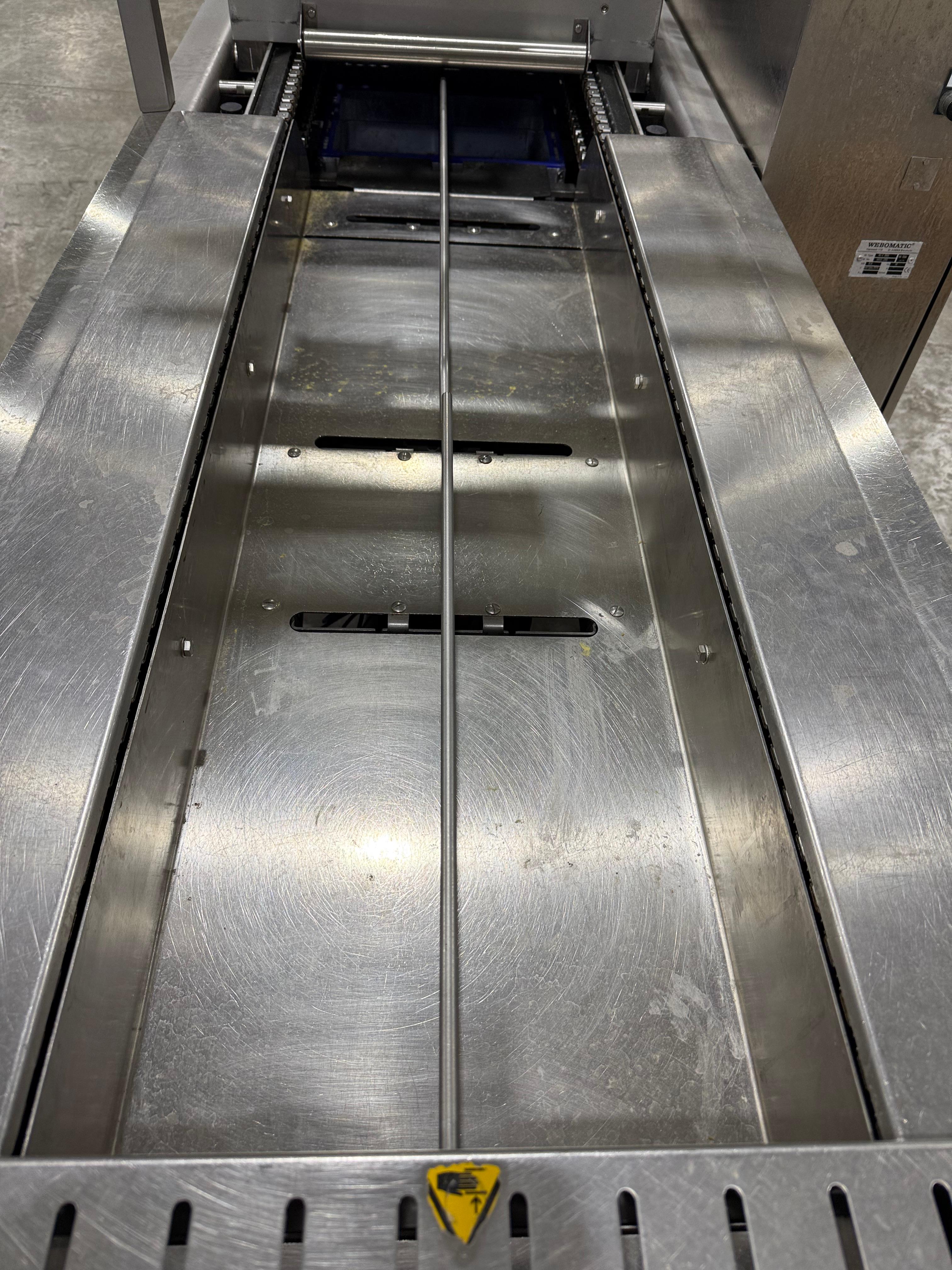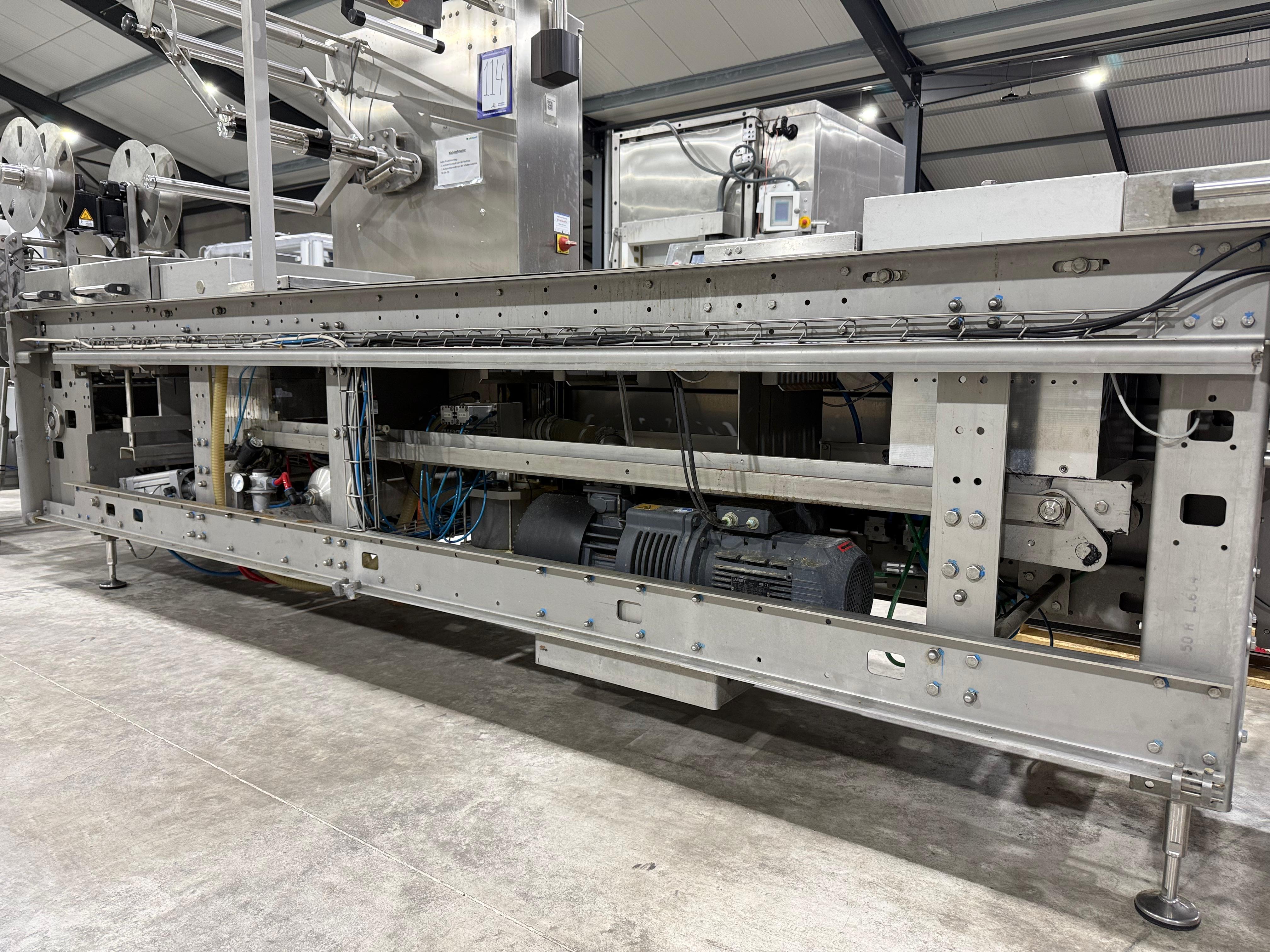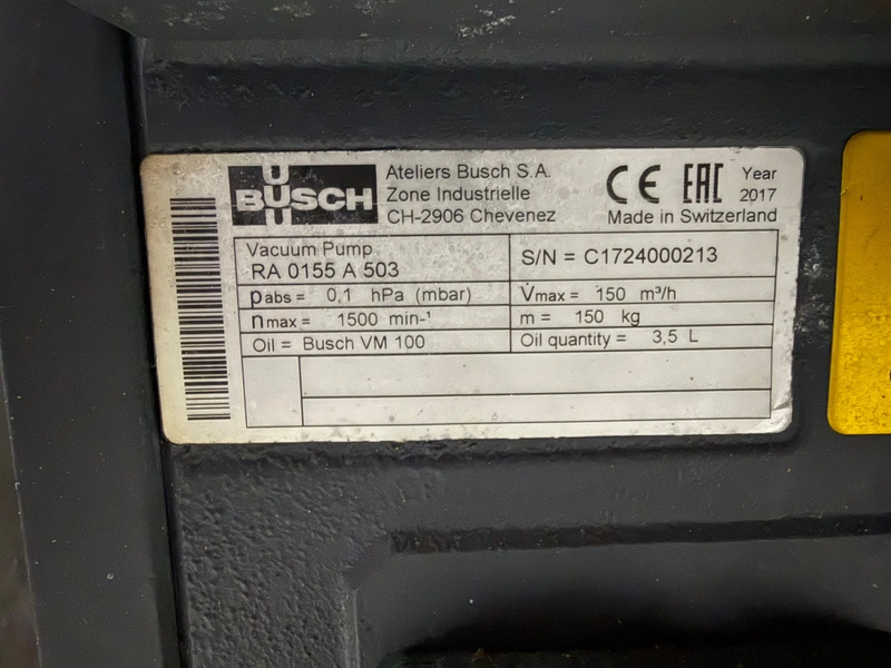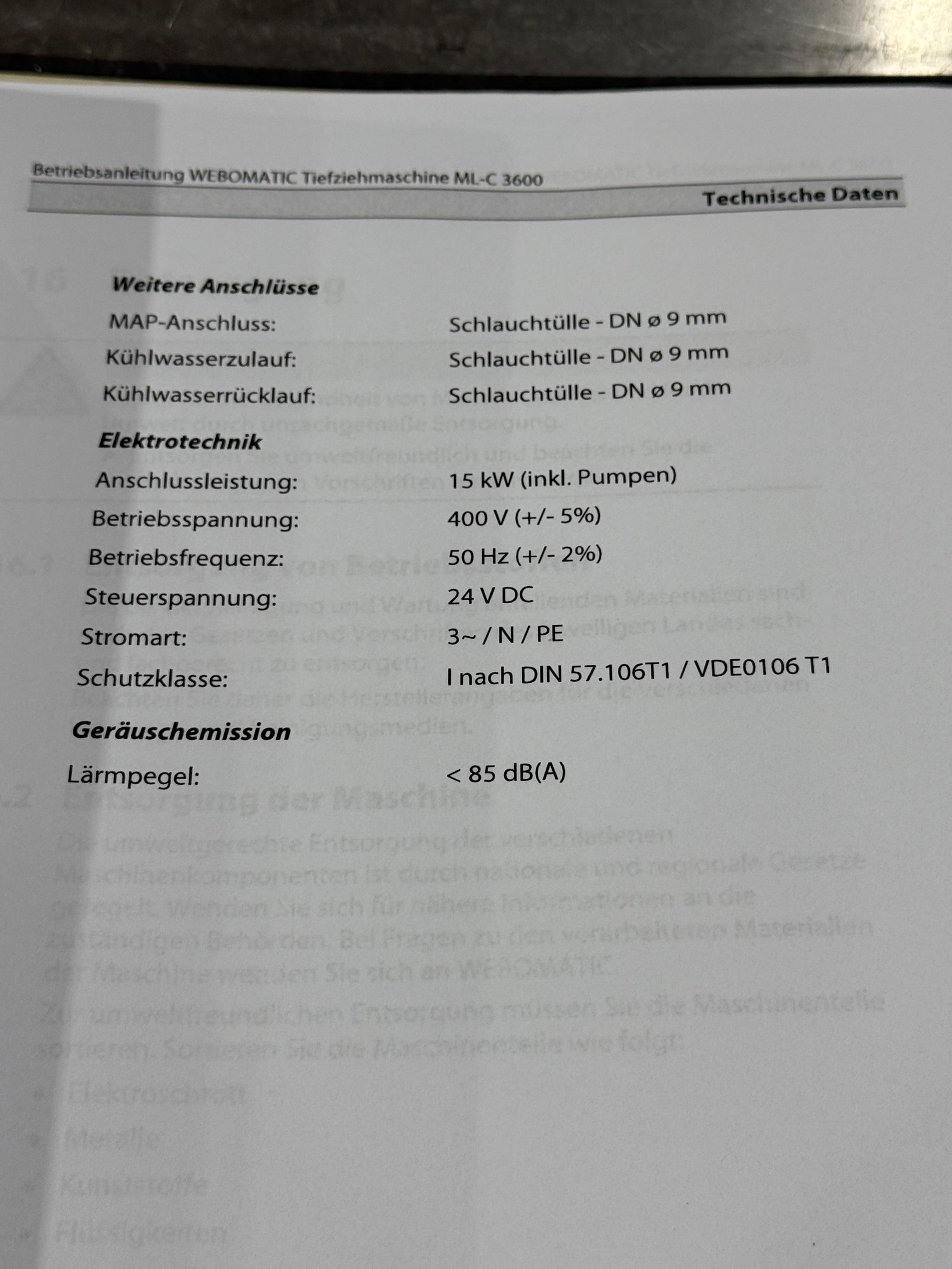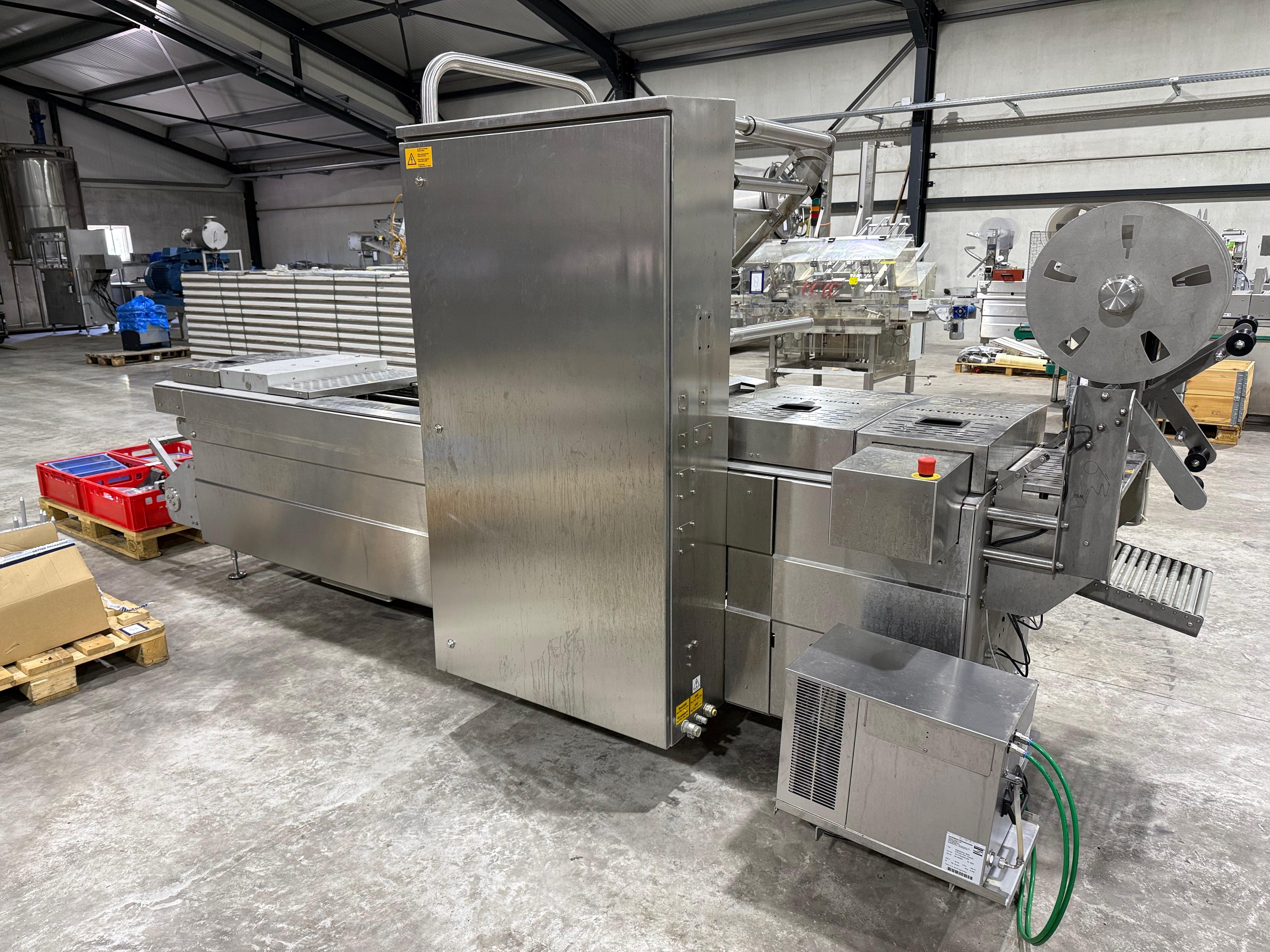 Webomatic thermoformer, type: ML-C 3600, machine number: H6513 ZI151, 400 V, 3 Ph, 50 Hz, 15 kW, dye: (1x) 367 mm x 285 mm, (2x) 285 mm x 178 mm and (3x) 115 mm x 285 mm, Busch vacuum pump, type: RA 0155 A 503, capacity: 155 m³ per hour, Selbach water chiller, type: BK30, total dimensions: 4650 mm x 1200 mm x 1960 mm.