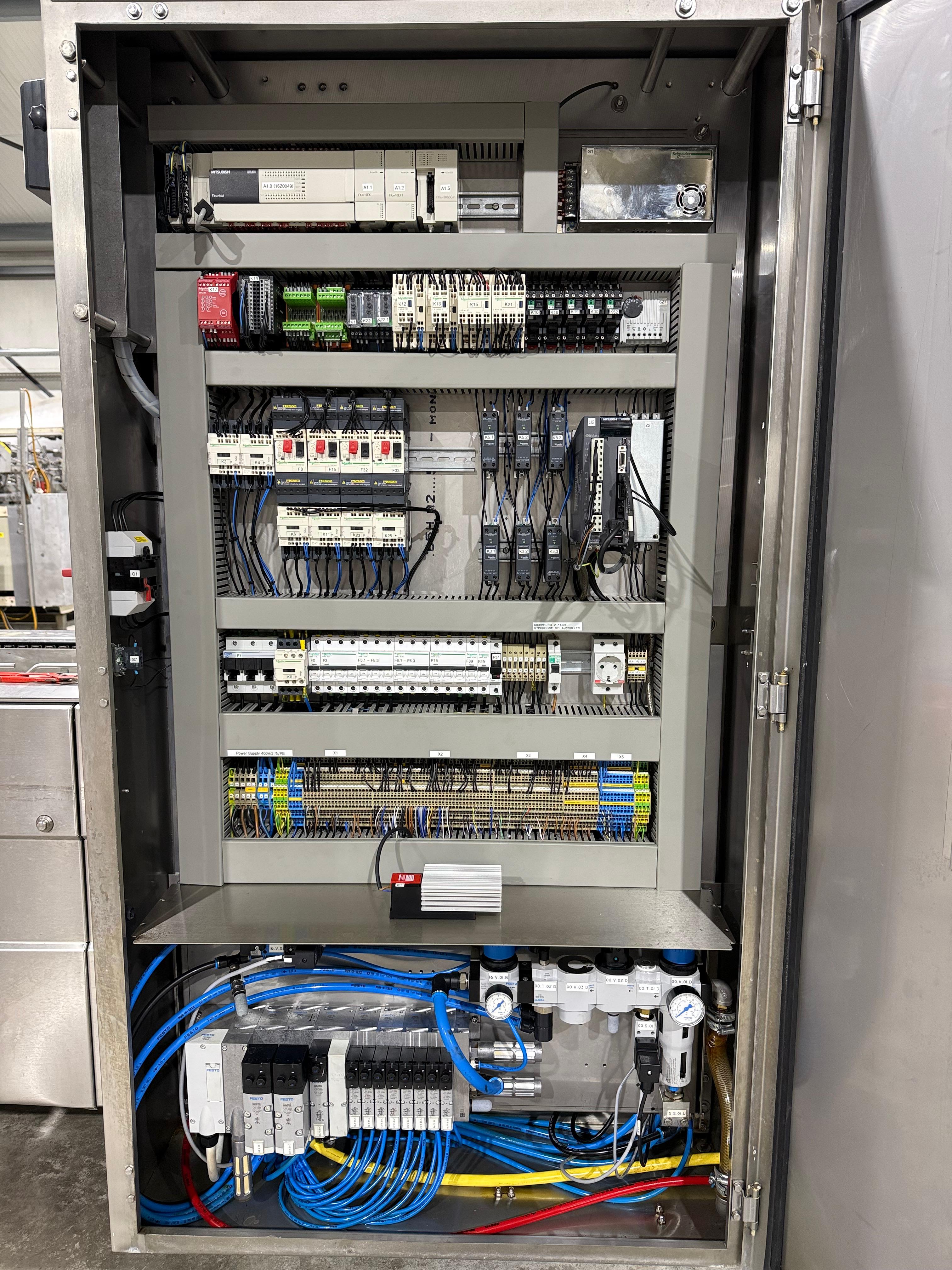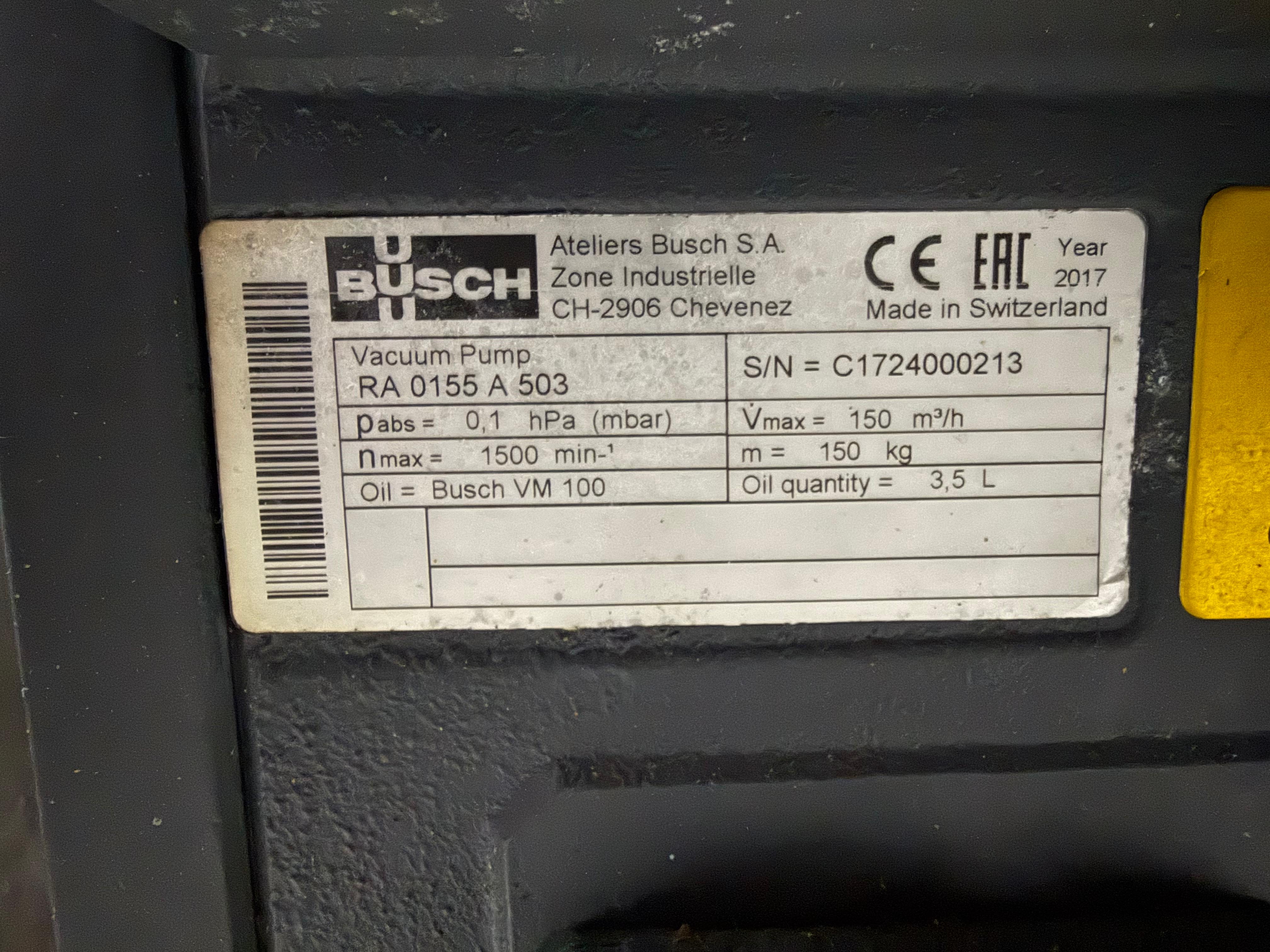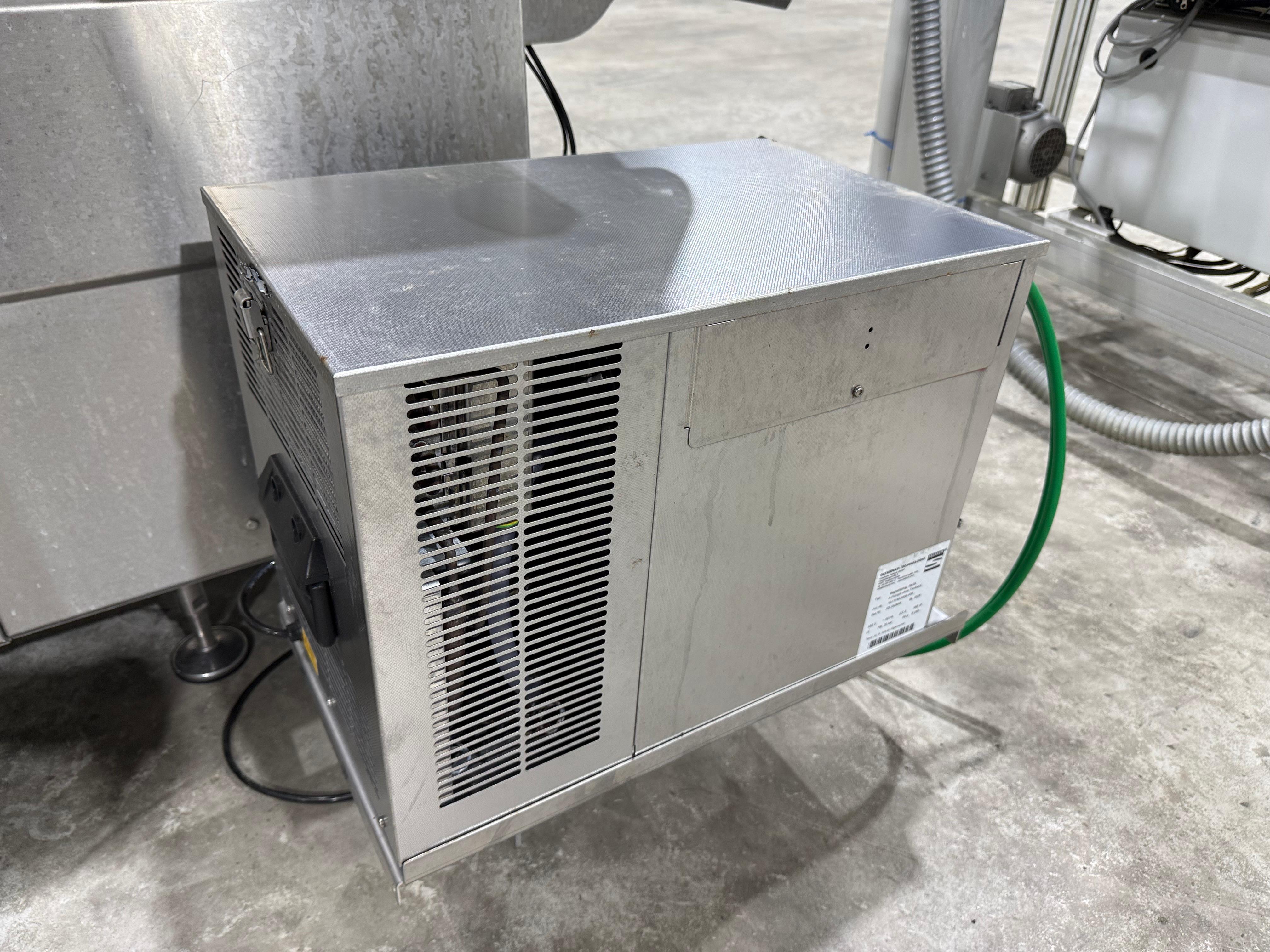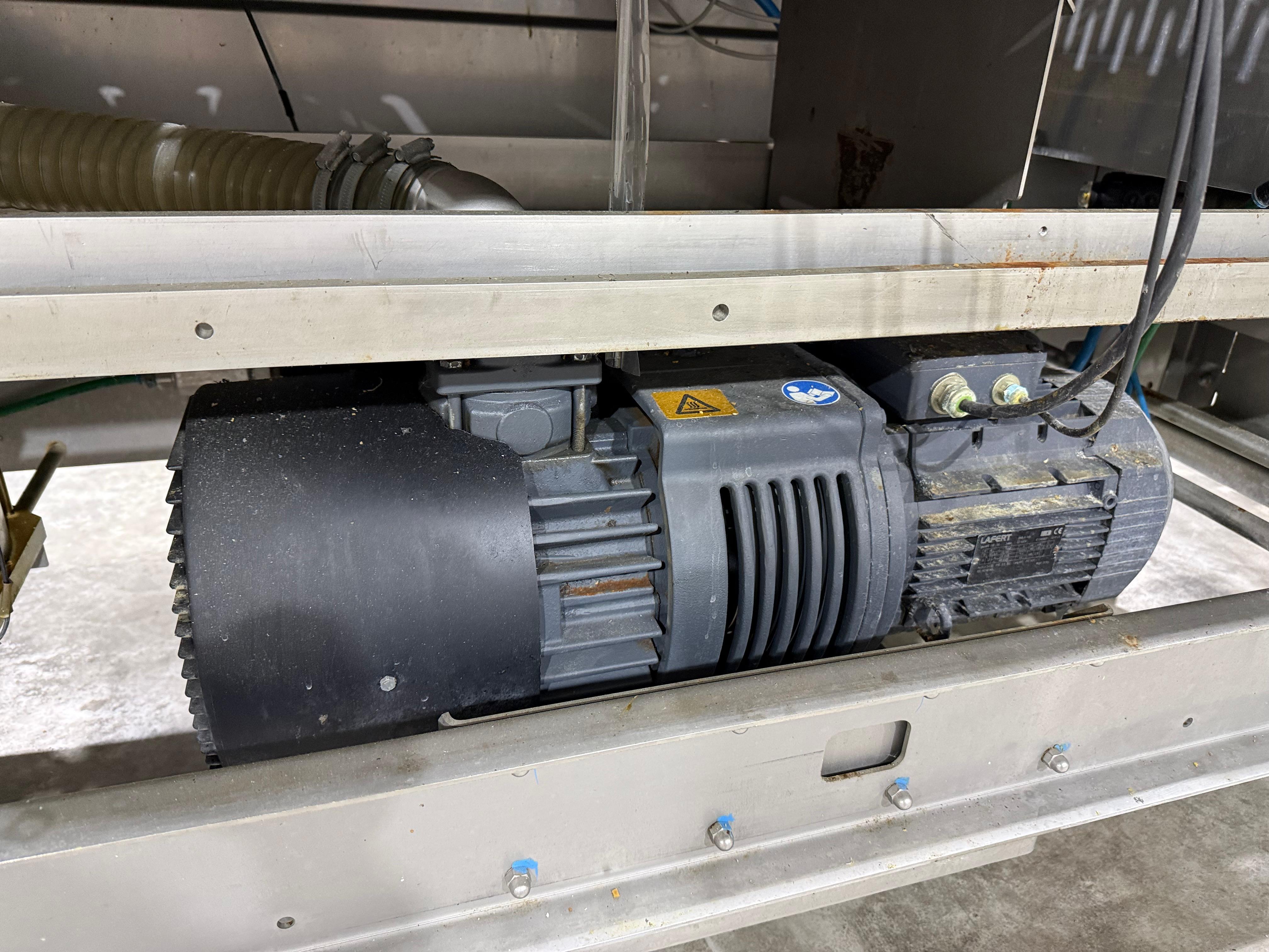 Webomatic thermoformer, type: ML-C 3600, machine number: H6513 ZI151, 400 V, 3 Ph, 50 Hz, 15 kW, dye: (1x) 367 mm x 285 mm, (2x) 285 mm x 178 mm and (3x) 115 mm x 285 mm, Busch vacuum pump, type: RA 0155 A 503, capacity: 155 m³ per hour, Selbach water chiller, type: BK30, total dimensions: 4650 mm x 1200 mm x 1960 mm.