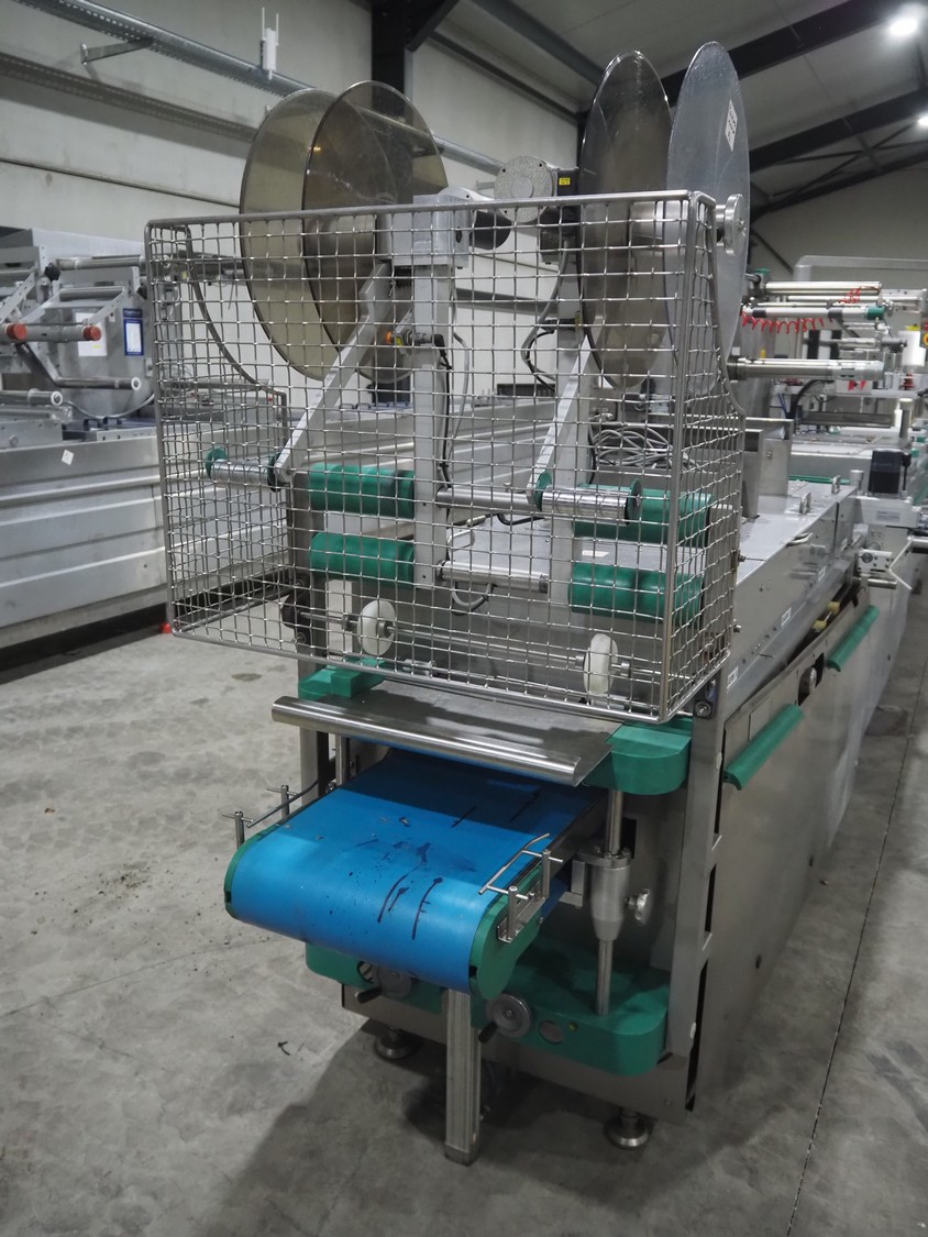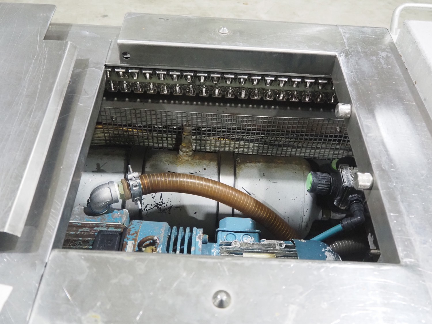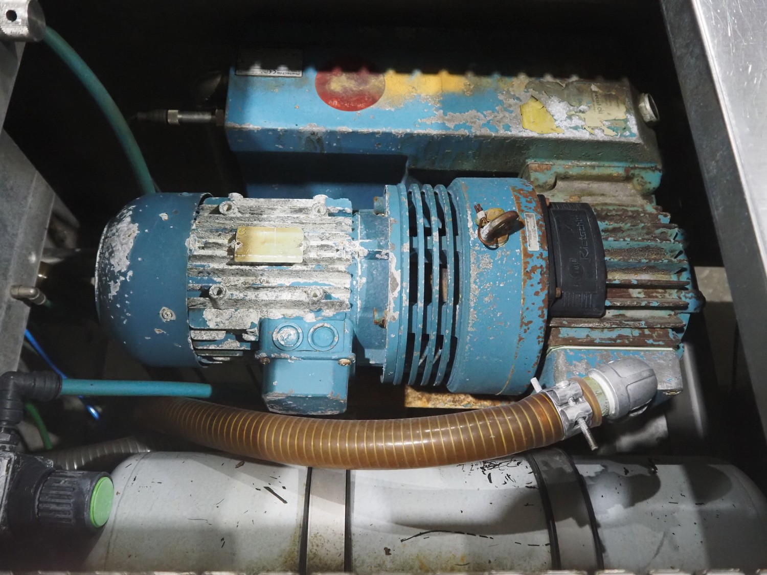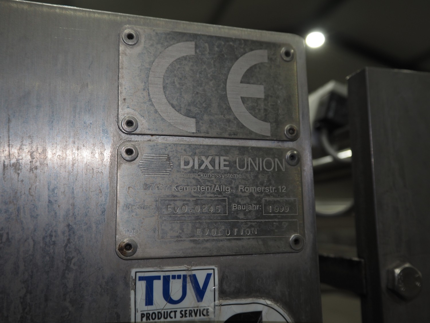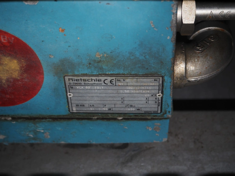 Dixie Union thermoformer, model: EVOLUTION, machine number: EVO.0245, year of construction: 1999, plastic belt, belt width: 380 mm, dye dimensions: (3x) 170 mm x 105 mm x 30 mm, Rietschle vacuum pump, type: VCA 60 (01), year of construction: 1999, capacity: 60 m³/h, total dimensions: 8100 mm x 1300 mm x 1900 mm. Including 2 pallets with parts.