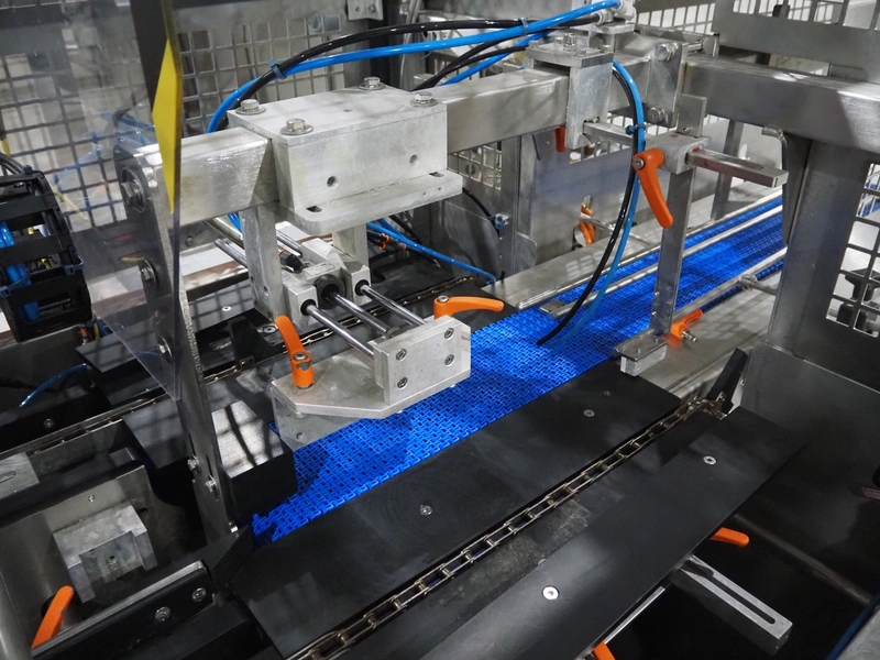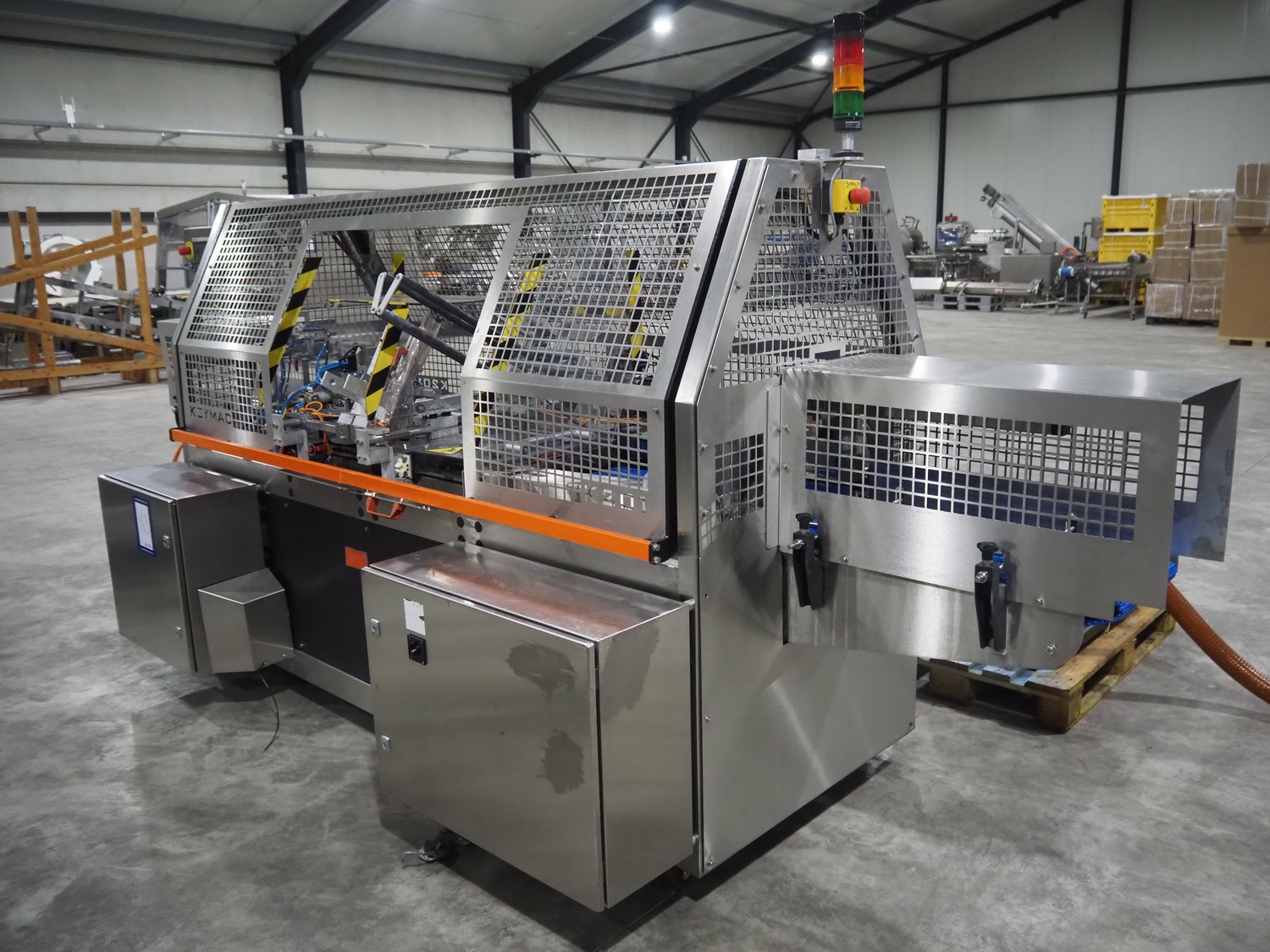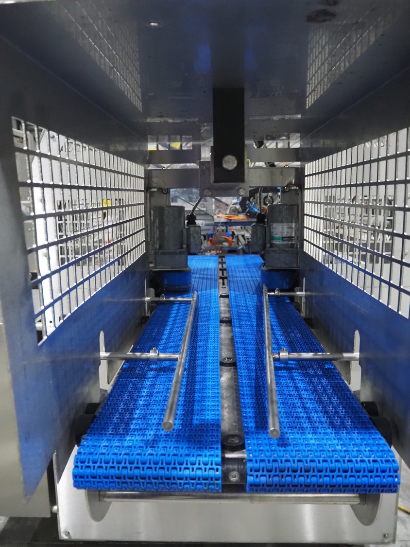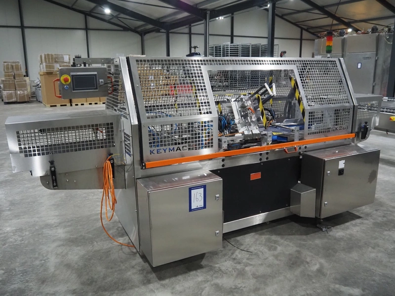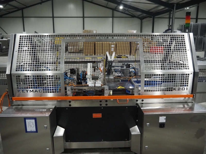 Keymac Packaging Systems case packer, model: K 201, serial number: 74971218G, 230 V, 50 Hz, 1 Ph, dual lane, 120 packs per min, plastic mesh belt, belt width: (3x) 150 mm, total dimensions: 4250 mm x 1350 mm x 2000 mm.