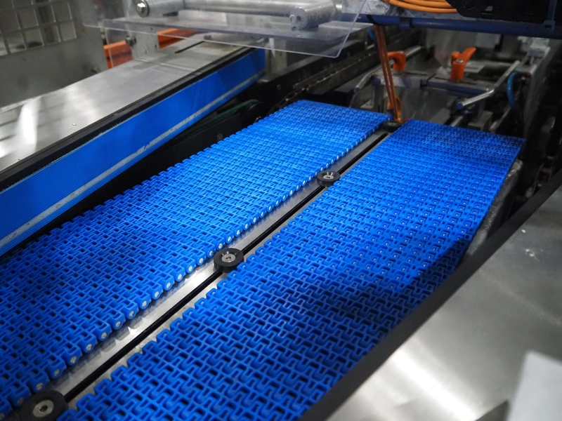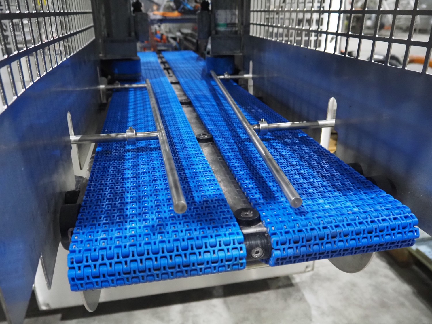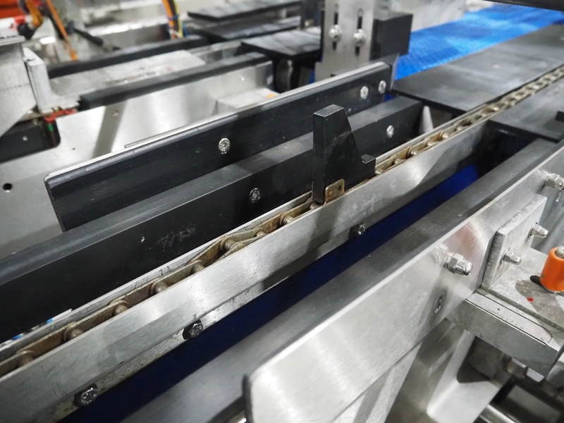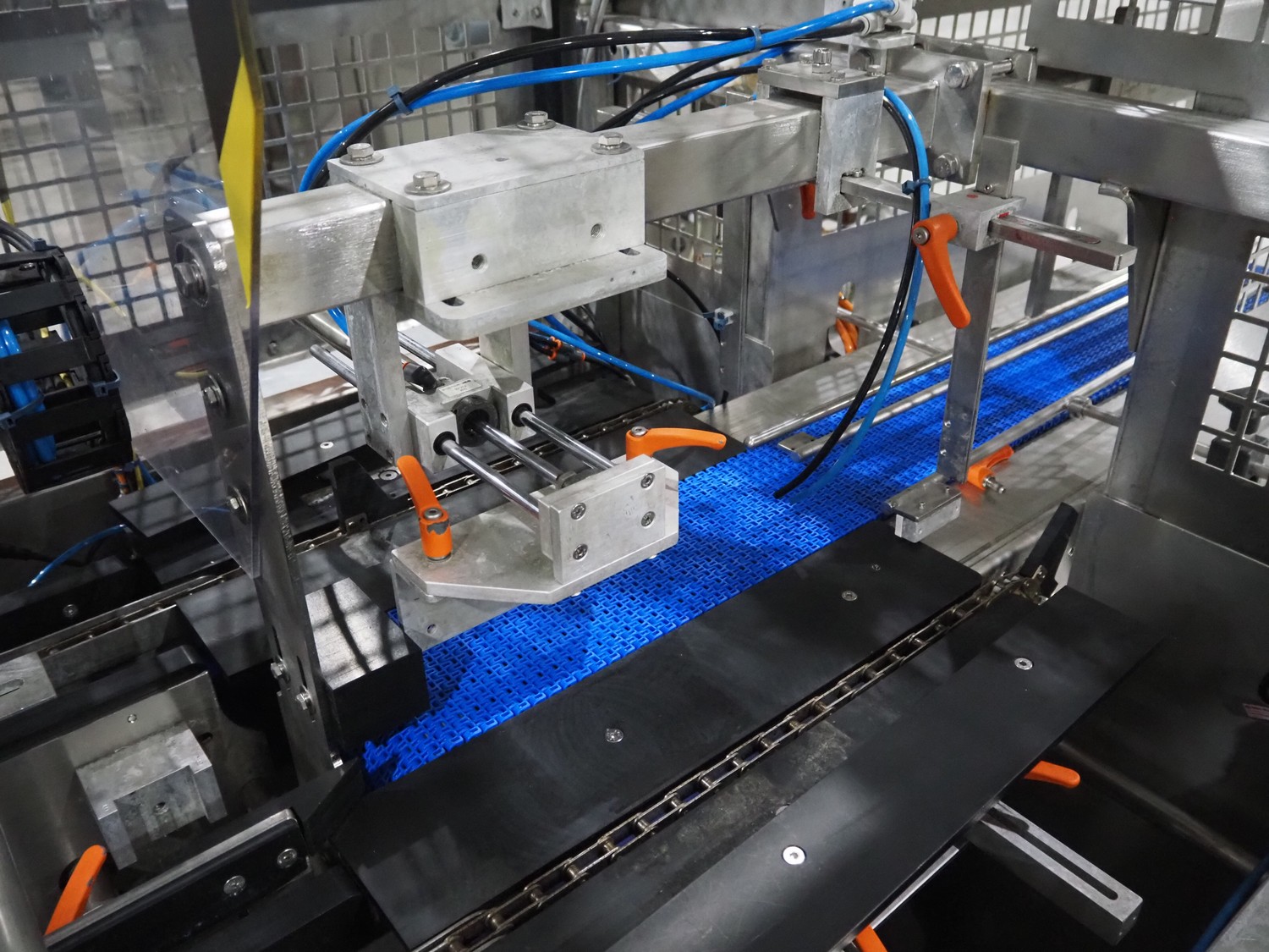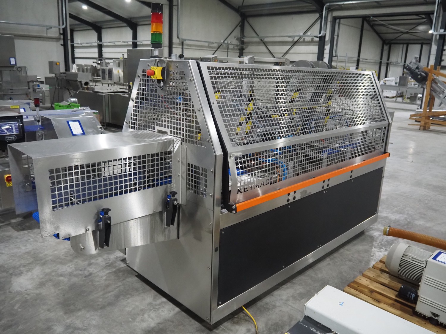 Keymac Packaging Systems case packer, model: K 201, serial number: 74971218G, 230 V, 50 Hz, 1 Ph, dual lane, 120 packs per min, plastic mesh belt, belt width: (3x) 150 mm, total dimensions: 4250 mm x 1350 mm x 2000 mm.