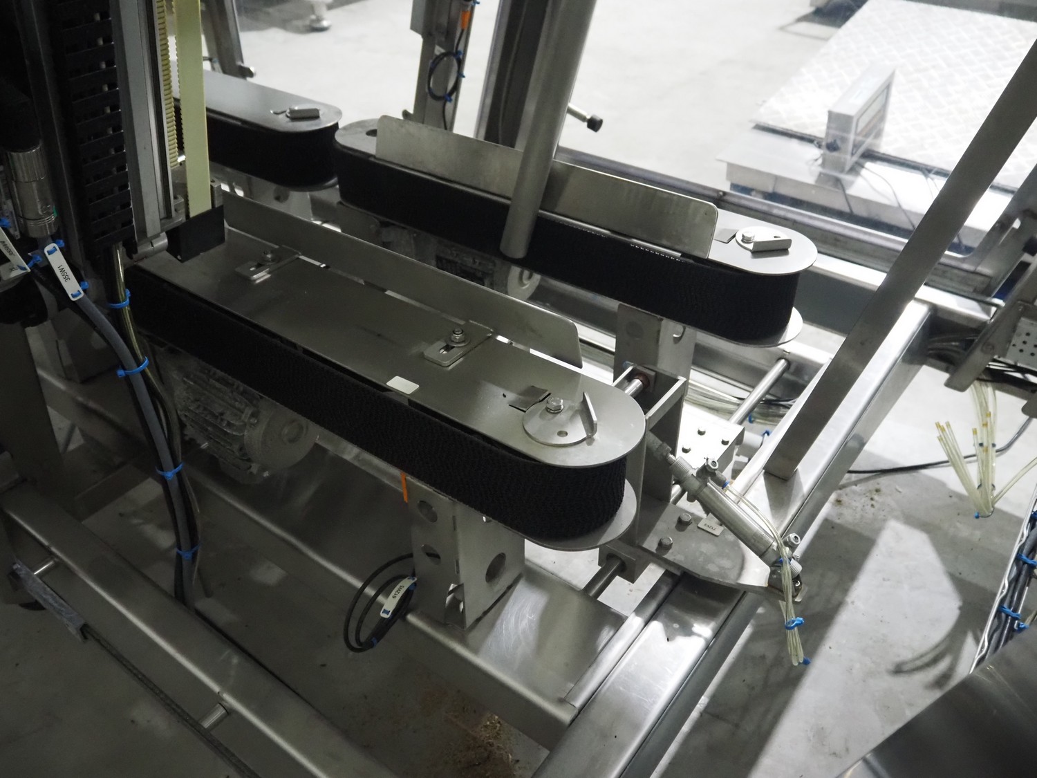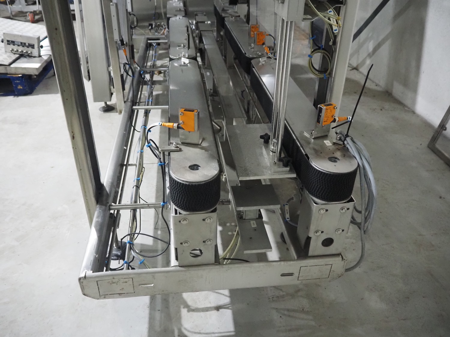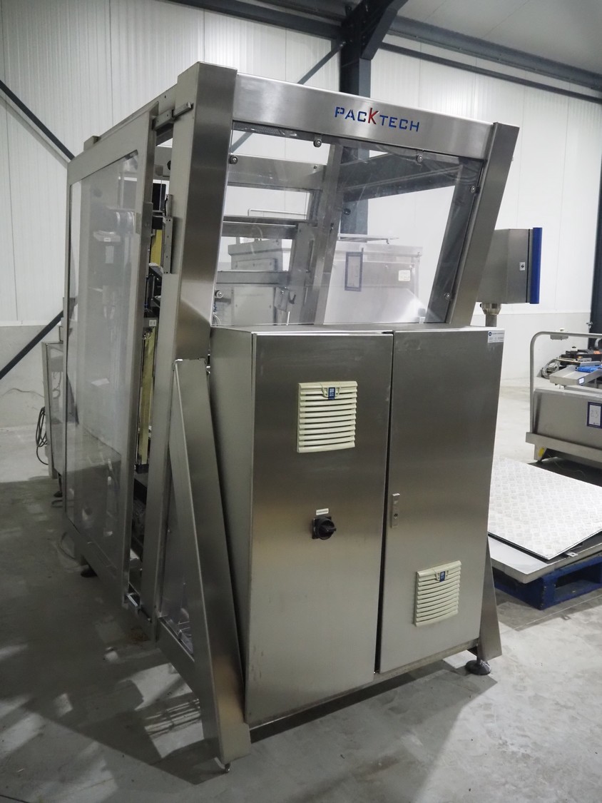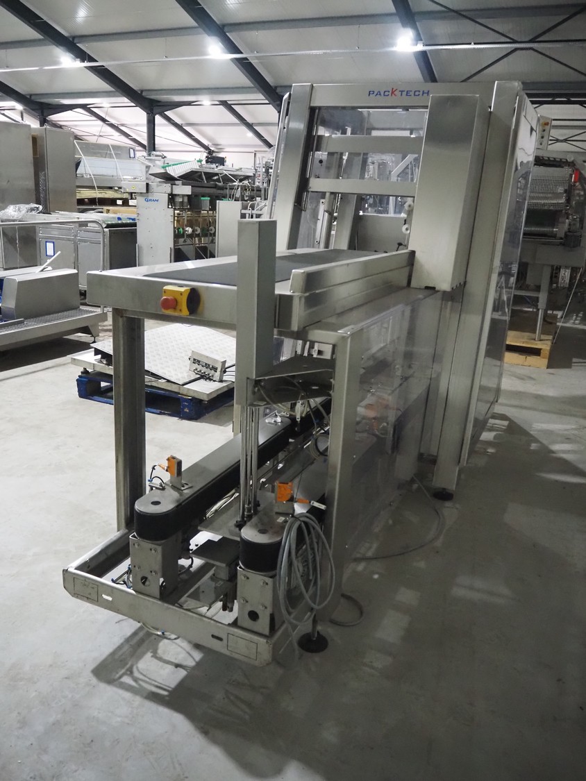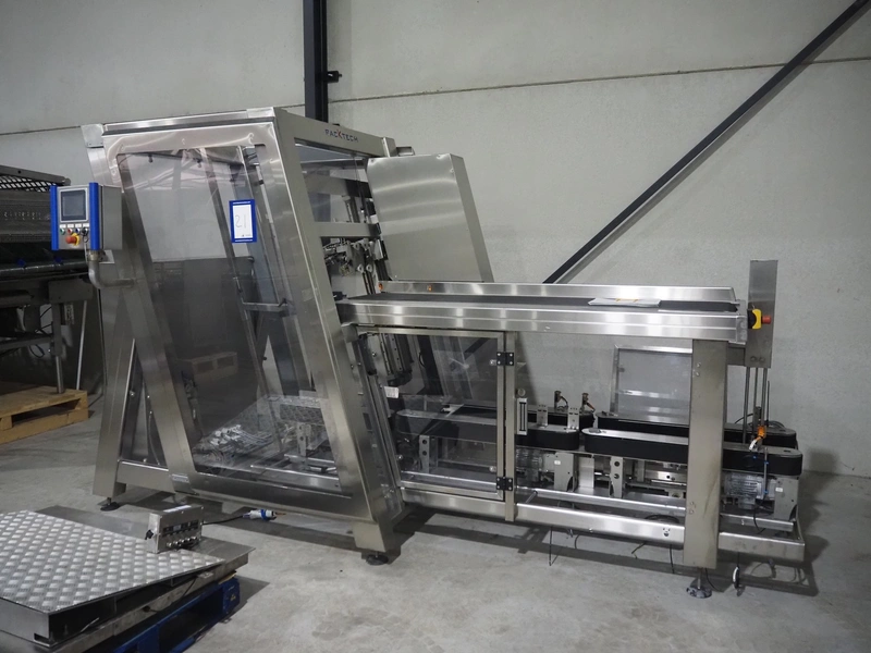 Paktech linear case erector, plastic belt, belt width: 400 mm, clearance: 225 mm, total dimensions: 3700 mm x 1650 mm x 2100 mm.