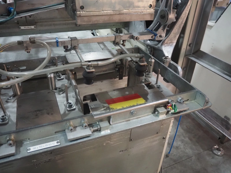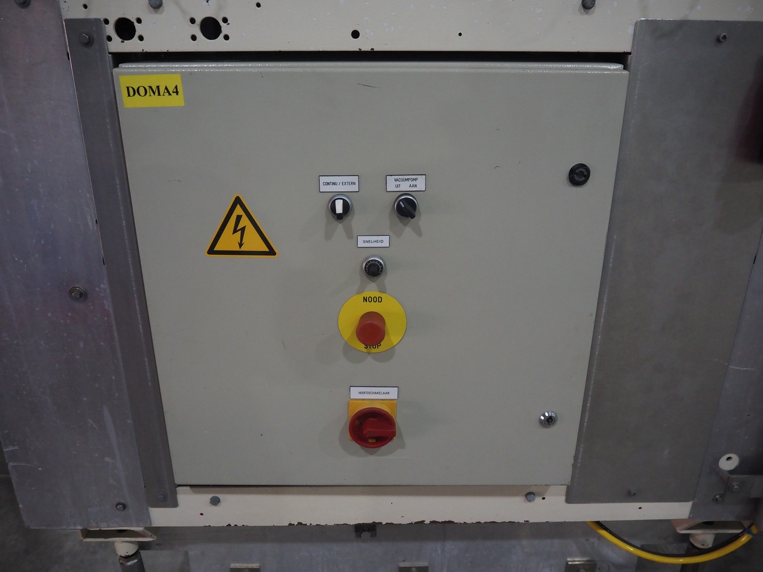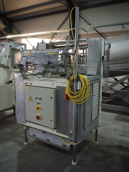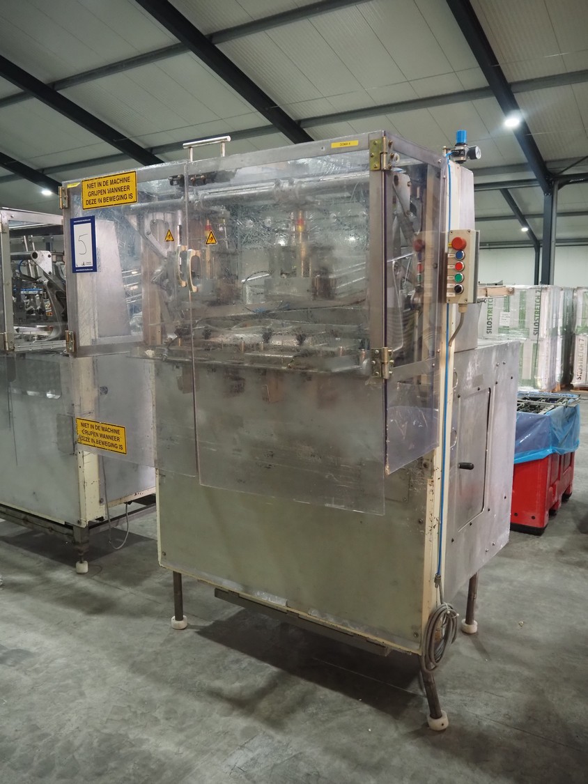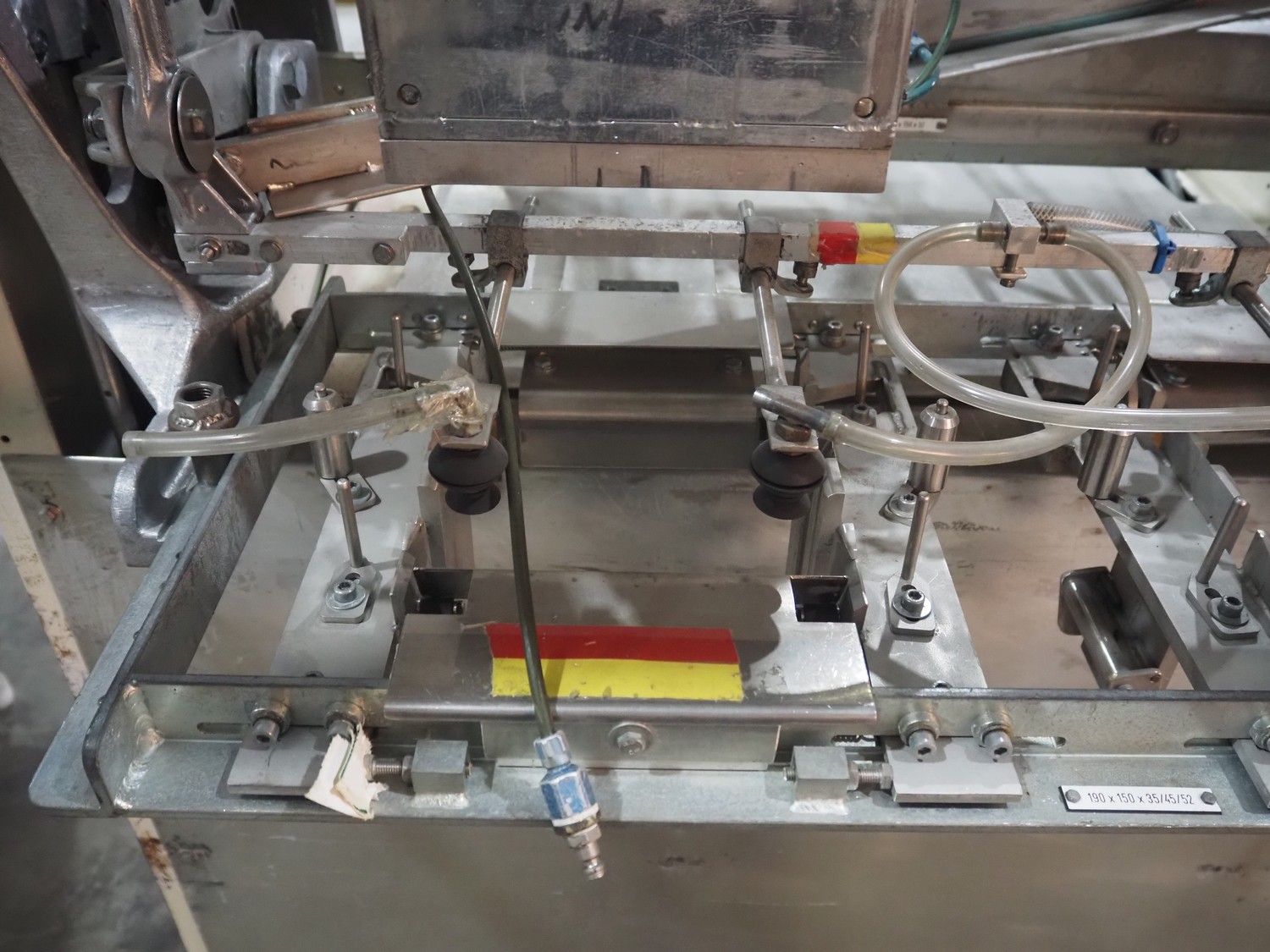 LPF Verpakkingen B.V. carton erector, 2 lanes, dimensions cartons: 150 mm x 98 mm x 30 mm, with Becker vacuum pump, type: BOL/4X, total dimensions: 1500 mm x 1350 mm x 2140 mm. With pallet box with large amount of parts for carton erector, dimensions: 1200 mm x 1000 mm x 1050 mm.