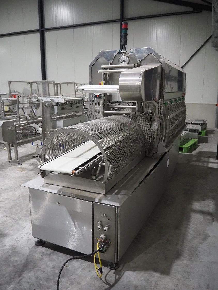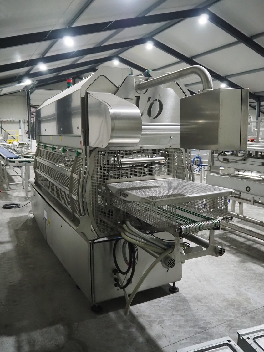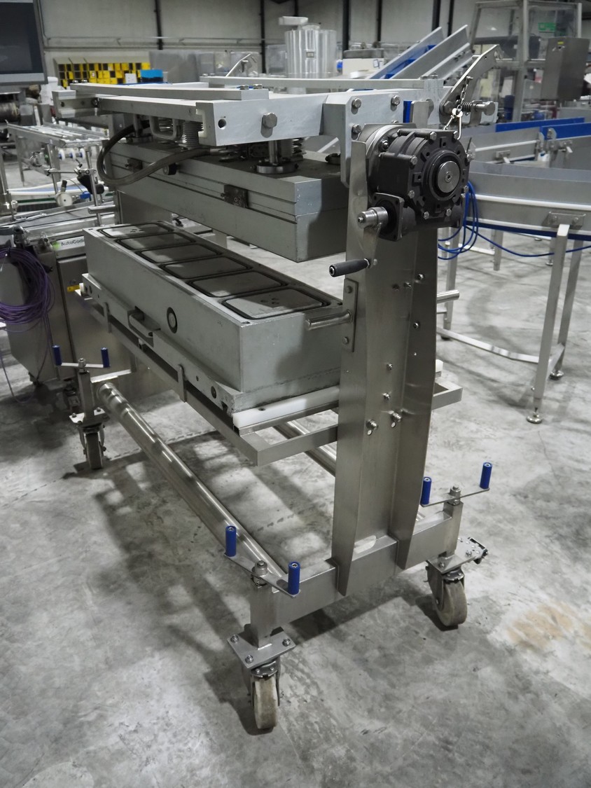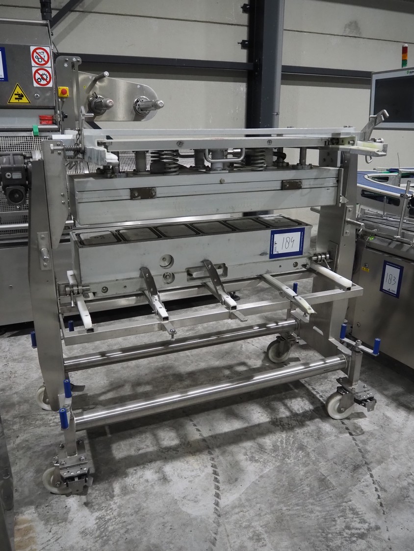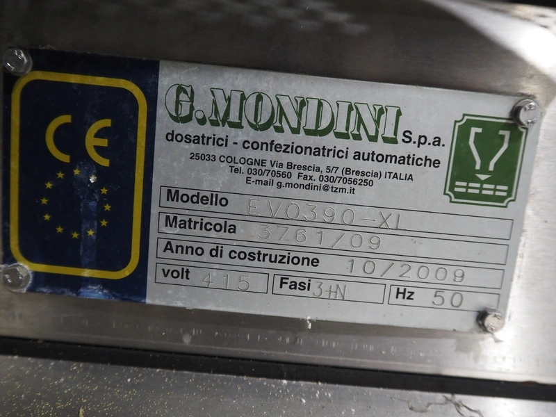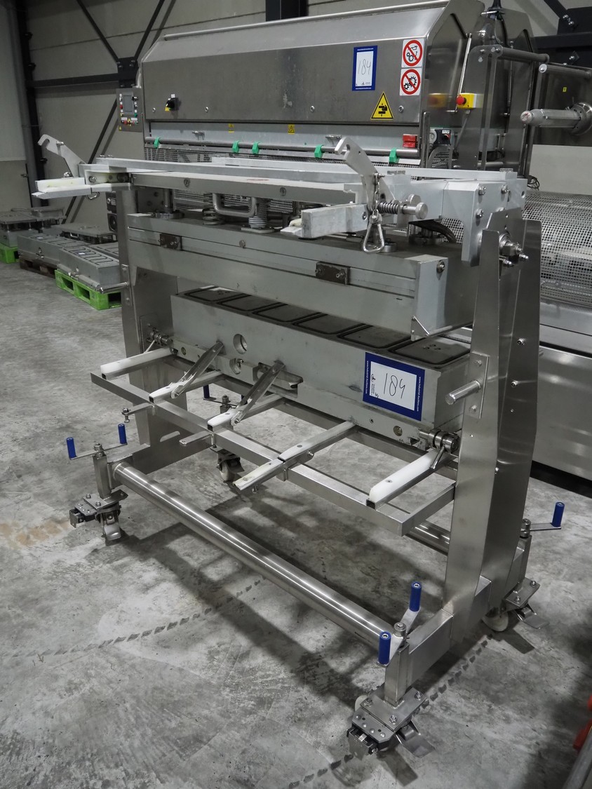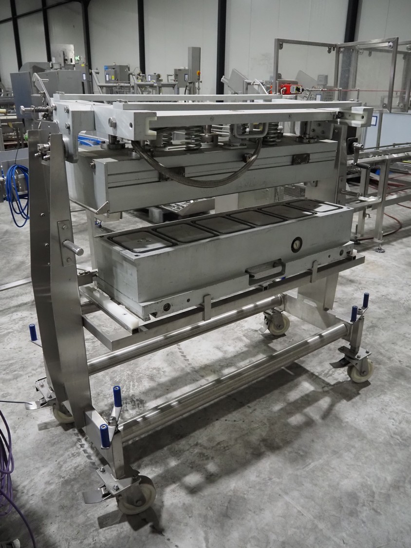 G. Mondini S.p.a. traysealer, model: EVO390-XL, number: 3761/09, year of construction: 10/2009, 415 V, 3 Ph, 50 Hz, infeed chain with dividers, divider height: 20 mm, distance between dividers: 190 mm, plastic belts, belt width: 280 mm, total dimensions: 11900 mm x 1300 mm x 2450 mm. S/s trolley to change dye's, model: CPS/R, number: 3761/09, year of construction: 10/2009, dye: (6x) 202 mm x 153 mm, total dimensions 1650 mm x 900 mm x 1550 mm. Including 3 pallets with dye's, dye: (5x) 255 mm x 161 mm, (5x) 232 mm x 182 mm, (7x) 180 mm x 128 mm. S/s frame for 3 dye sets model: CP/S-3+3, number: 3762/09, year of construction: 10/2009, dimensions: 4200 mm x 750 mm x 1860 mm.