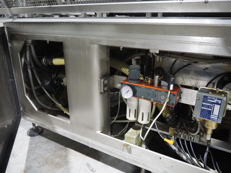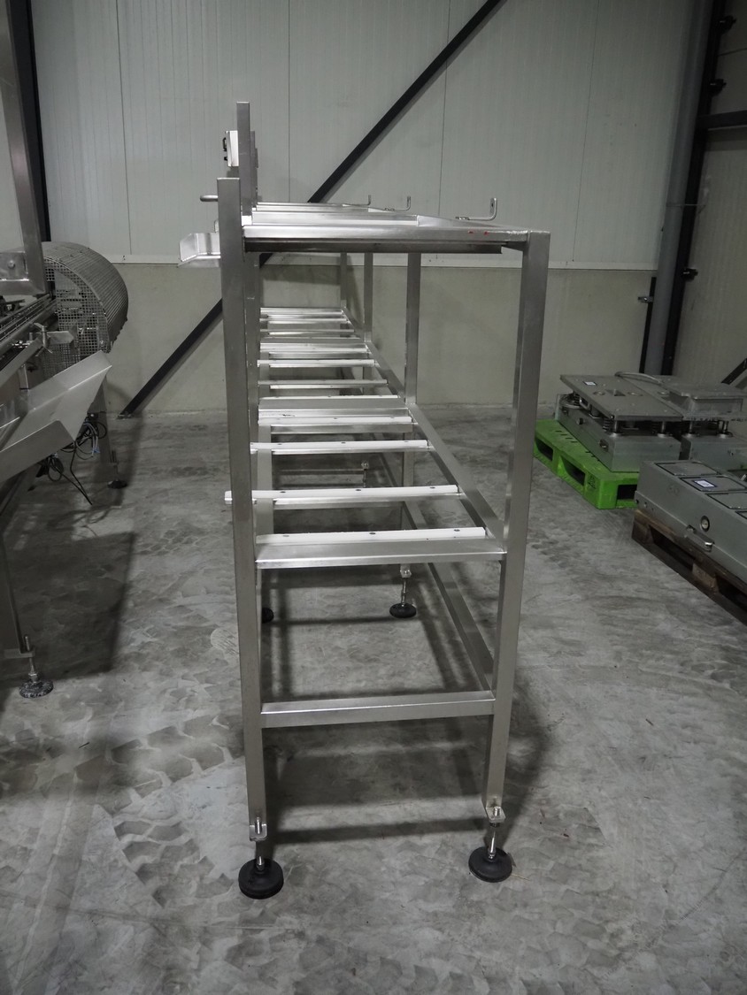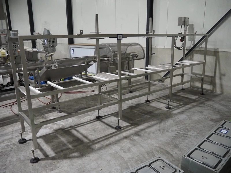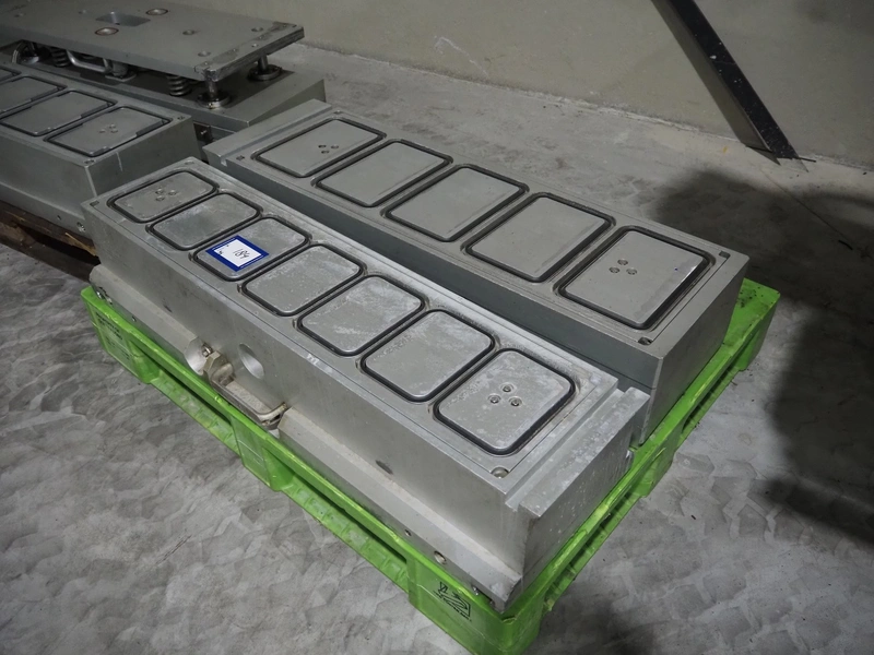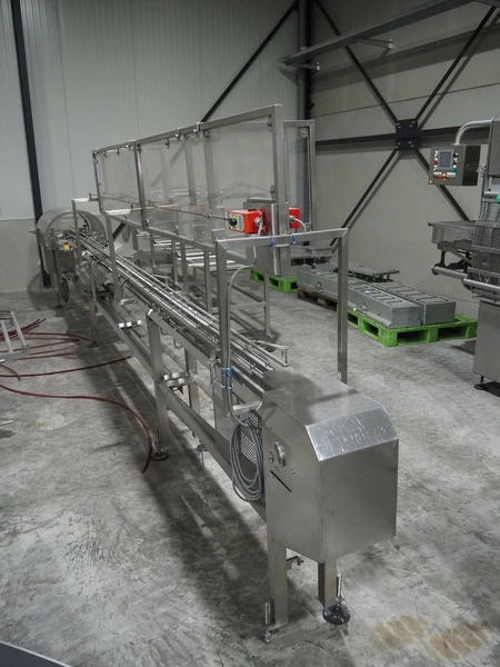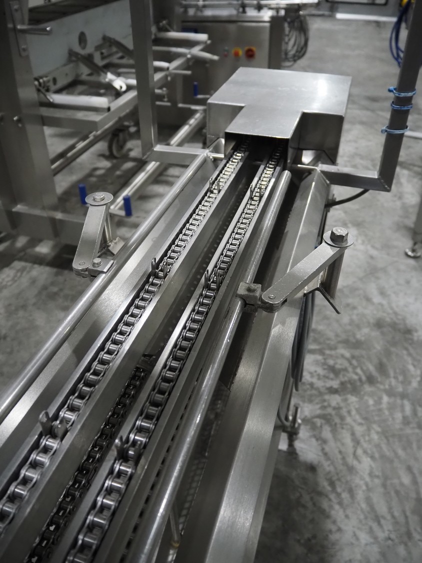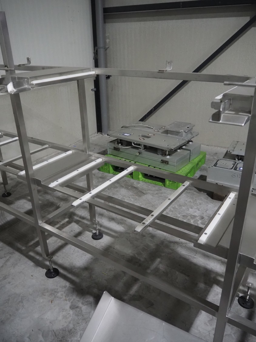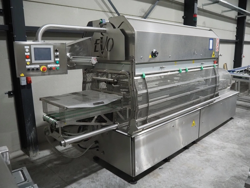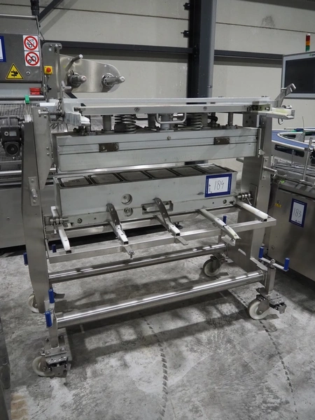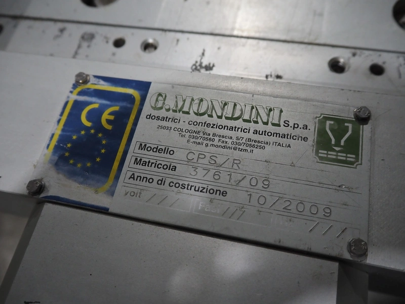 G. Mondini S.p.a. traysealer, model: EVO390-XL, number: 3761/09, year of construction: 10/2009, 415 V, 3 Ph, 50 Hz, infeed chain with dividers, divider height: 20 mm, distance between dividers: 190 mm, plastic belts, belt width: 280 mm, total dimensions: 11900 mm x 1300 mm x 2450 mm. S/s trolley to change dye's, model: CPS/R, number: 3761/09, year of construction: 10/2009, dye: (6x) 202 mm x 153 mm, total dimensions 1650 mm x 900 mm x 1550 mm. Including 3 pallets with dye's, dye: (5x) 255 mm x 161 mm, (5x) 232 mm x 182 mm, (7x) 180 mm x 128 mm. S/s frame for 3 dye sets model: CP/S-3+3, number: 3762/09, year of construction: 10/2009, dimensions: 4200 mm x 750 mm x 1860 mm.