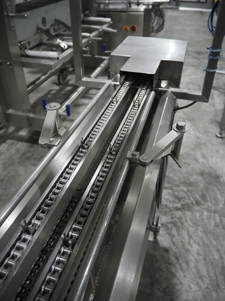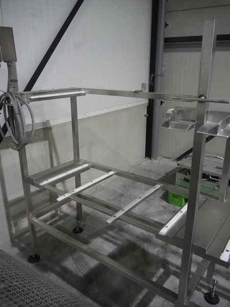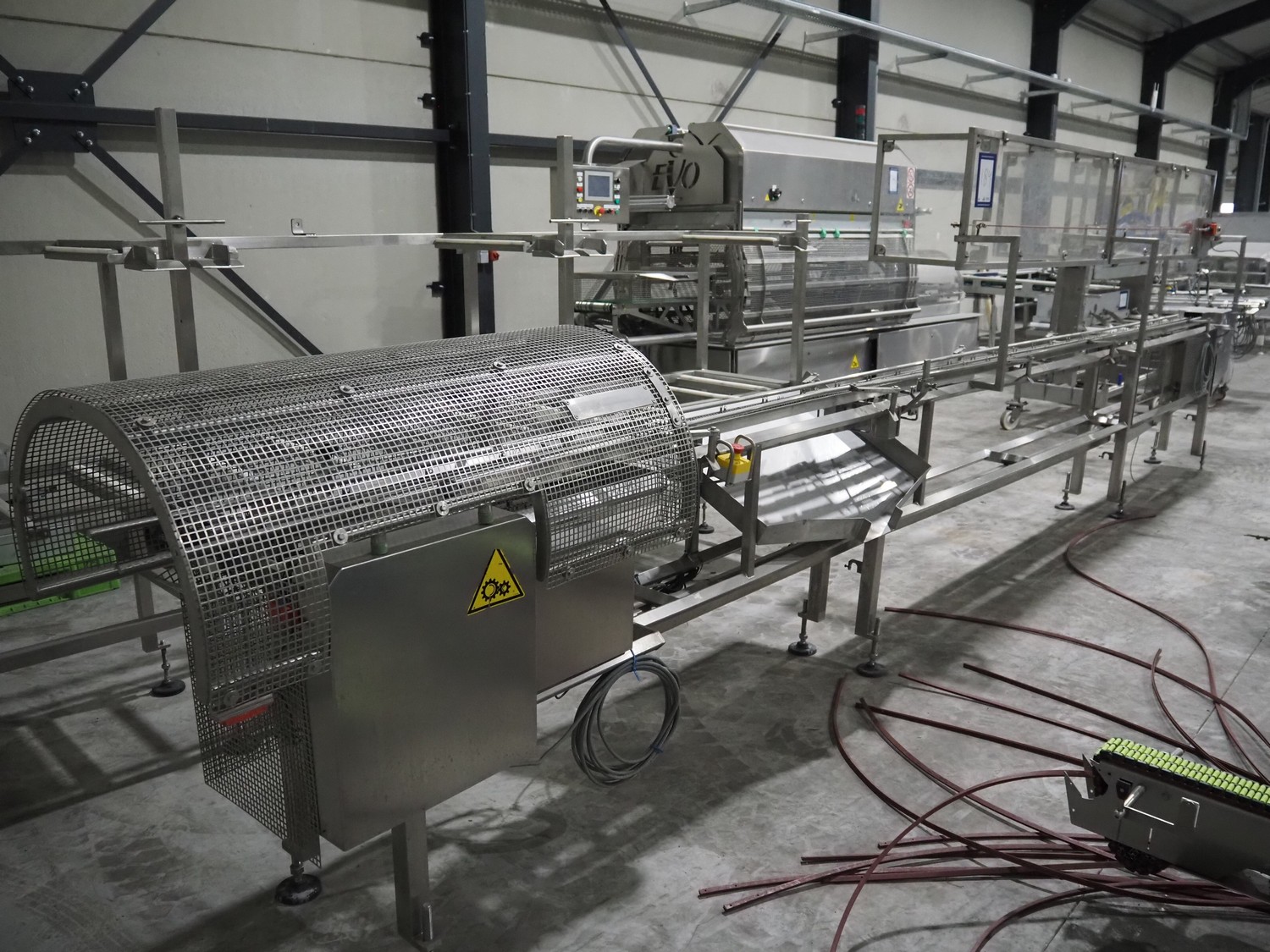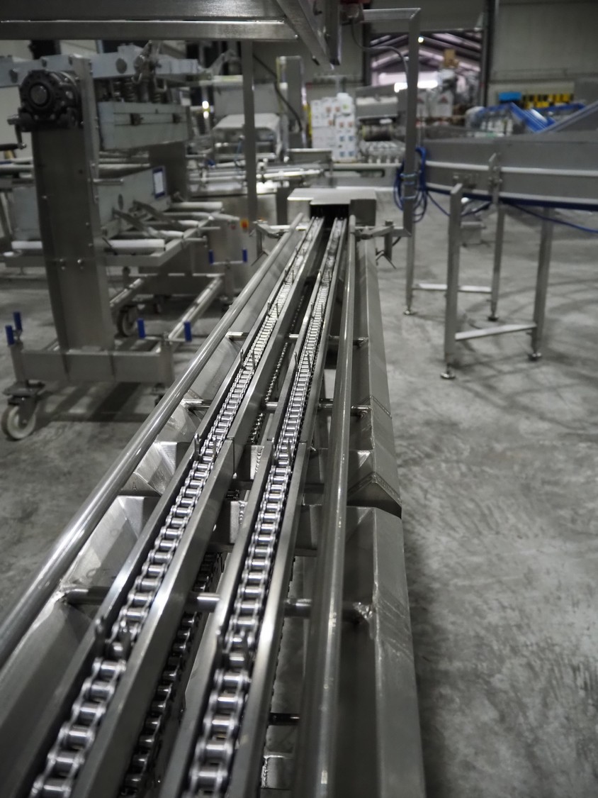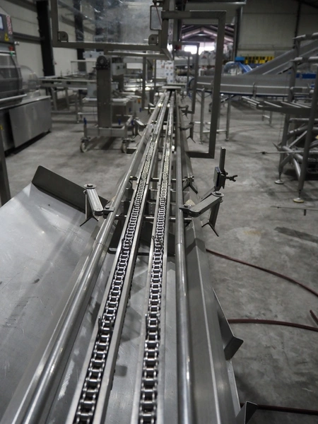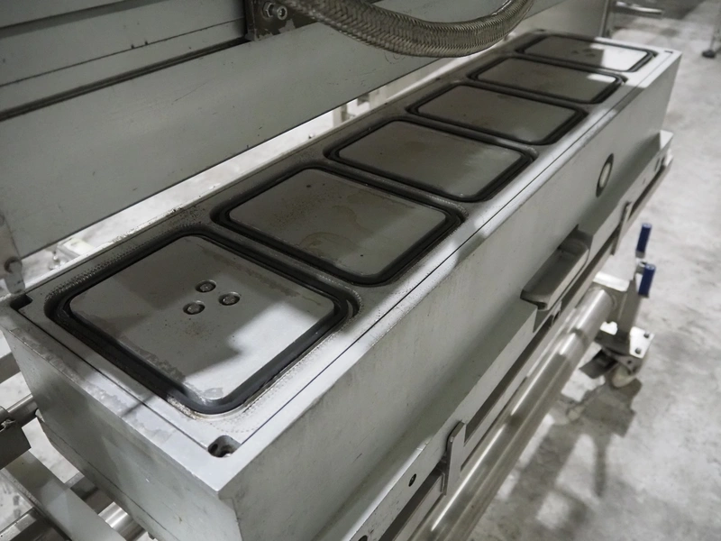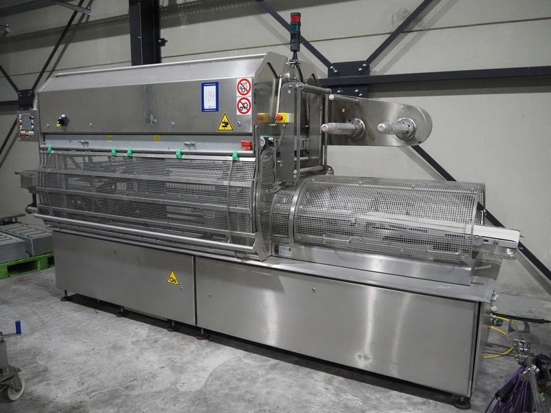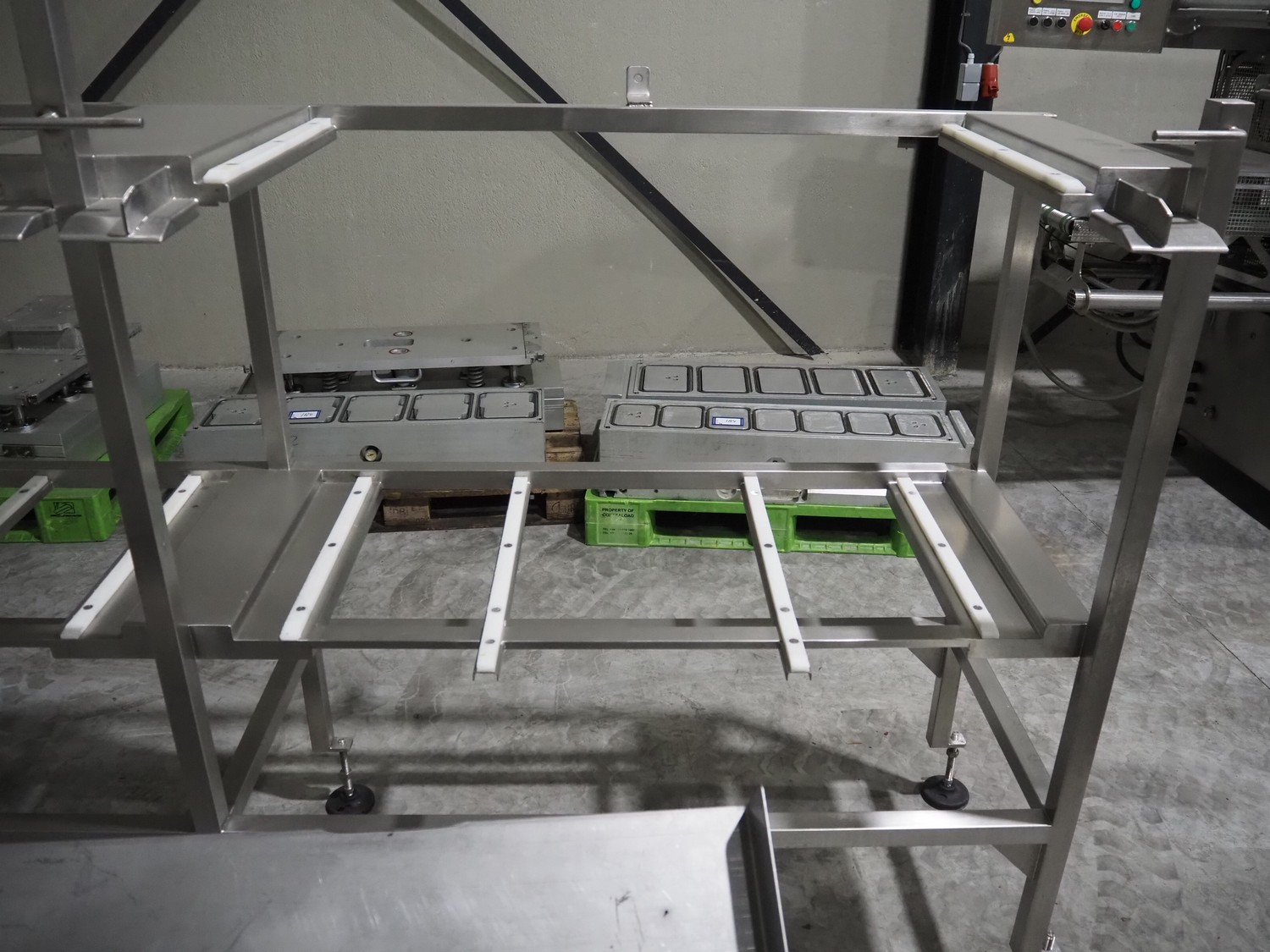 G. Mondini S.p.a. traysealer, model: EVO390-XL, number: 3761/09, year of construction: 10/2009, 415 V, 3 Ph, 50 Hz, infeed chain with dividers, divider height: 20 mm, distance between dividers: 190 mm, plastic belts, belt width: 280 mm, total dimensions: 11900 mm x 1300 mm x 2450 mm. S/s trolley to change dye's, model: CPS/R, number: 3761/09, year of construction: 10/2009, dye: (6x) 202 mm x 153 mm, total dimensions 1650 mm x 900 mm x 1550 mm. Including 3 pallets with dye's, dye: (5x) 255 mm x 161 mm, (5x) 232 mm x 182 mm, (7x) 180 mm x 128 mm. S/s frame for 3 dye sets model: CP/S-3+3, number: 3762/09, year of construction: 10/2009, dimensions: 4200 mm x 750 mm x 1860 mm.